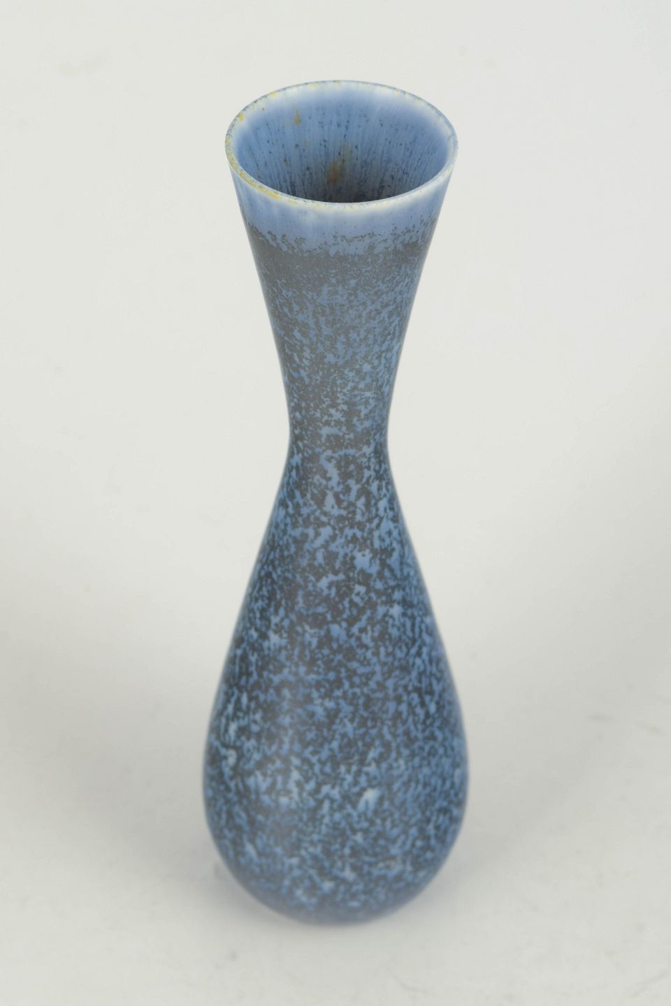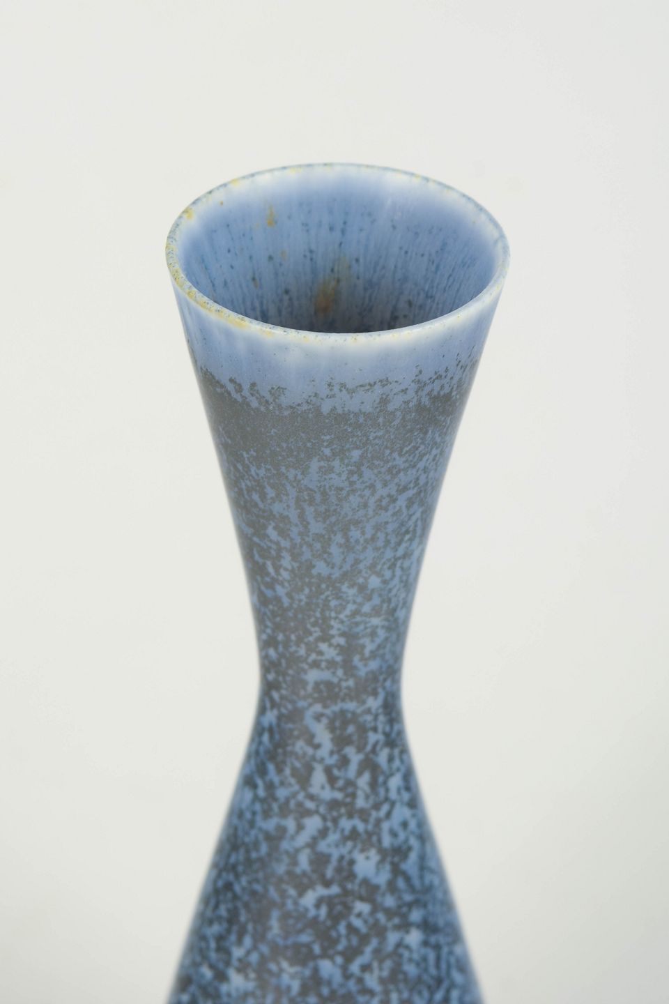Carl-Harry Stålhane for Rörstrand, vase.Slank, organisk formet vase i stentøj med smuk blåmeleret glasur og let indsnævret hals. Et karakteristisk eksempel på Stålhane’s arbejde med enkle former og levende glasurer.