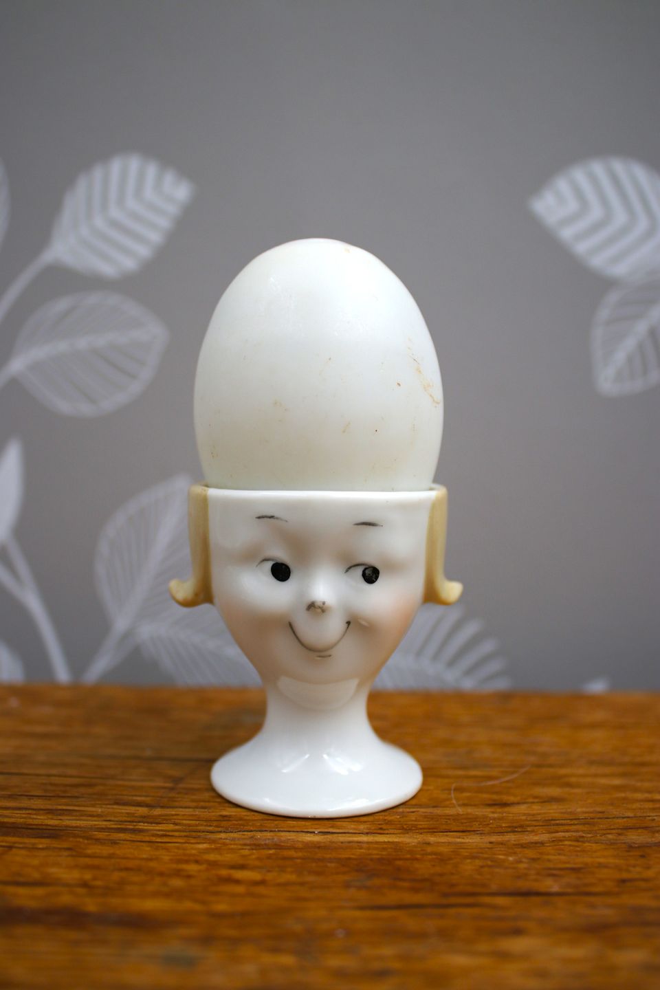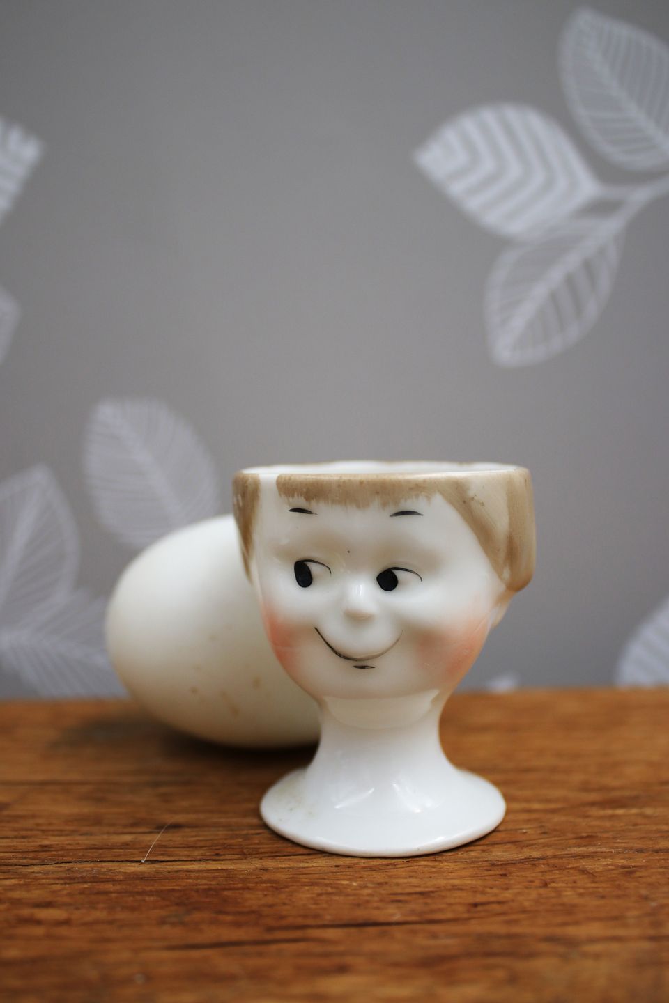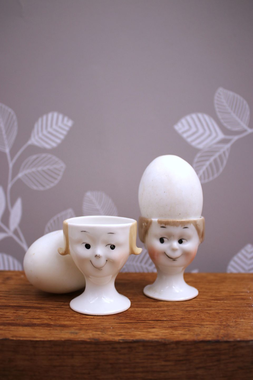 Gamle æggebægre fra 30érne i porcelæn med bemalet sjove ansigter.