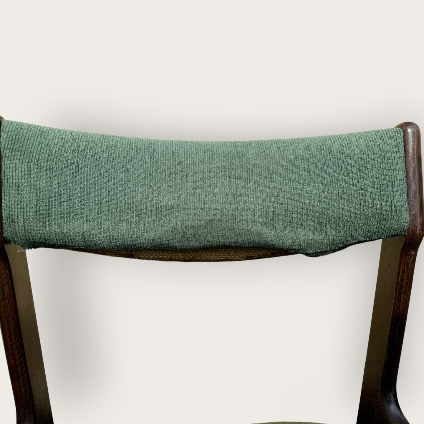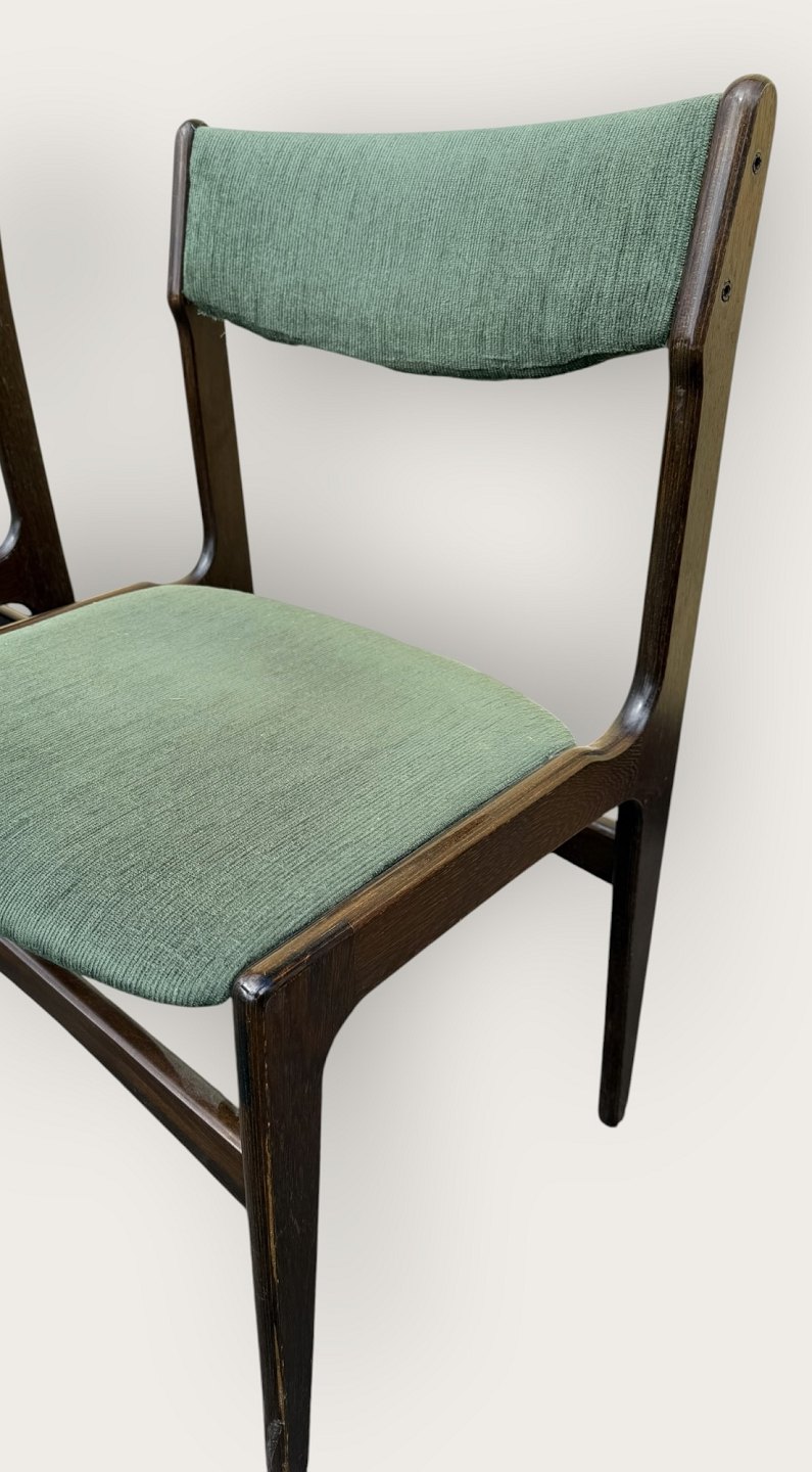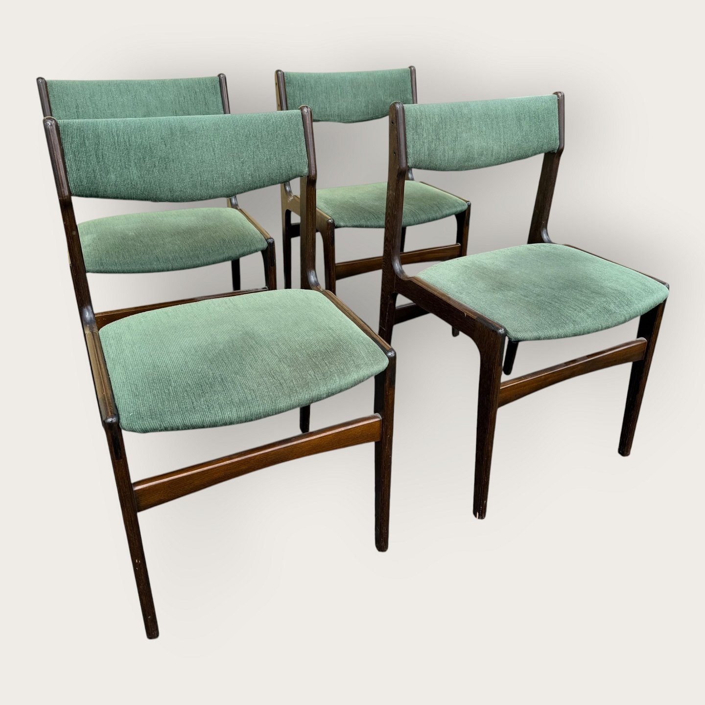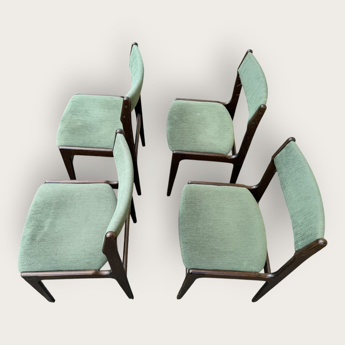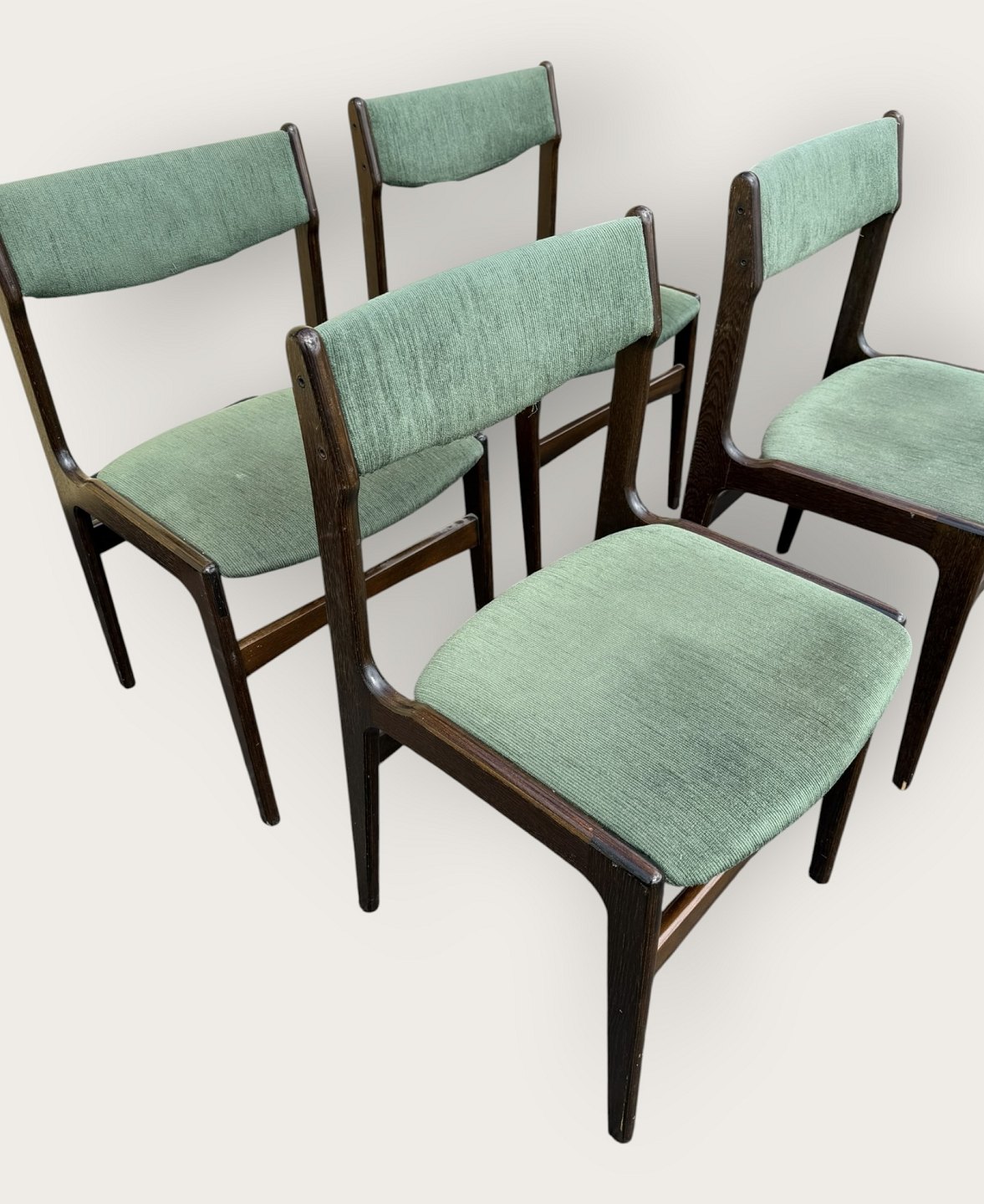 4 Stühle aus dunkel gebeiztem Holz, dänisch modern aus den 1960er Jahren, die Stühle sind stabil und in gutem gebrauchten Zustand, aber der Bezug ist fleckig/locker.Lager: 1