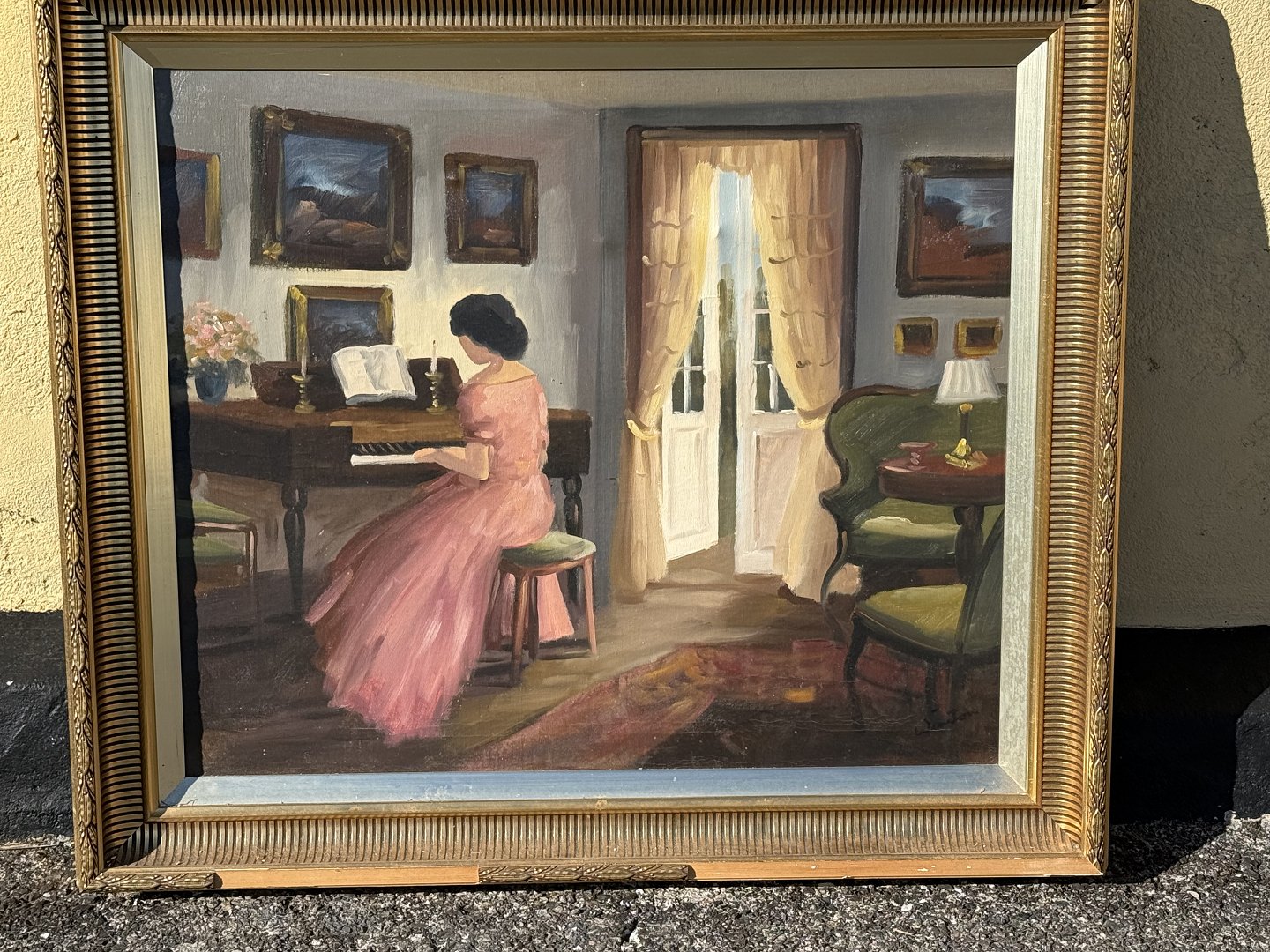 Frau im rosa Kleid am Klavier, Ölgemälde auf Leinwand, undeutlich signiert *hat einige Absplitterungen am Rahmen, ansonsten in gutem Zustand*Lager: 1