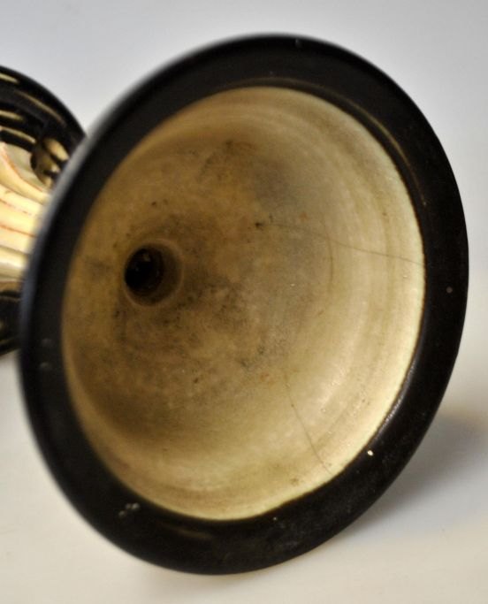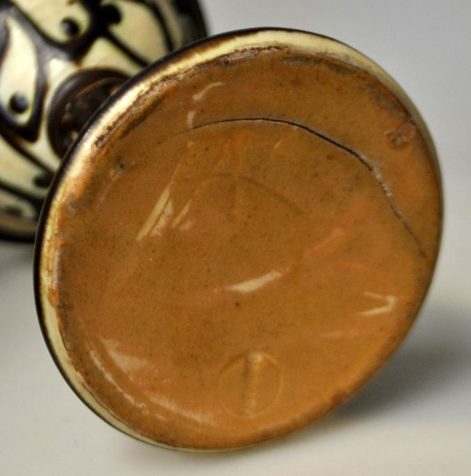 Herman A. Kähler: Kalk. Roter Ton mit braunen und hellen Glasuren. Hornmalerei. Mit geriffeltem Stiel. Signiert: HAK Danmark. Durchmesser: 11,8 cm. Höhe: 17,3 cm.Mit minimalen Haarrissen in der Glasur.
