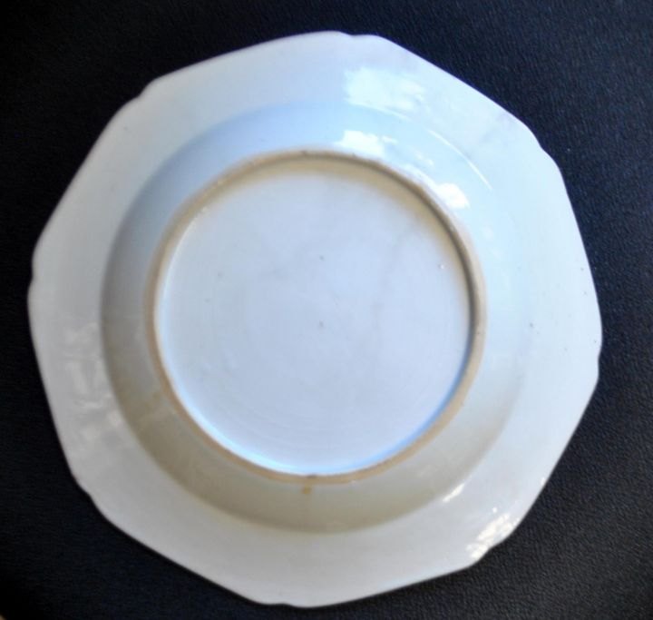 Chinesischer blau-weißer Teller, 18. Jahrhundert. Chien-Lung. Achteckig. Handbemalte Landschafts- und Blumenmotive. Durchmesser: 22 cm.Einwandfreier Zustand!