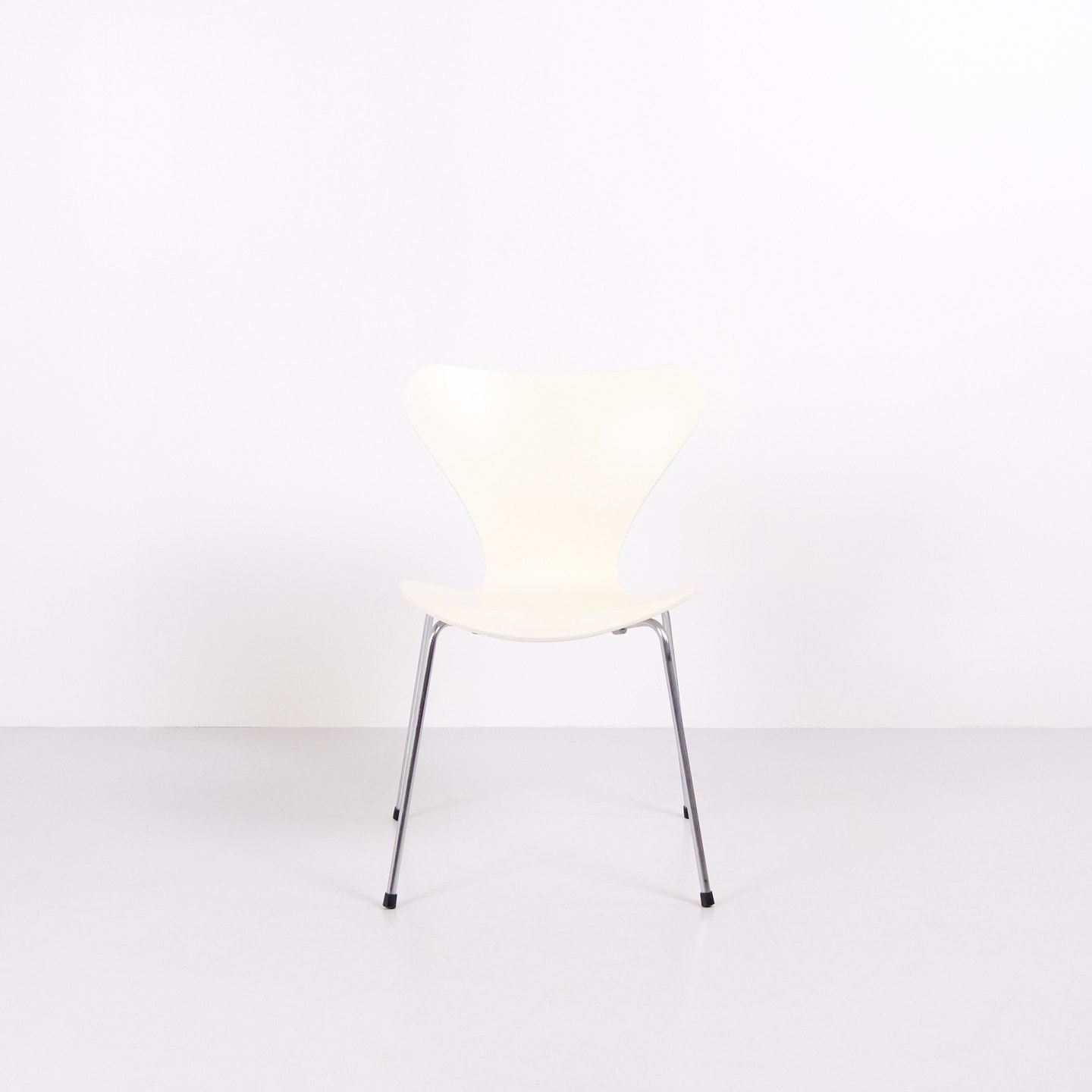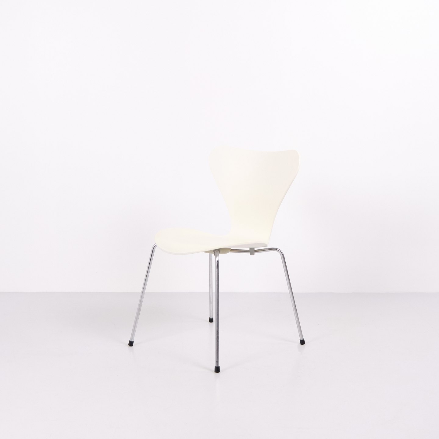 Satz von 6 Serie 7 Stühlen Modell 3107, entworfen von Arne Jacobsen für Fritz Hansen. Das Modell wurde 1955 als Weiterentwicklung des Ameisenstuhls von 1952 eingeführt. Gefertigt aus formgepresstem Furnier mit weiß lackierter Oberfläche und verchromtem Stahlrohrgestell. Die charakteristische Sieben-Form machte das Modell zu einem der meistproduzierten Stühle der dänischen Designgeschichte. Modell 3107 wurde weltweit in Privathäusern, Restaurants, Büros und öffentlichen Einrichtungen eingesetzt und wird weiterhin von Fritz Hansen produziert. Wird nur als komplettes Set verkauft.— Herkunft: Dänemark
