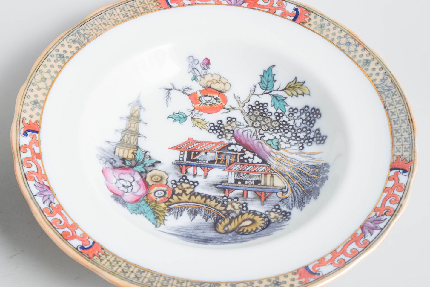 Rörstrand "Japan", sæt af syv dybe tallerkener.Dybe tallerkener i fajance med orientalsk inspireret dekoration i polykrome farver og detaljerig bemaling i japansk stil, karakteristisk for Rörstrands japanismeproduktion fra begyndelsen af 1900-tallet.