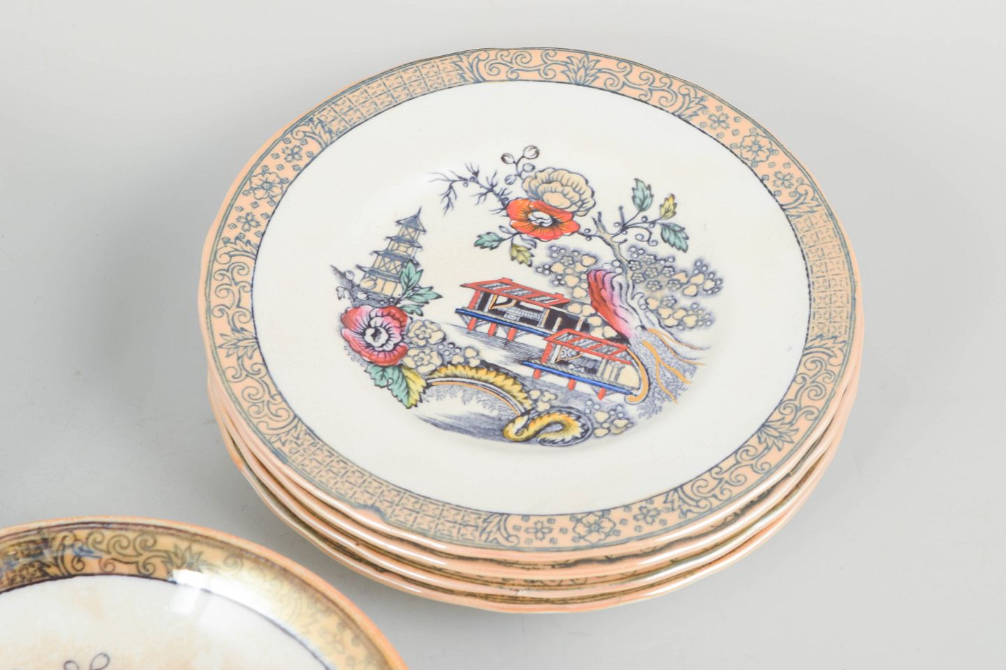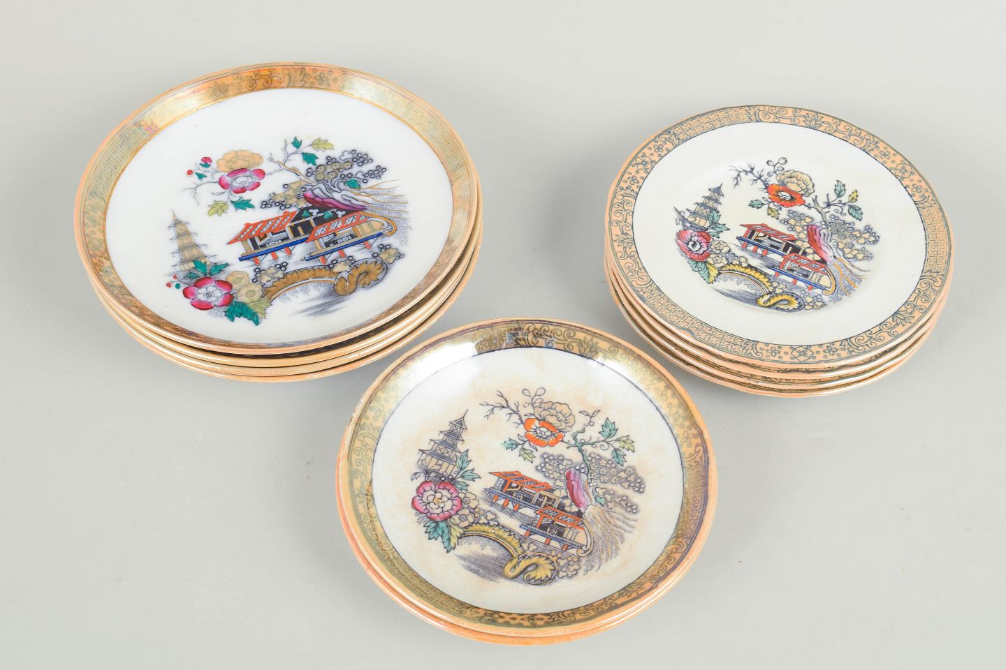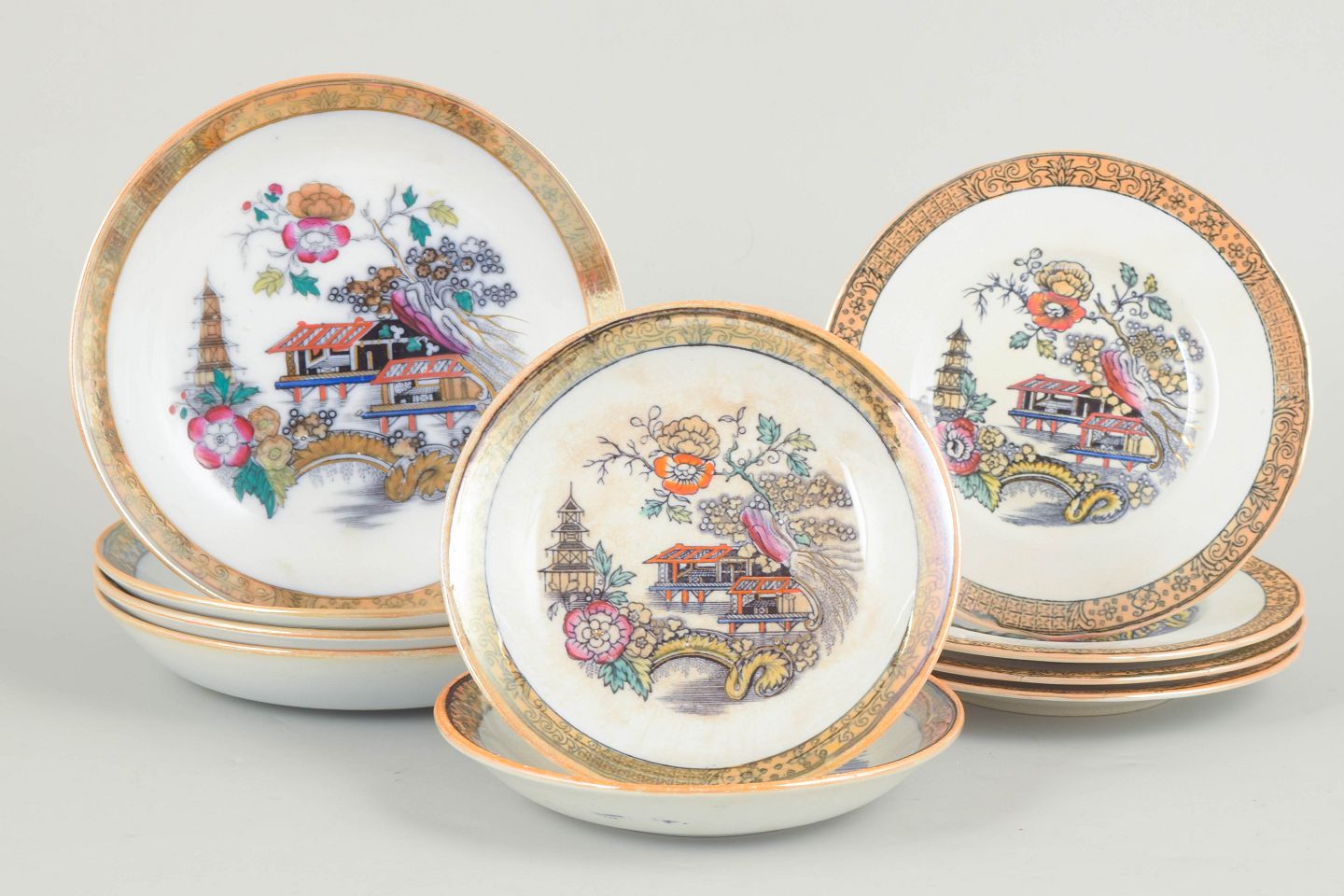 Rörstrand "Japan", sæt af ti flade og dybe tallerkener.Flade og dybe tallerkener i fajance med orientalsk inspireret dekoration i polykrome farver og detaljerig bemaling i japansk stil, karakteristisk for Rörstrands japanismeproduktion fra begyndelsen af 1900-tallet.
