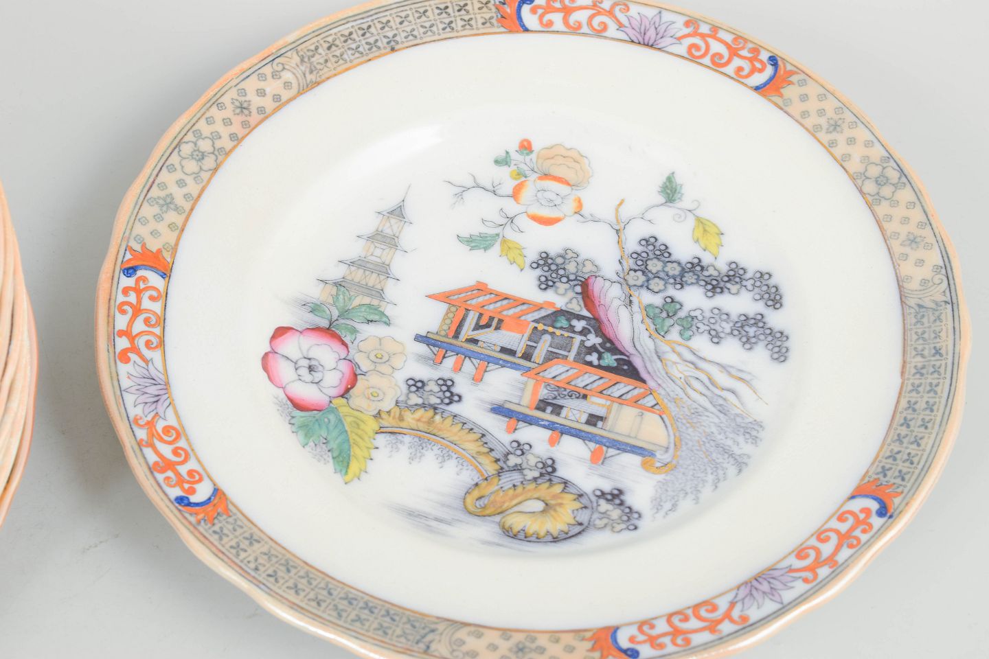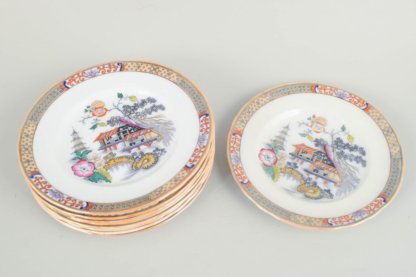 Rörstrand "Japan", sæt af ni frokosttallerkener.Frokosttallerkener i fajance med orientalsk inspireret dekoration i polykrome farver og detaljerig bemaling i japansk stil, karakteristisk for Rörstrands japanismeproduktion fra begyndelsen af 1900-tallet.