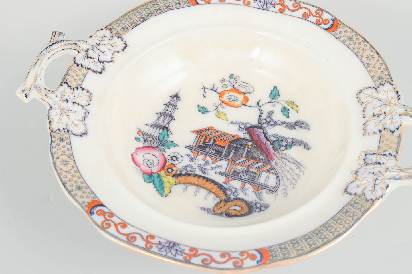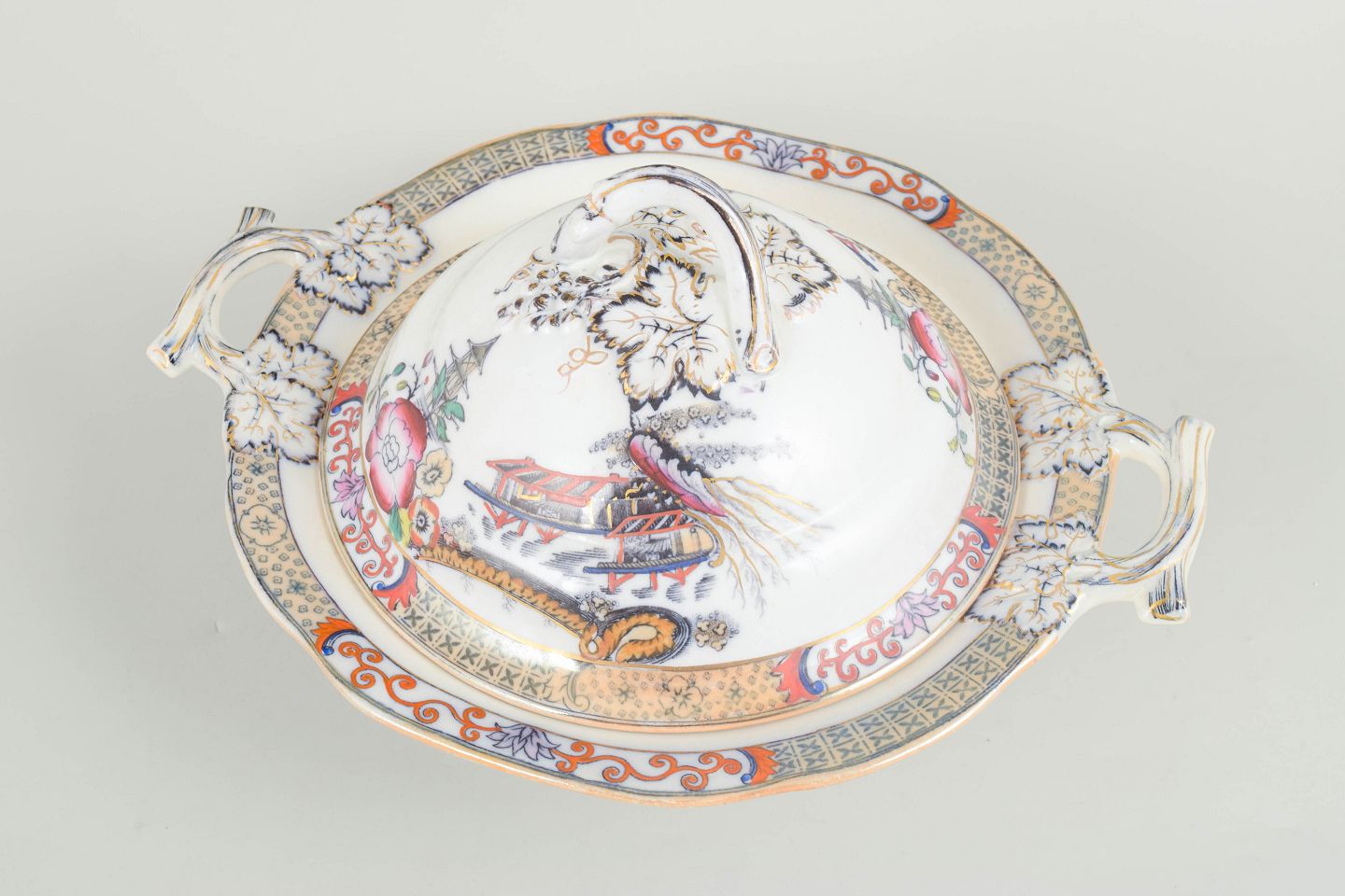 Rörstrand Japan-serie, terrin med låg.Terrin i fajance med orientalsk inspireret dekoration i polykrome farver og detaljerig bemaling i japansk stil, karakteristisk for Rörstrands japanismeproduktion fra begyndelsen af 1900-tallet.