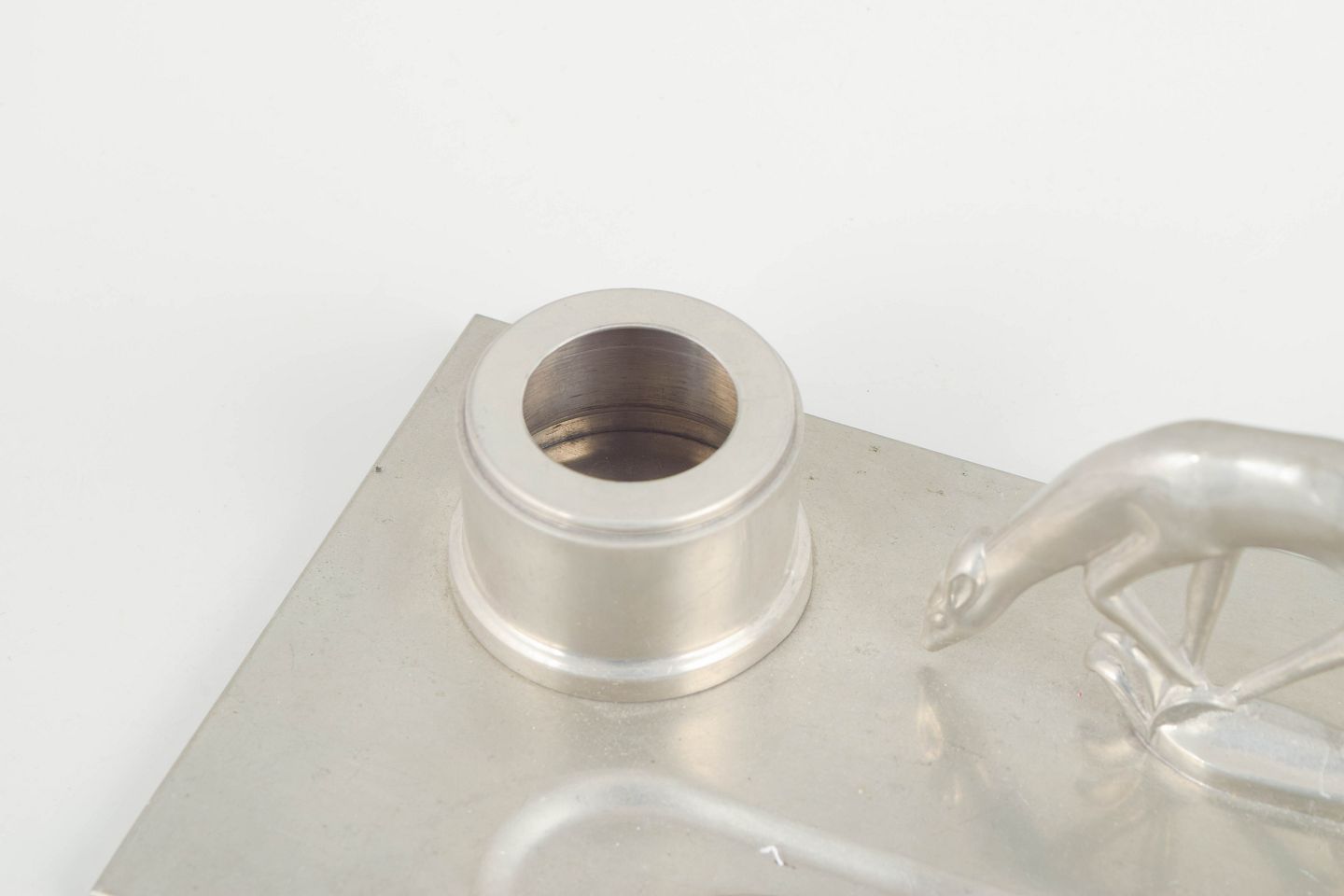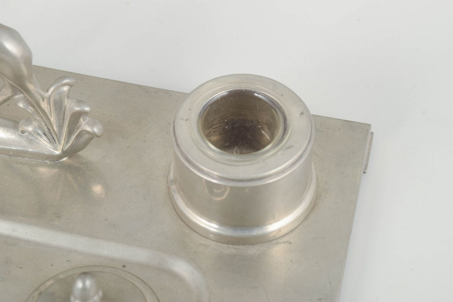 Carl Einar Borgström for Ystad Tenn, blækhus i tin.Rektangulært blækhus i tin med to beholdere og dekorativ hjortefigur i midten. Den ene glasindsats mangler. Stemplet under bunden.
