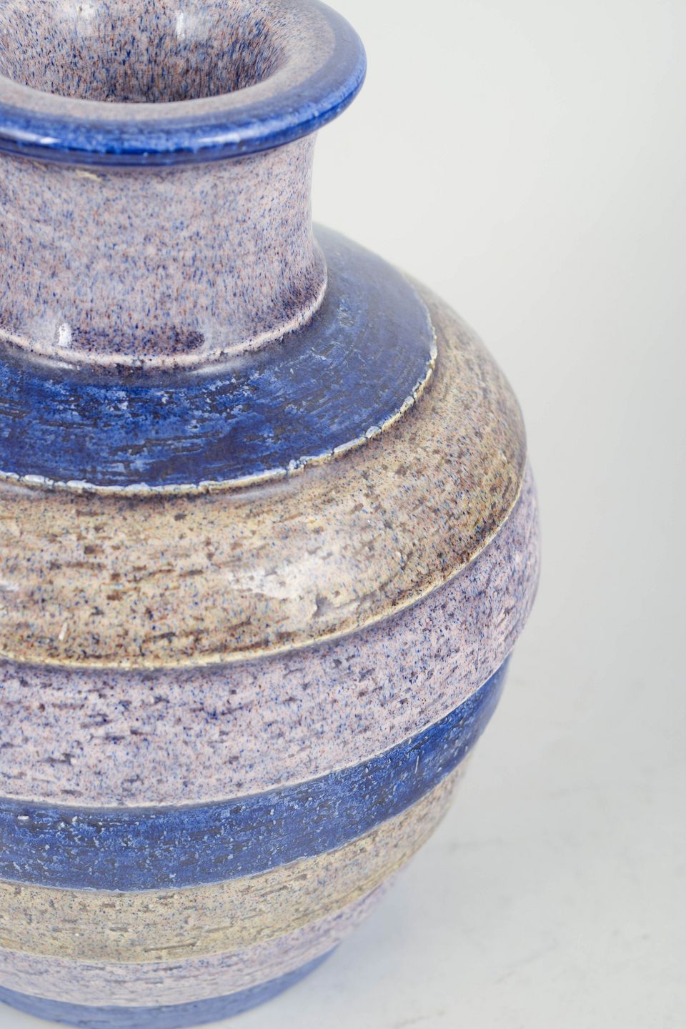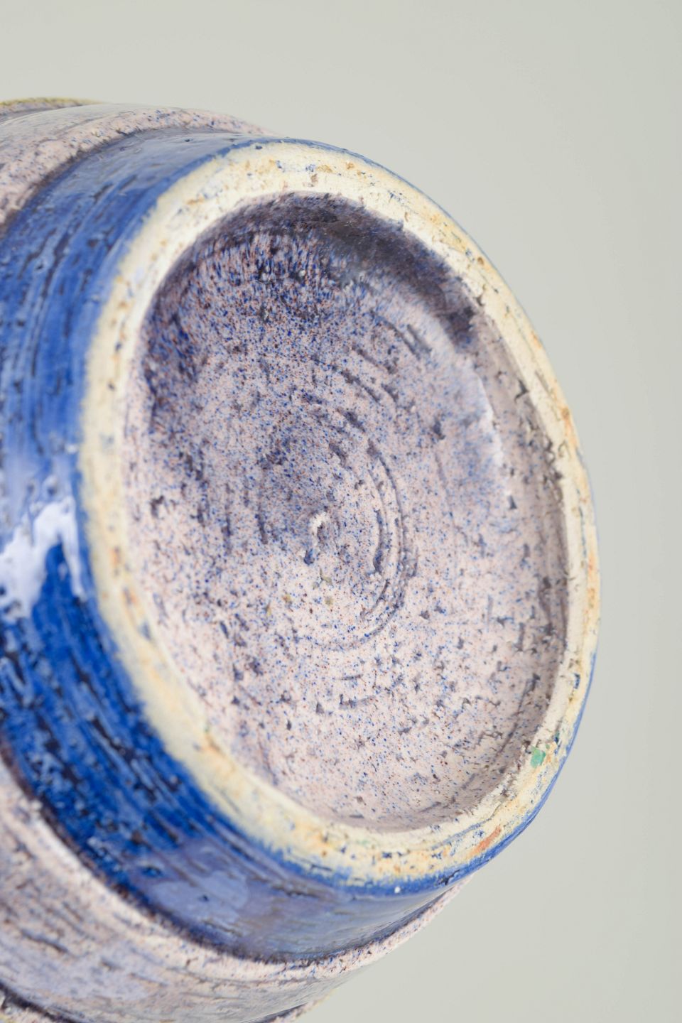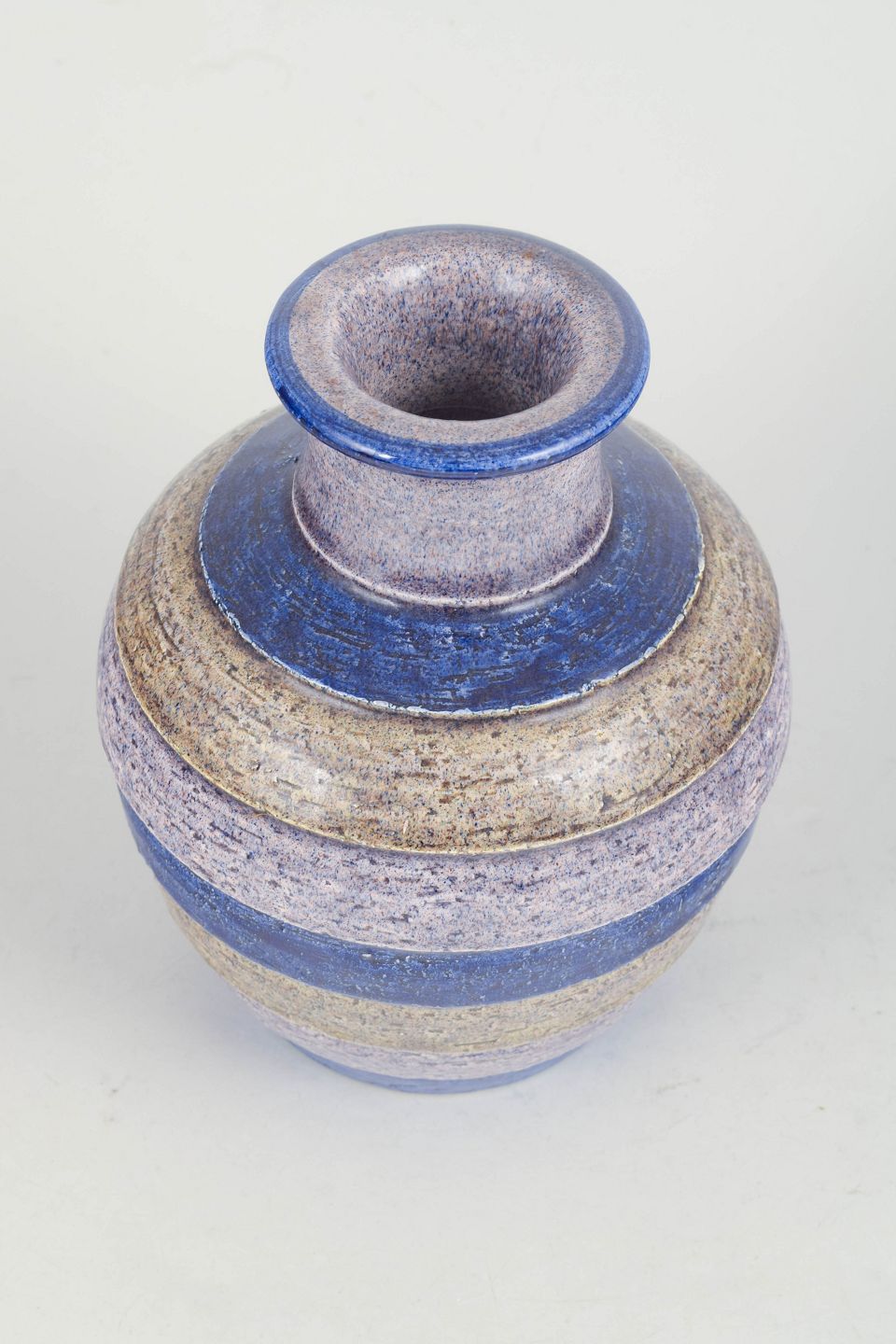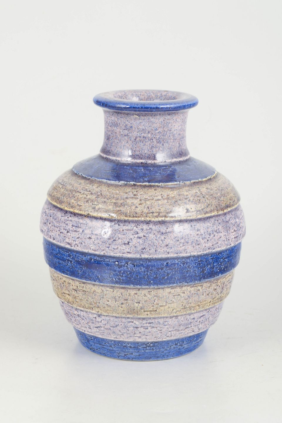 Aldo Londi for Bitossi, vase.Håndlavet vase i keramik med koncentriske ringe og karakteristisk glasur i blå, creme og sandfarvede nuancer. Udført i 1970’erne i Bitossis velkendte kunstneriske stil.