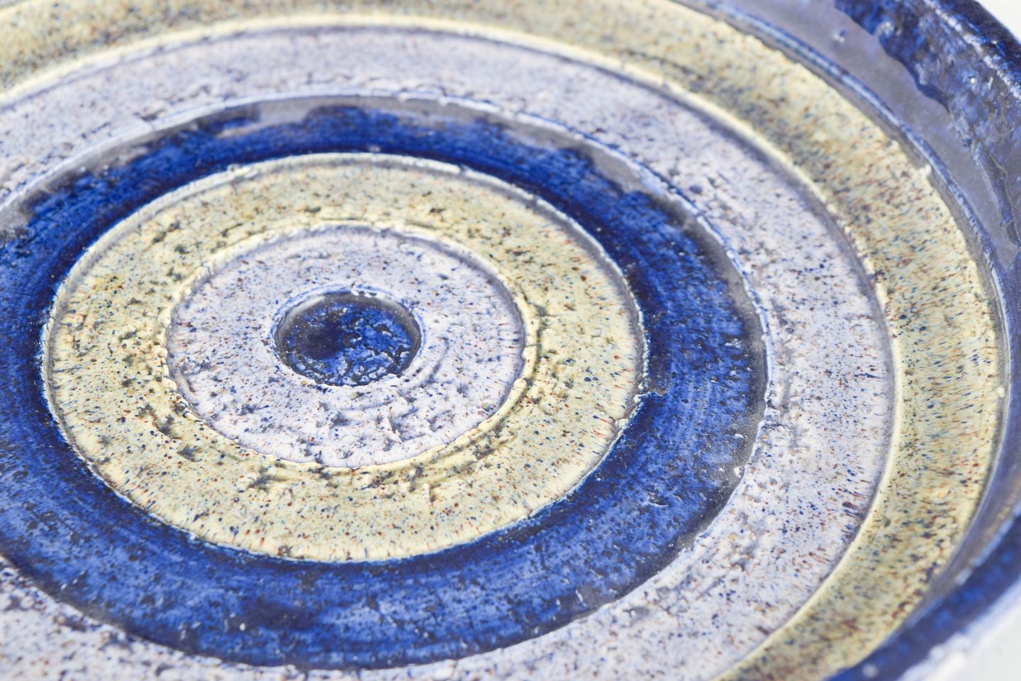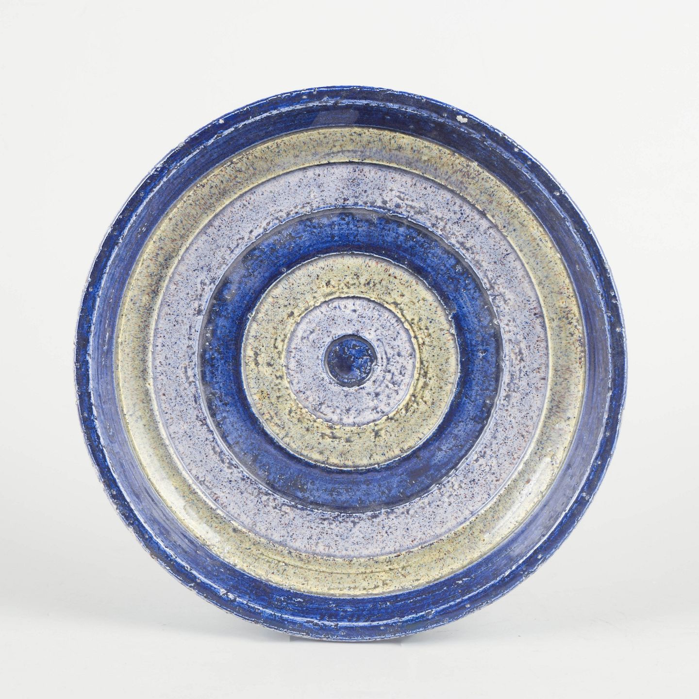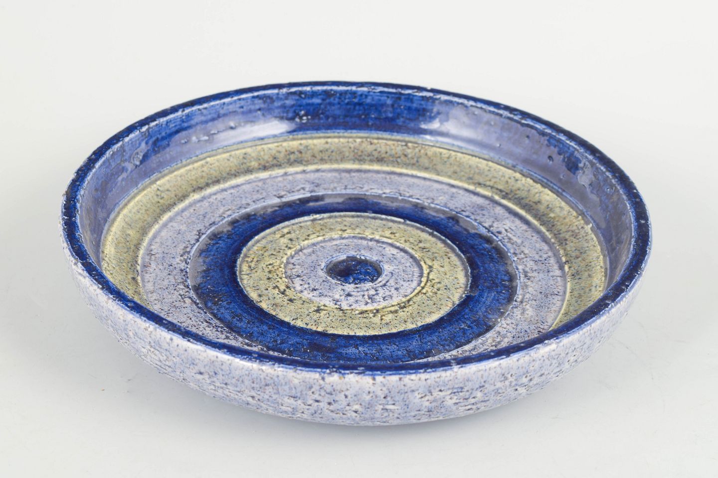 Aldo Londi for Bitossi, fad.Håndlavet rundt fad i keramik med koncentriske ringe og karakteristisk glasur i blå, creme og sandfarvede nuancer. Udført i 1970’erne i Bitossis velkendte kunstneriske stil.