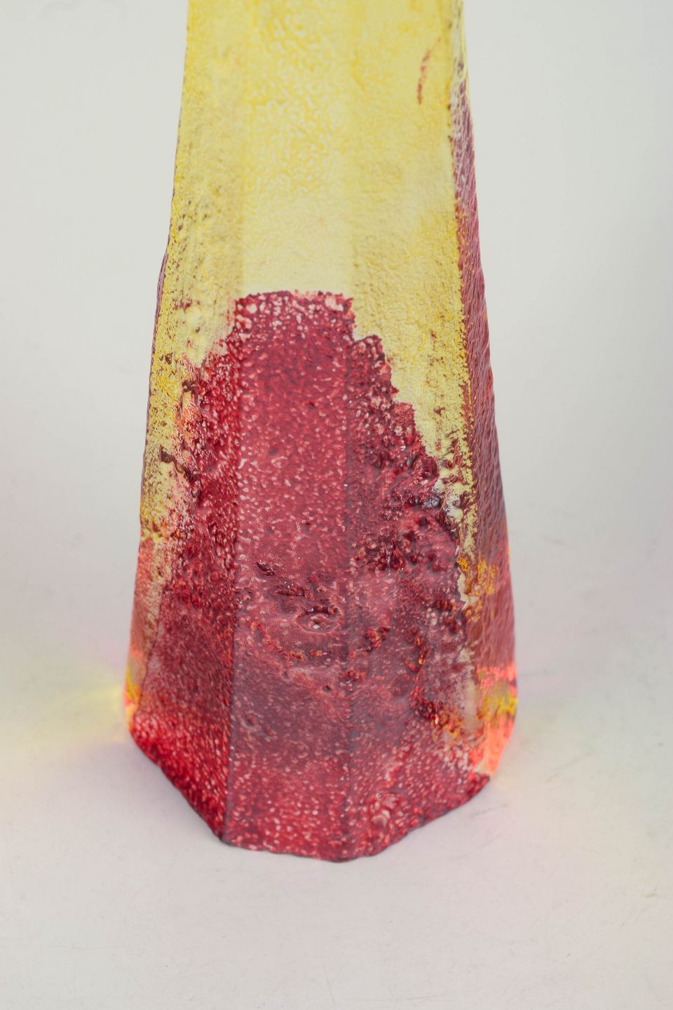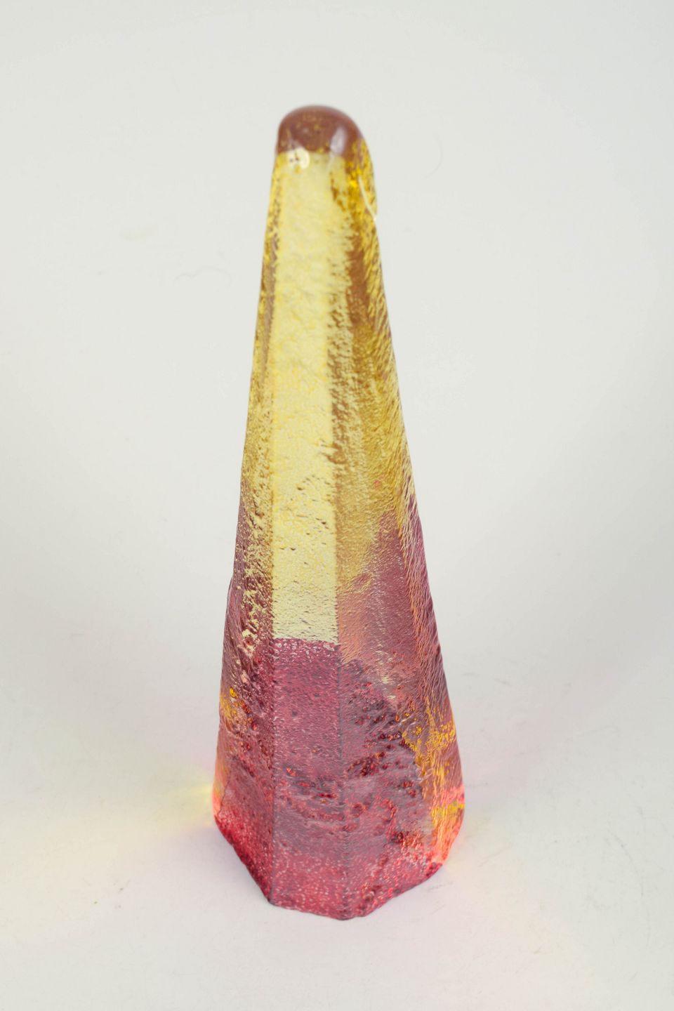 Björn Hultqvist for Bergdala, unikt kunstglas objekt.Høj kegleformet skulpturel form i mundblæst glas med indkapslede farver i gul, rød og klare nuancer. Signeret Bergdala B. Hultqvist.