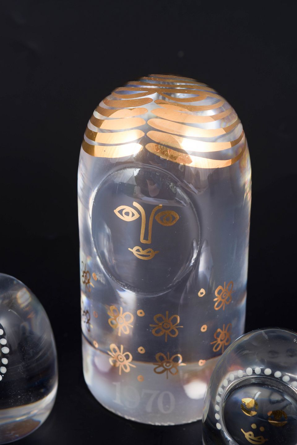 Kosta Boda, sæt af tre “Family” glasfigurer.Håndlavede kunstglasfigurer i klart glas med stiliserede ansigter og dekorative hvide og gyldne blomstermotiver, udført som en mindre familiegruppe.