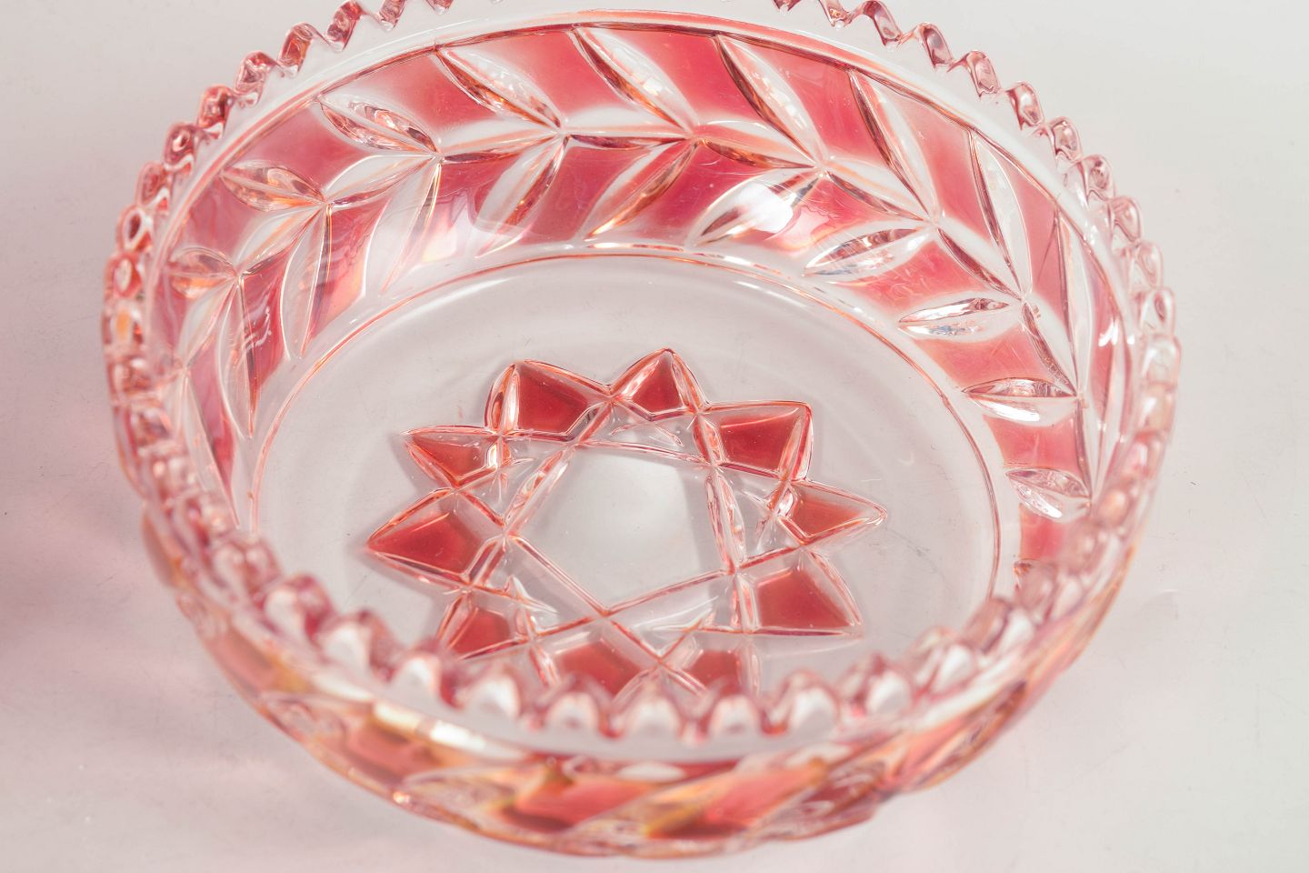 Bøhmisk krystalglas, sæt af fire dessertskåle.Pressede og slebne krystalskåle i klart og rosa tonet glas med geometrisk stjernedekor og facetslebne kanter.