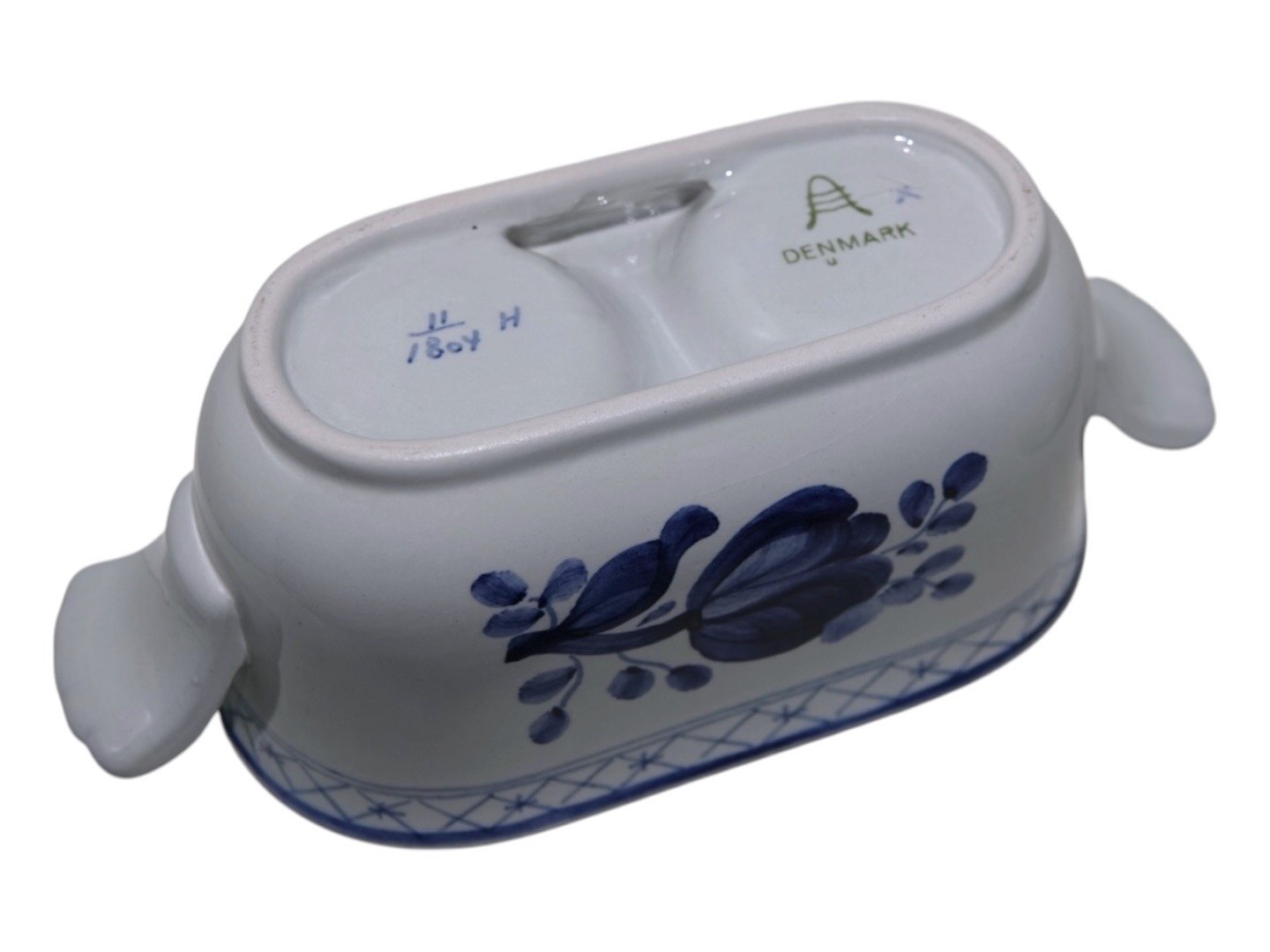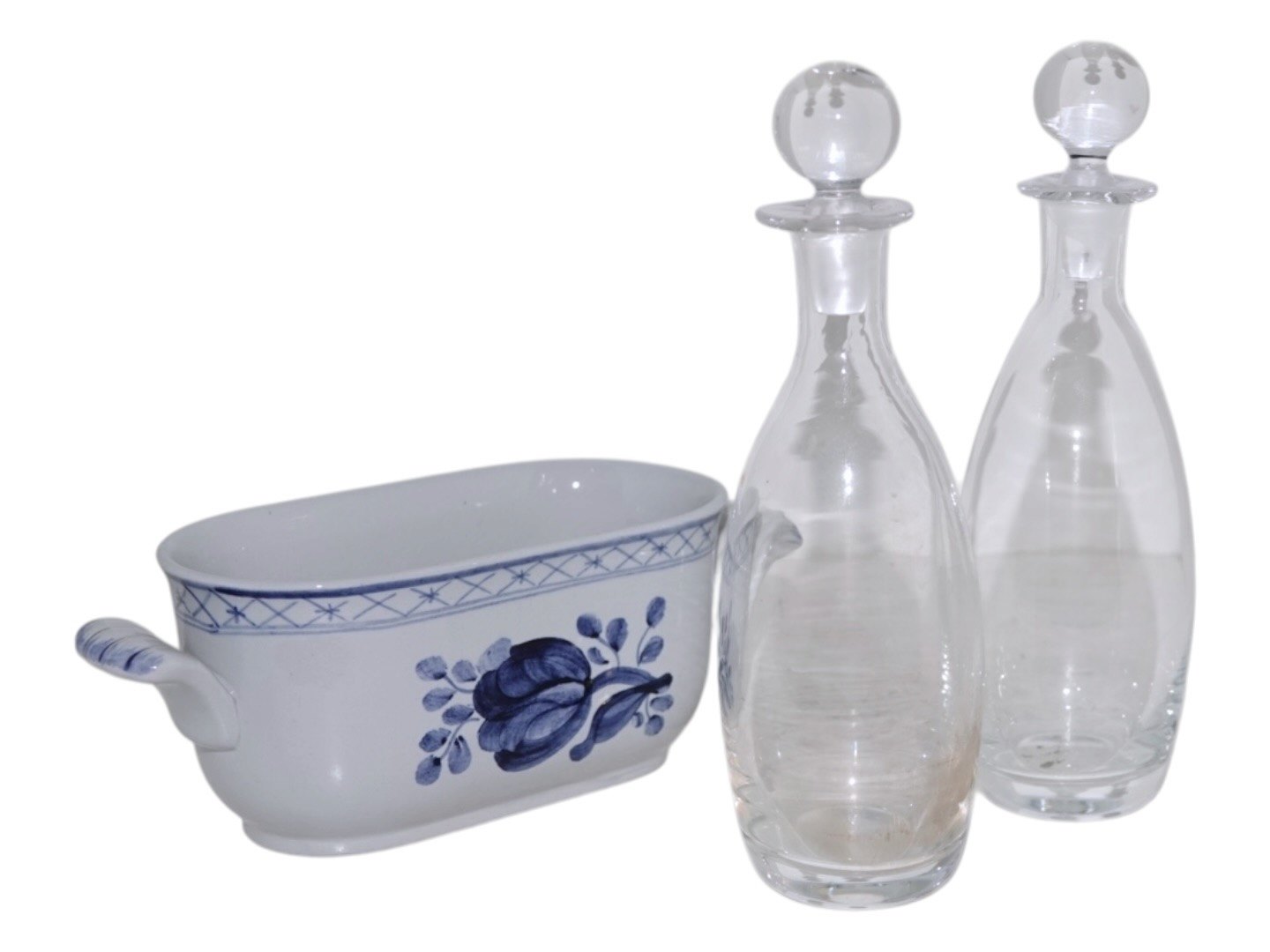 Aluminia Tranquebar, olie- og eddikeflaske i holder.Dekorationsnummer 11/1804.