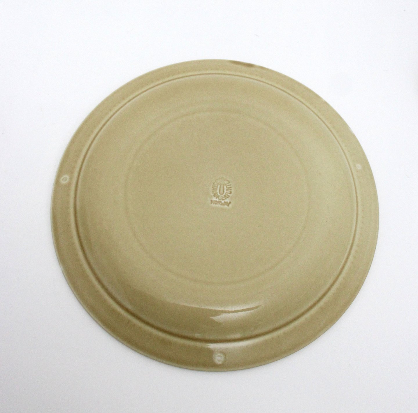 Stavangerflint, Norway, Brunette, gule middagstallerken. Almindelig brugsslid med ridser og overfladekrakeleringer. Brunette er designet i 1957 af Kåre Berven Fjelsaa. Stellet har brune og gule dele.