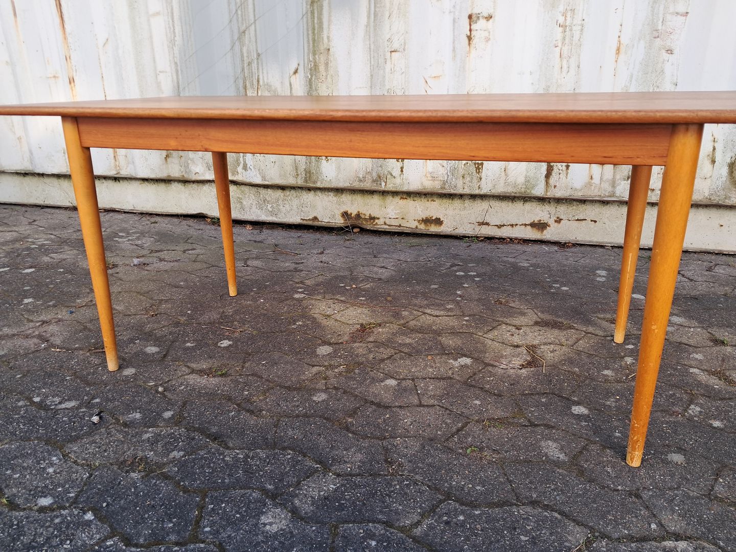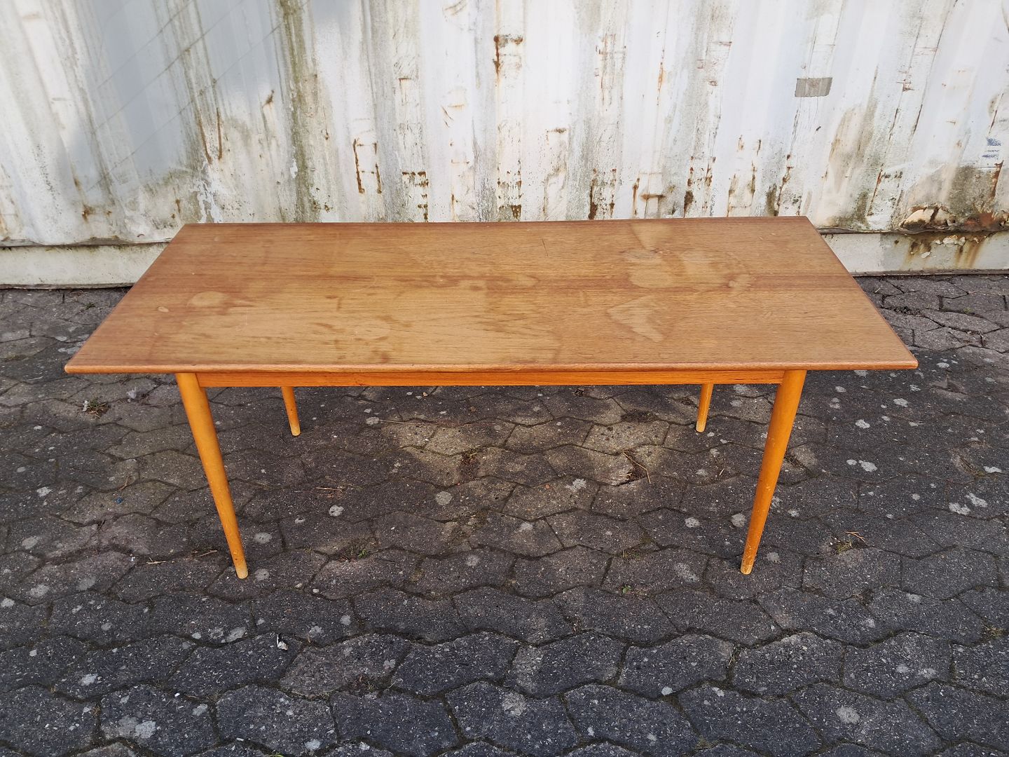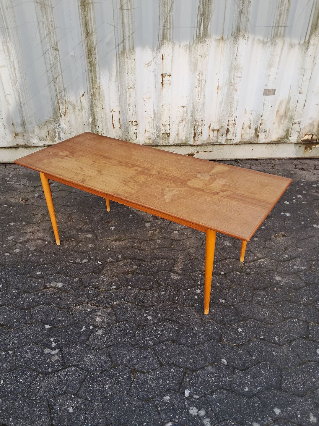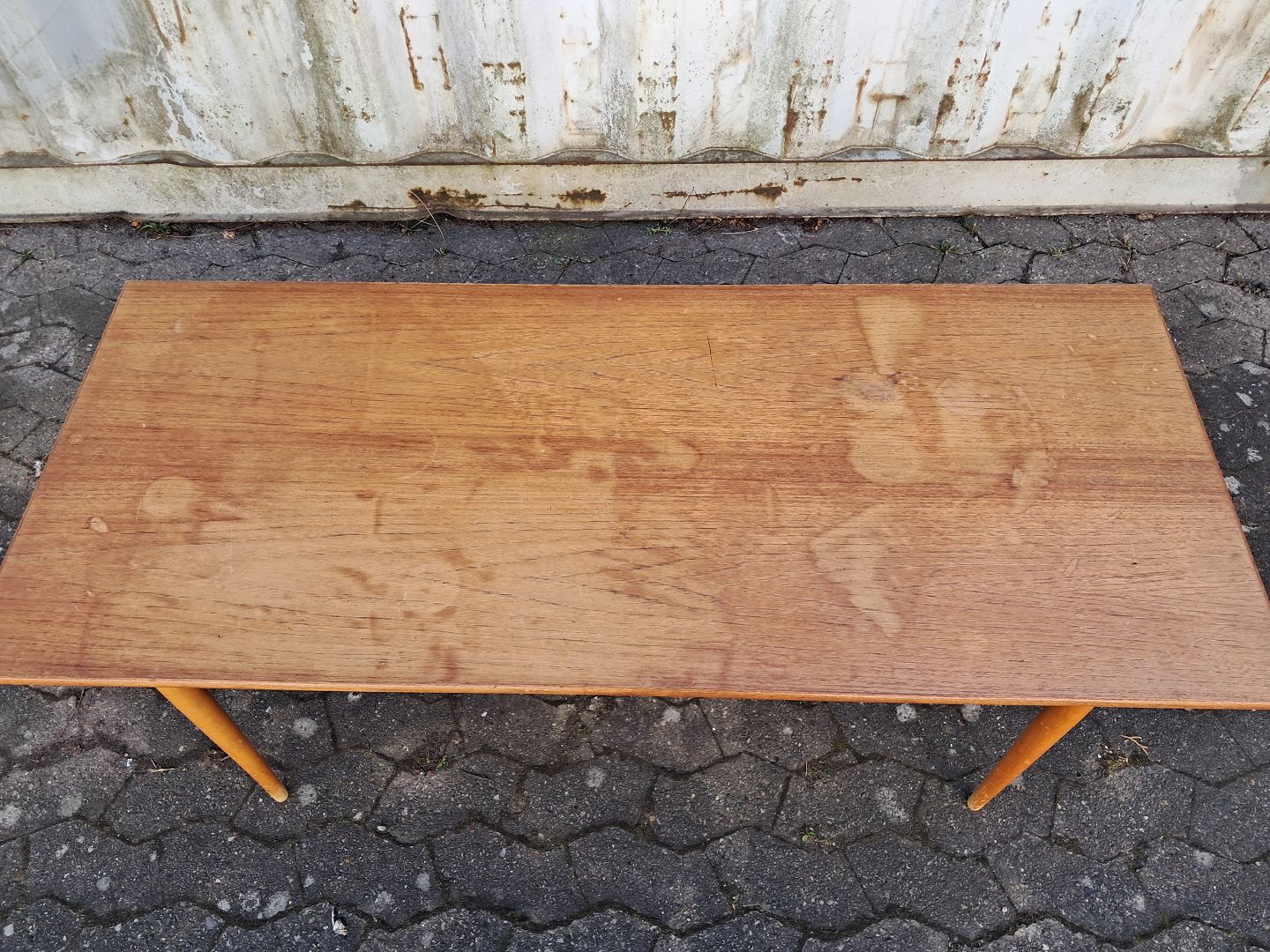 Sofabord i fineret teaktræ med ben i massivt bøgetræ, fra 1960erne.Bordpladen har brugsspor.