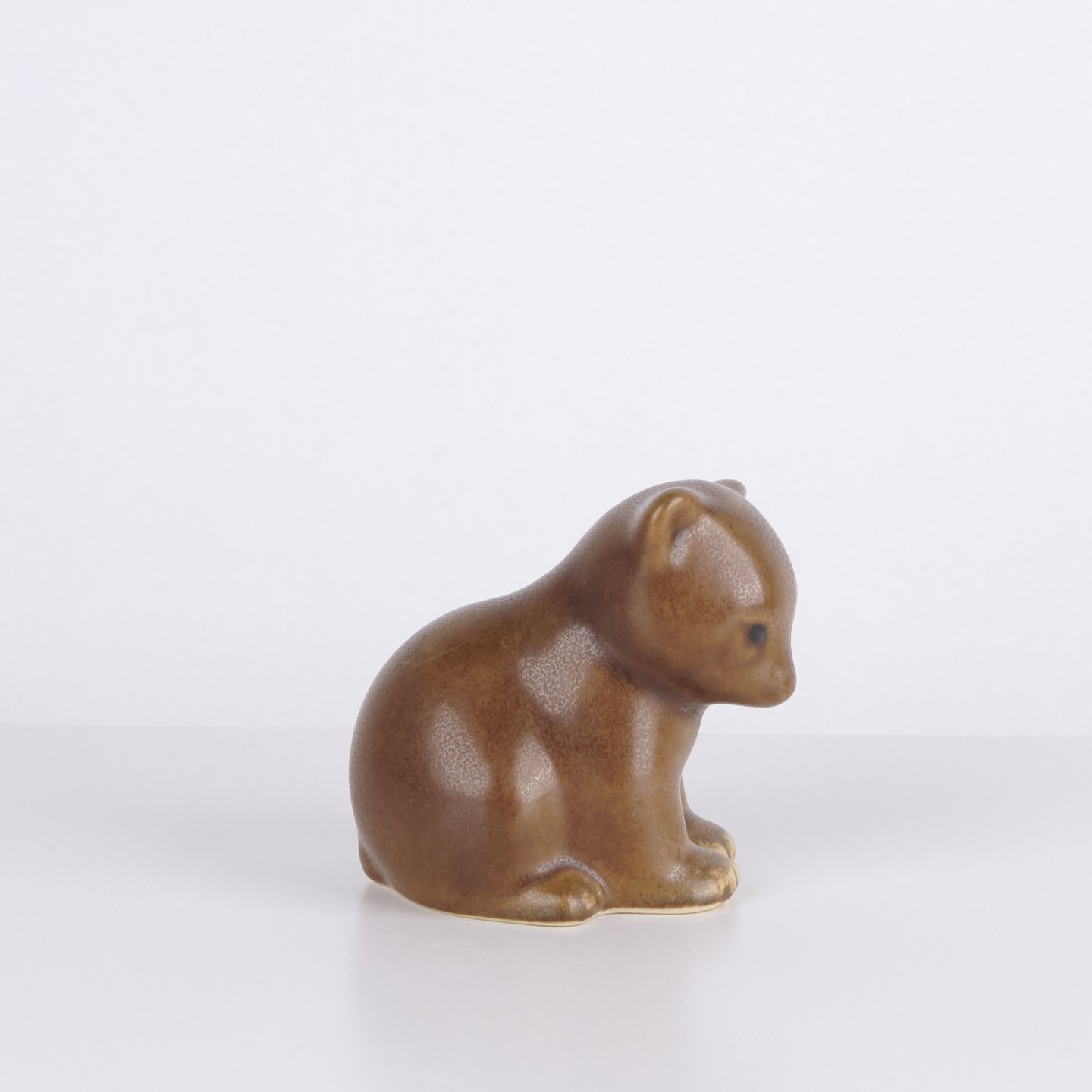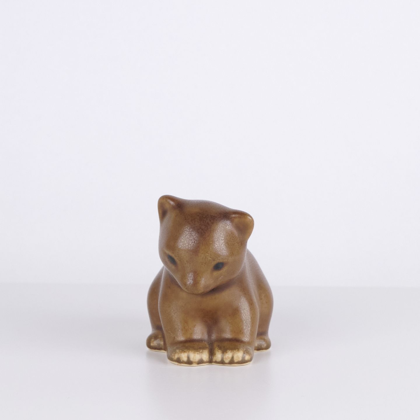 Katzenfigur von Knud Basse aus glasierter Keramik. Die Figur hat weiche organische Formen und einen ruhigen stilisierten Ausdruck, typisch für Knud Basses beliebte Tierfiguren. Dänische Kunstkeramik und begehrtes Sammlerstück aus der Mid-Century-Periode.