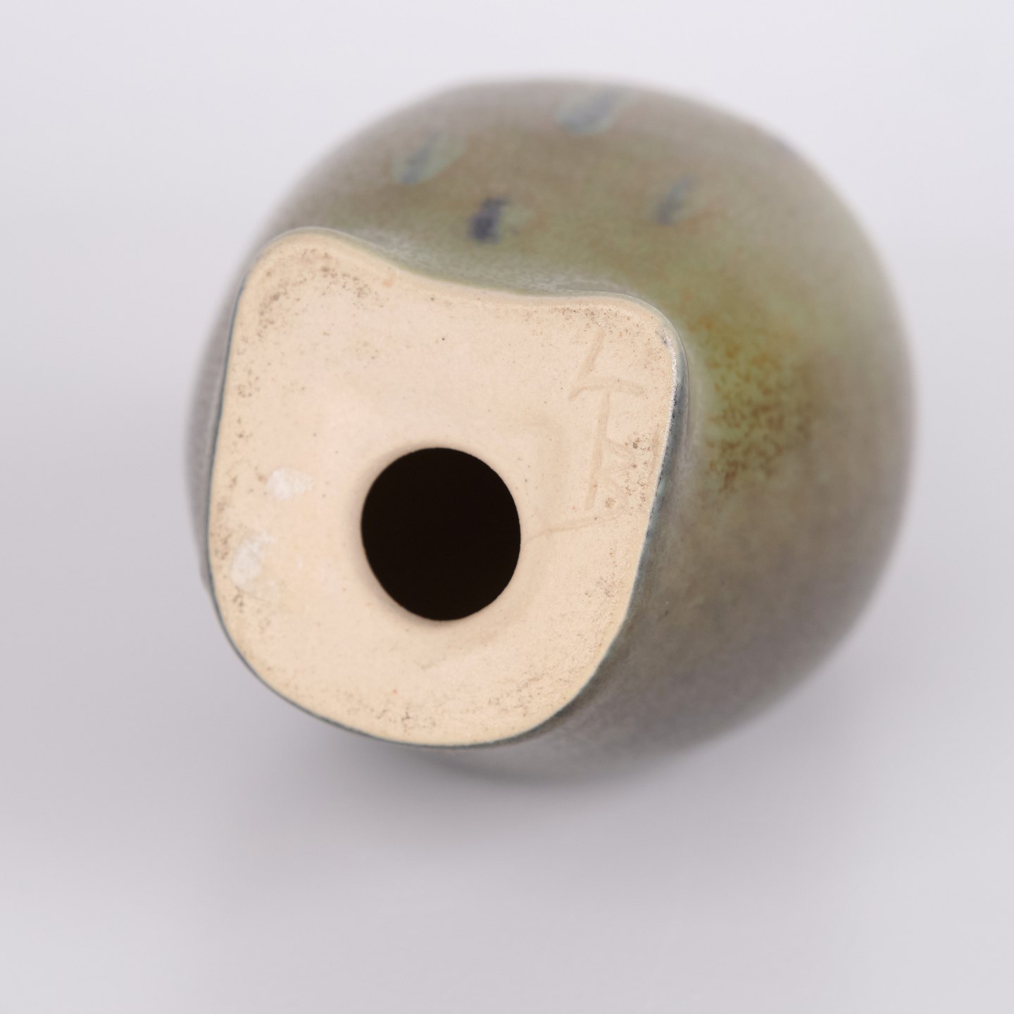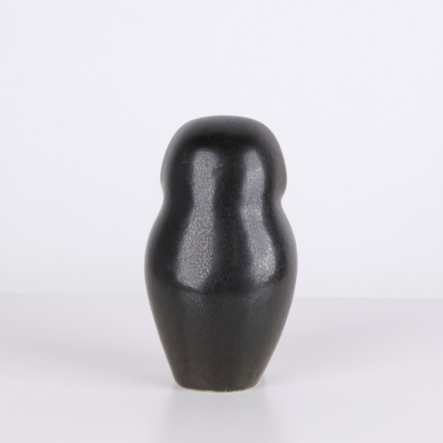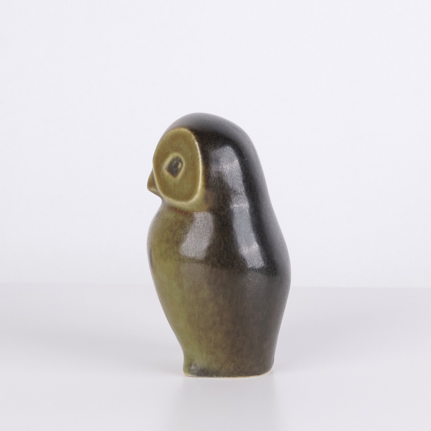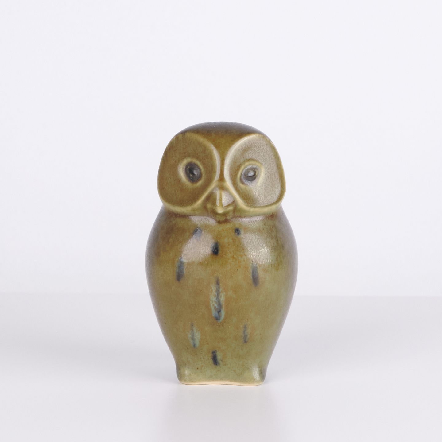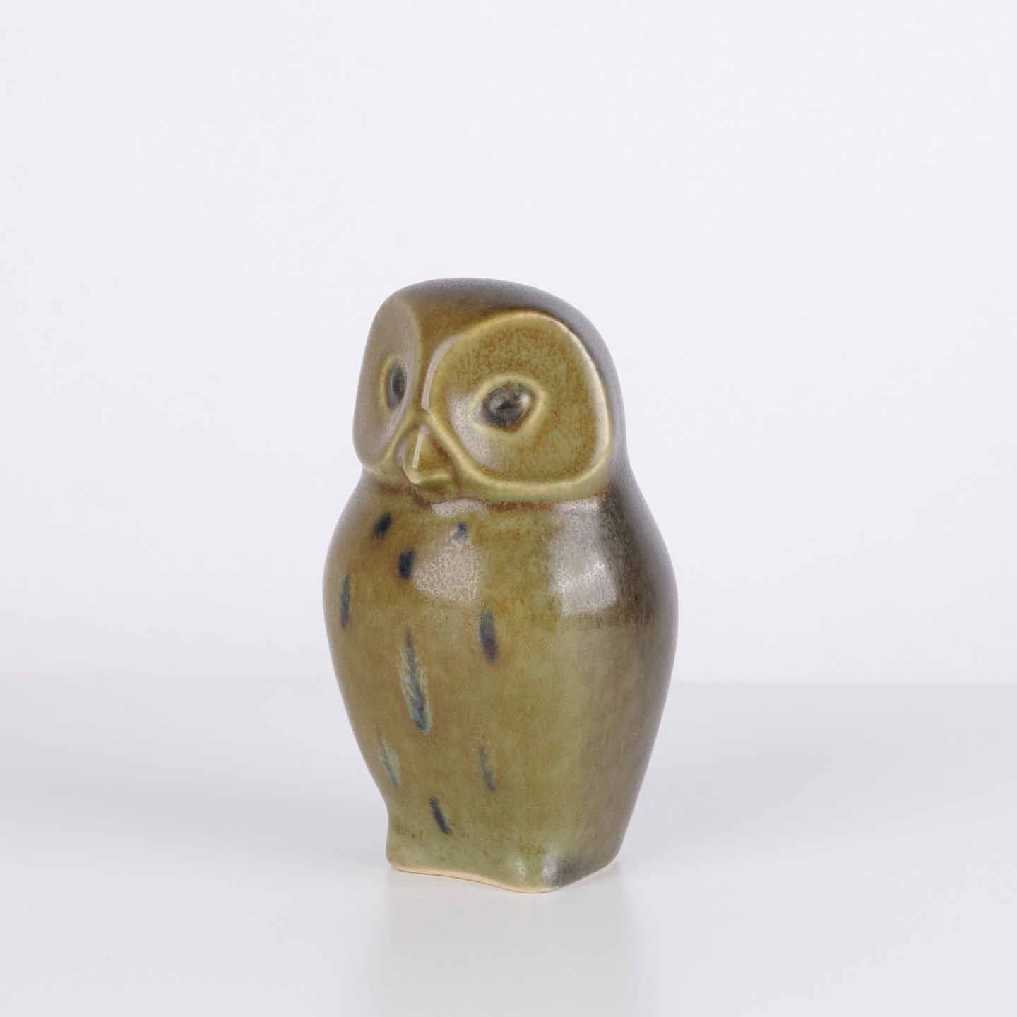 Eulenfigur von Knud Basse aus glasierter Keramik mit grünlichen Farbtönen und dunkler Dekoration. Die Figur hat markante Augen und eine schlichte stilisierte Form, typisch für Knud Basses beliebte Tiermotive. Dänische Kunstkeramik mit dekorativem Ausdruck und hoher Sammlernachfrage.— Herkunft: Dänemark