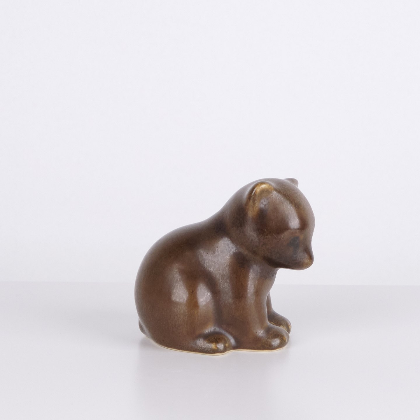 Bärenfigur von Knud Basse aus braun glasierter Keramik. Die Figur ist in sitzender Form mit leicht geneigtem Kopf und abgerundeten Linien modelliert, was ihr einen ruhigen und charaktervollen Ausdruck verleiht. Ein schönes Beispiel für Knud Basses beliebte Tierfiguren und dänische Kunstkeramik aus der Mid-Century-Periode.