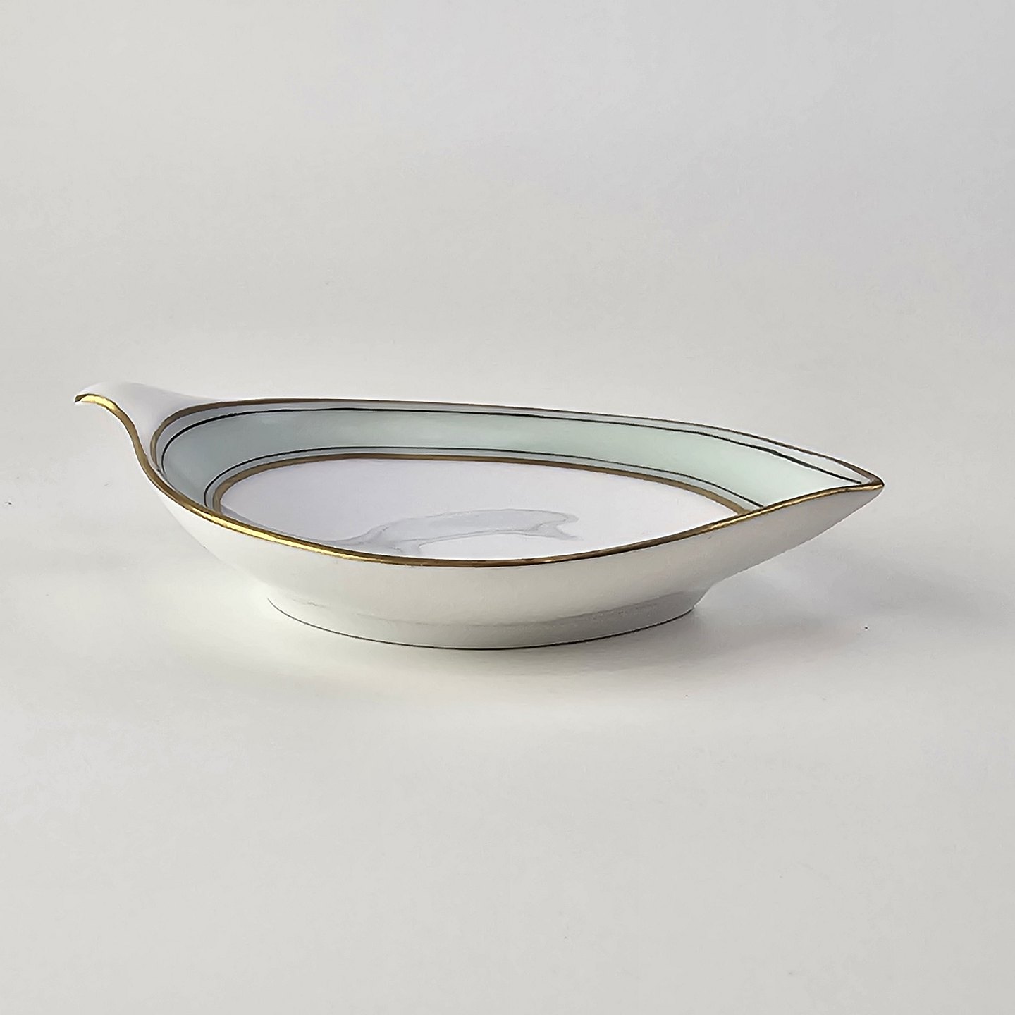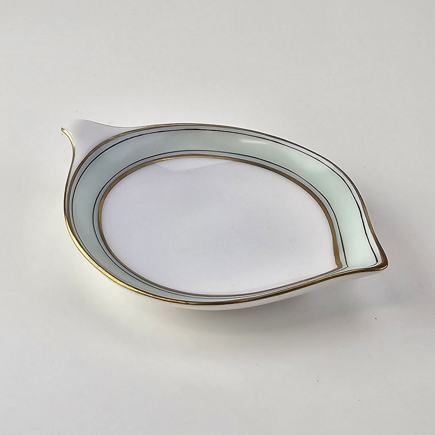 Service i glat hvidt porcelæn med mintblå dekoration og dobbelte guldkanter