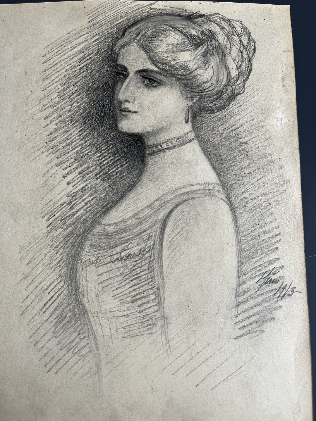 Bagpå tegning af smuk ung kvinde 1913 (bly/kul)