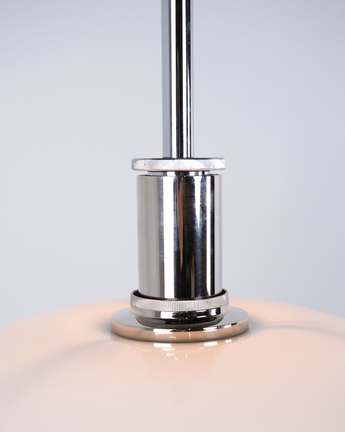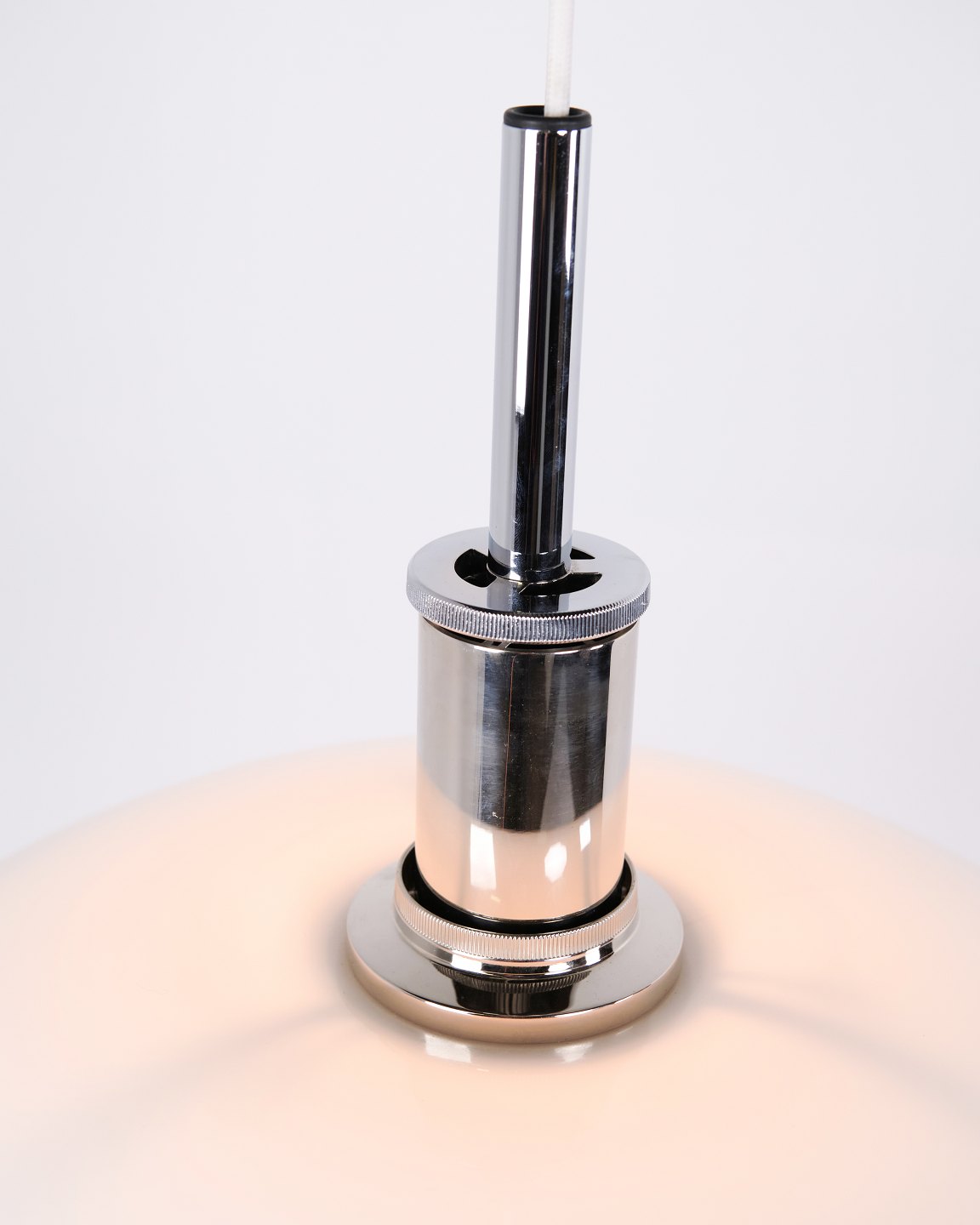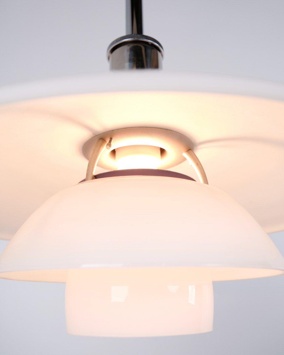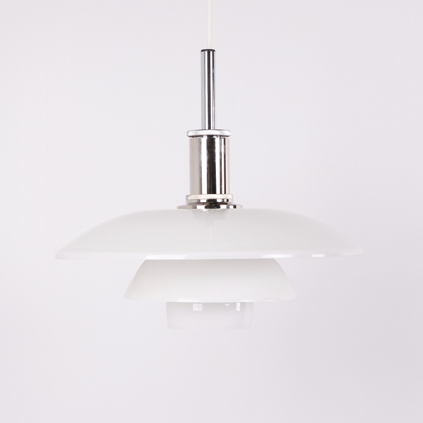 PH 4½-4 Pendelleuchte, entworfen von Poul Henningsen für Louis Poulsen. Die Leuchte ist mit mundgeblasenen Dreischirmen aus weißem Opalglas und Chromaufhängung gefertigt. Das Modell besitzt einen oberen Schirm von ca. 45 cm und verwendet die unteren Schirme der PH 4/4 Serie, entwickelt für eine breitere Lichtverteilung bei niedriger Aufhängung über Esstisch oder Tischfläche. Die heutige Version wurde 1980 eingeführt und ist Teil des ikonischen blendfreien PH Beleuchtungssystems.— Herkunft: Dänemark