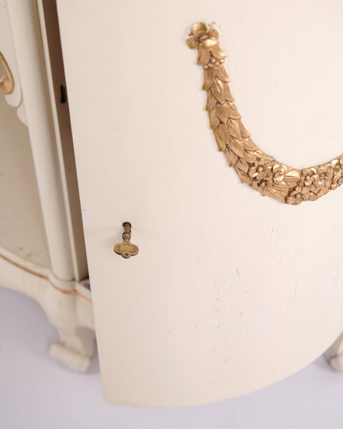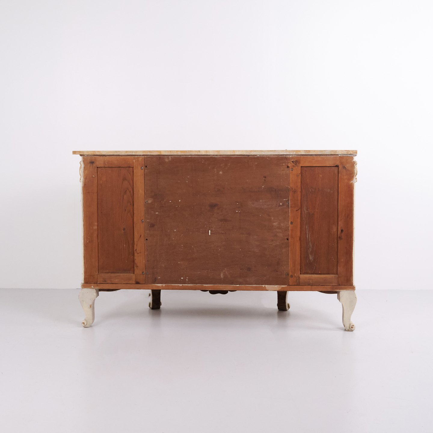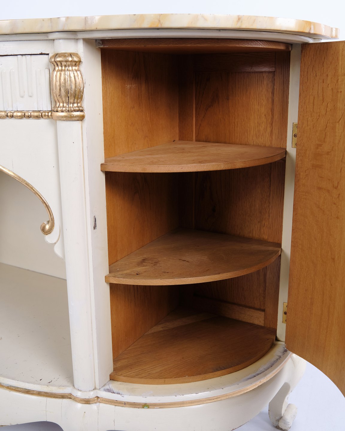 Gebogenes Sideboard gefertigt von P. Svensen, N. Frihavnegade 15, Kopenhagen. Das Möbel ist aus bemaltem Holz mit profilierten Details, vergoldeten Dekorationen und originaler Marmorplatte gefertigt. Die Front verfügt über ein offenes Mittelfach, eine kleine Schublade sowie zwei gebogene Schranktüren mit Innenböden. Klassische empireinspirierte Form mit gebogenen Seiten, geschwungenen Beinen und dekorativen Beschlägen. Geeignet als Flurmöbel, Konsole oder Aufbewahrungssideboard.