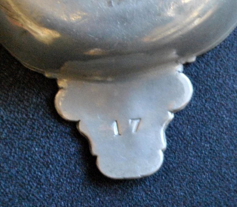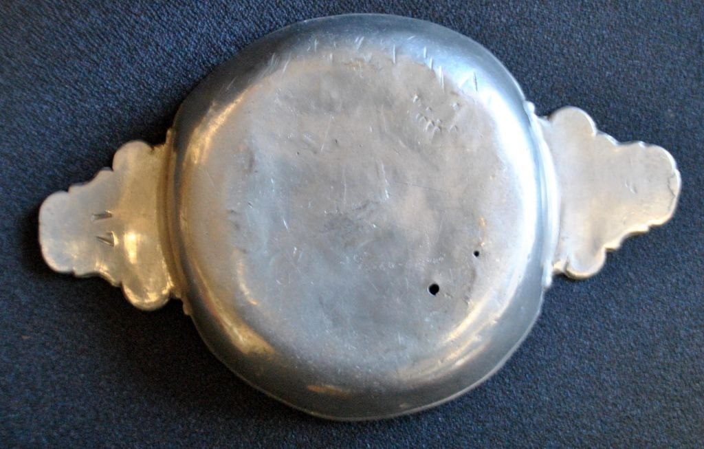 Barocke Ohrenschale aus Zinn. 18. Jahrhundert. Dänemark. Futterschale. Mit glatten, geschwungenen Seiten. Staubige Ohren mit barocken Verzierungen. Auf der Unterseite eines Ohrs gestempelt: 17. Durchmesser: 16 cm. Länge mit Ohren: 24,5 cm. Höhe: 4 cm.Vermutlich eine Ohrmuschel aus einem dänischen Militärkrankenhaus.