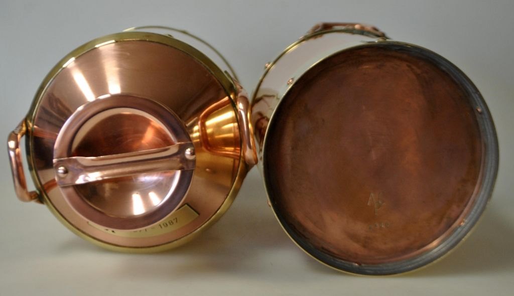 Zwei Kupferkannen mit Messingbeschlägen, 1986–88, Dänemark. Mit zwei Griffen und Deckel. Gestempelt: ACP 1986 und ACP 1988. Eine Kanne mit dem Logo von Mejeriet Enigheden. Höhe: 20,5 cm.