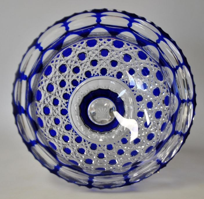 Großes Kristall-Mittelstück, 20. Jahrhundert. Mit blauem Rand. Auf quadratischem Sockel. Höhe: 21 cm. Durchmesser: 24 cm.Bestellnummer: 29048