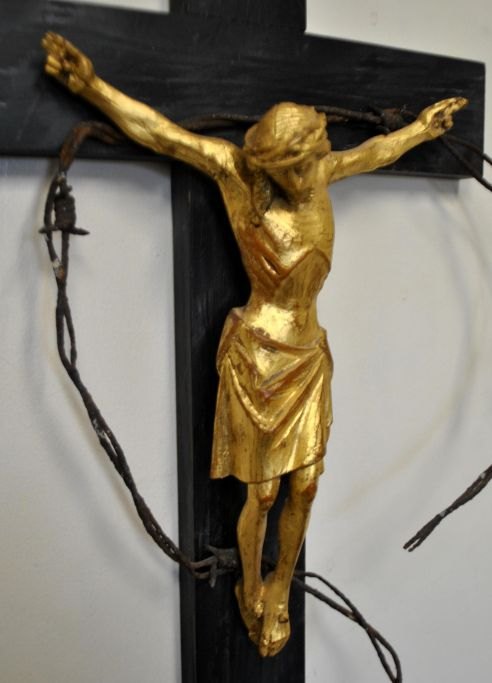 Vergoldete Holzfigur, Christus am Kreuz, 20. Jahrhundert. Handgeschnitzt. Die Figur hängt an einem schwarz bemalten Kreuz mit Stacheldraht. Signiert. Höhe: 41 cm. Breite: 24,5 cm.