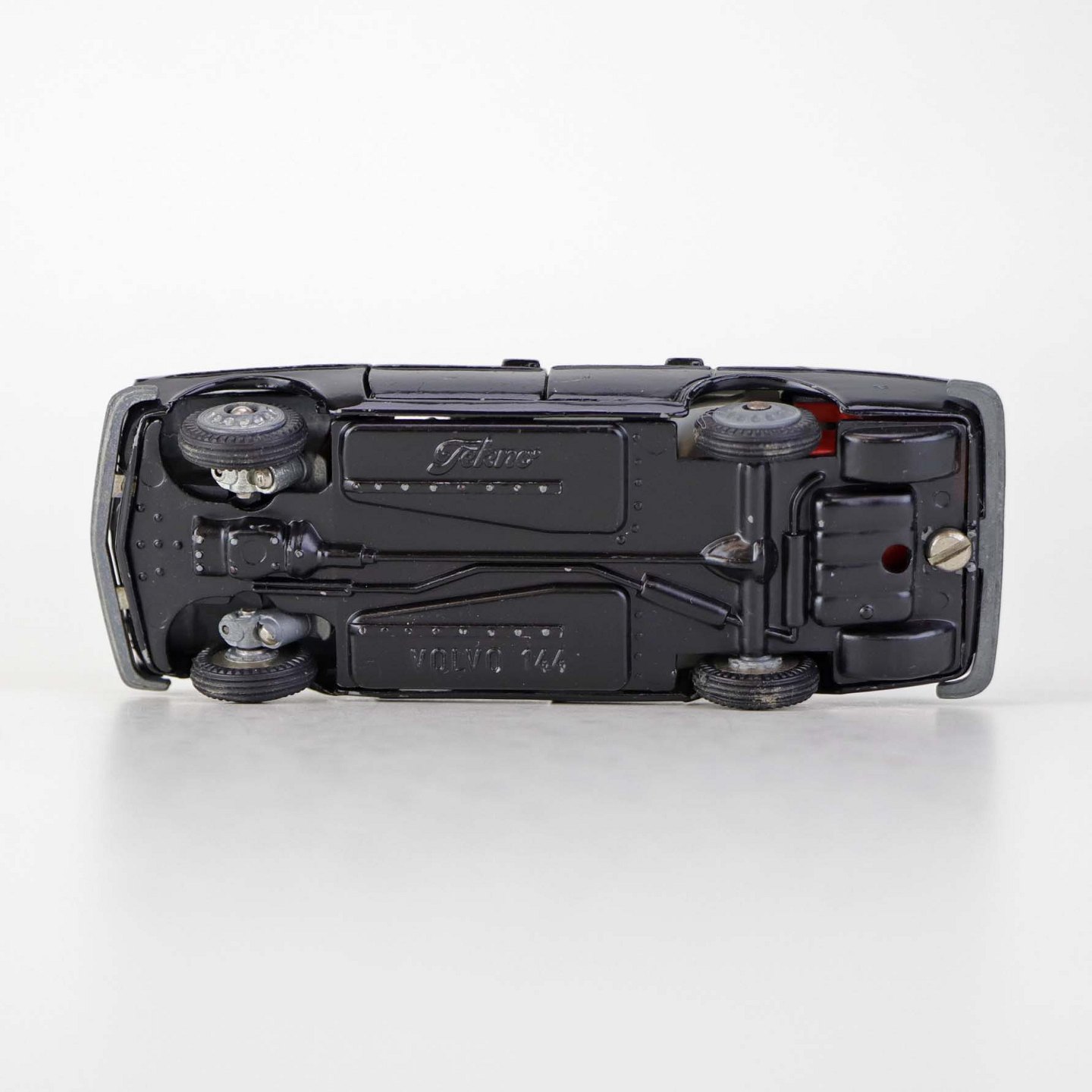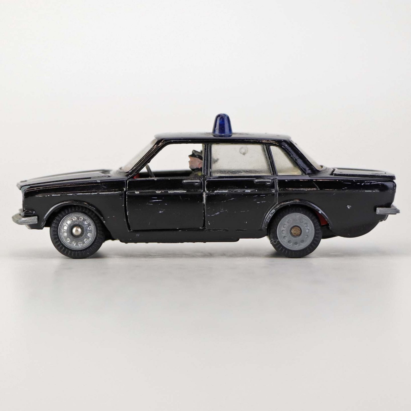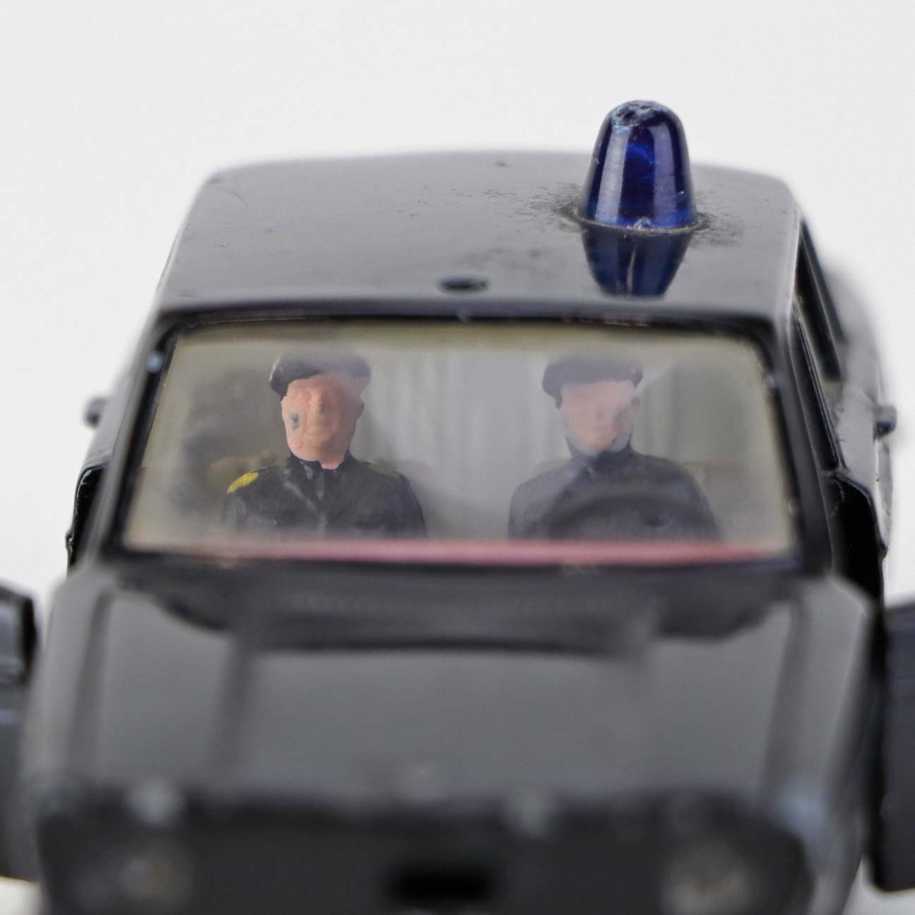 Politibil med to figurer. Legetøjsbil i sortlakeret metal med gummi hjul og blå blinklys. Model Volvo 144 Producent Tekno, Denmark