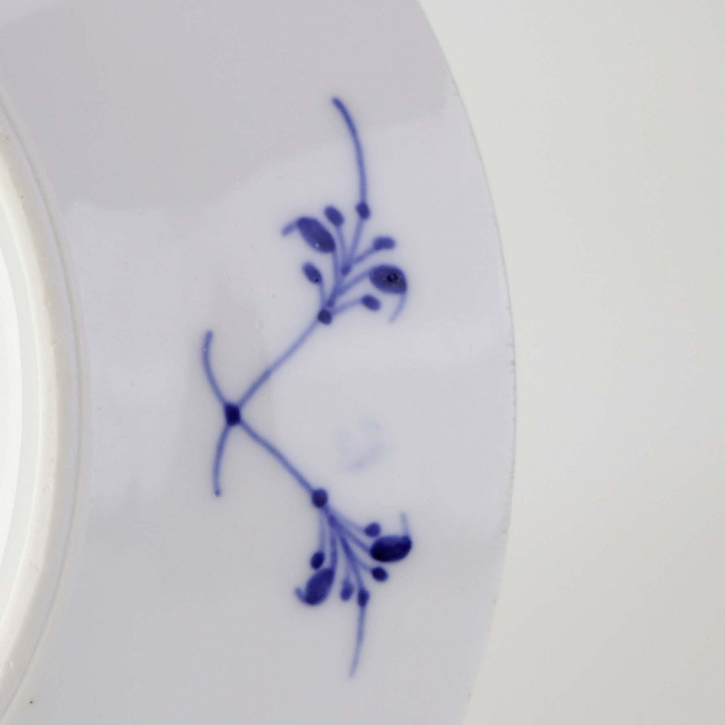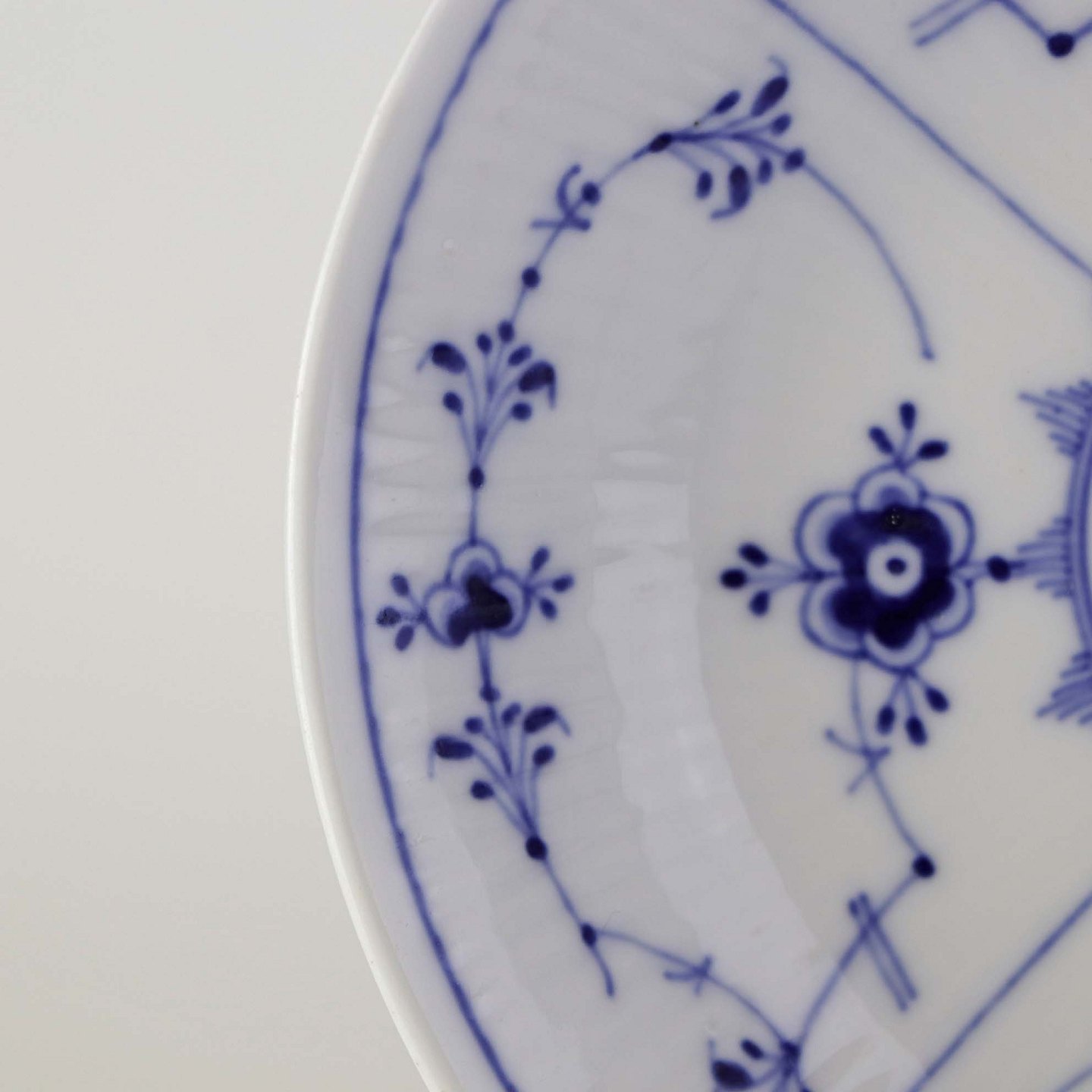 Musselmalet er af kongeligt hvidt porcelæn, dekoreret med rifler og mønster af blå ranker og blomster.