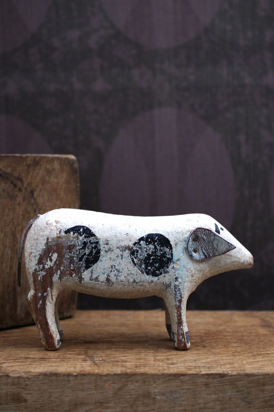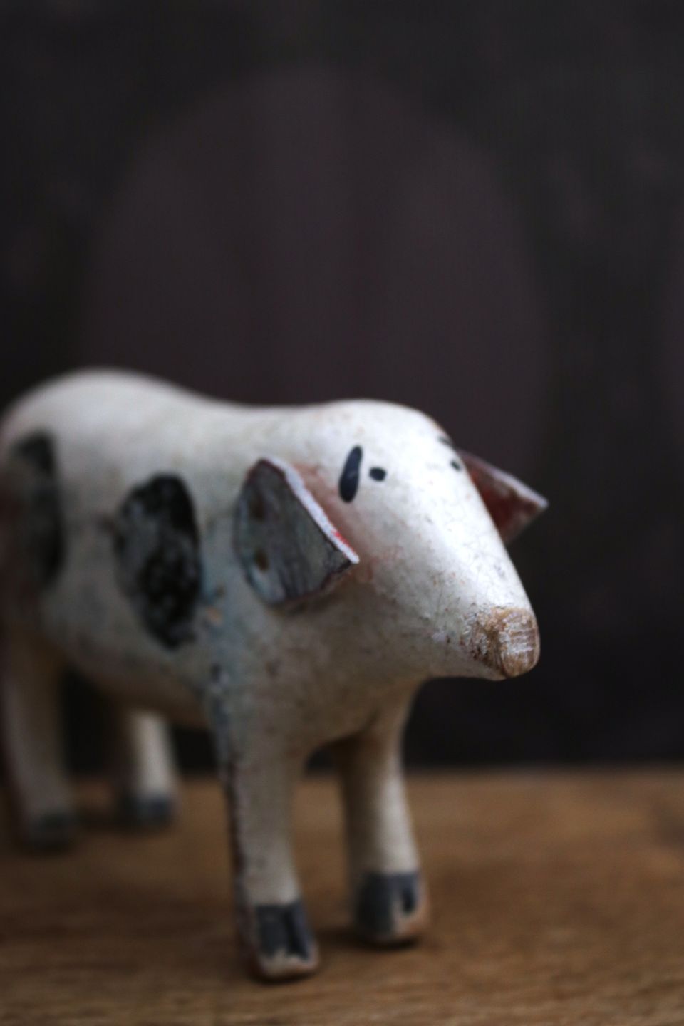 Dekorativ , gammel gris i udskåret træ med fin original bemaling og øre , samt hale i læder...