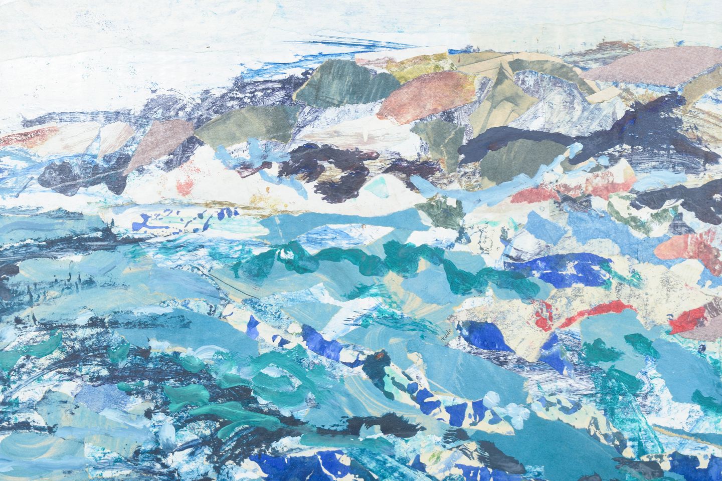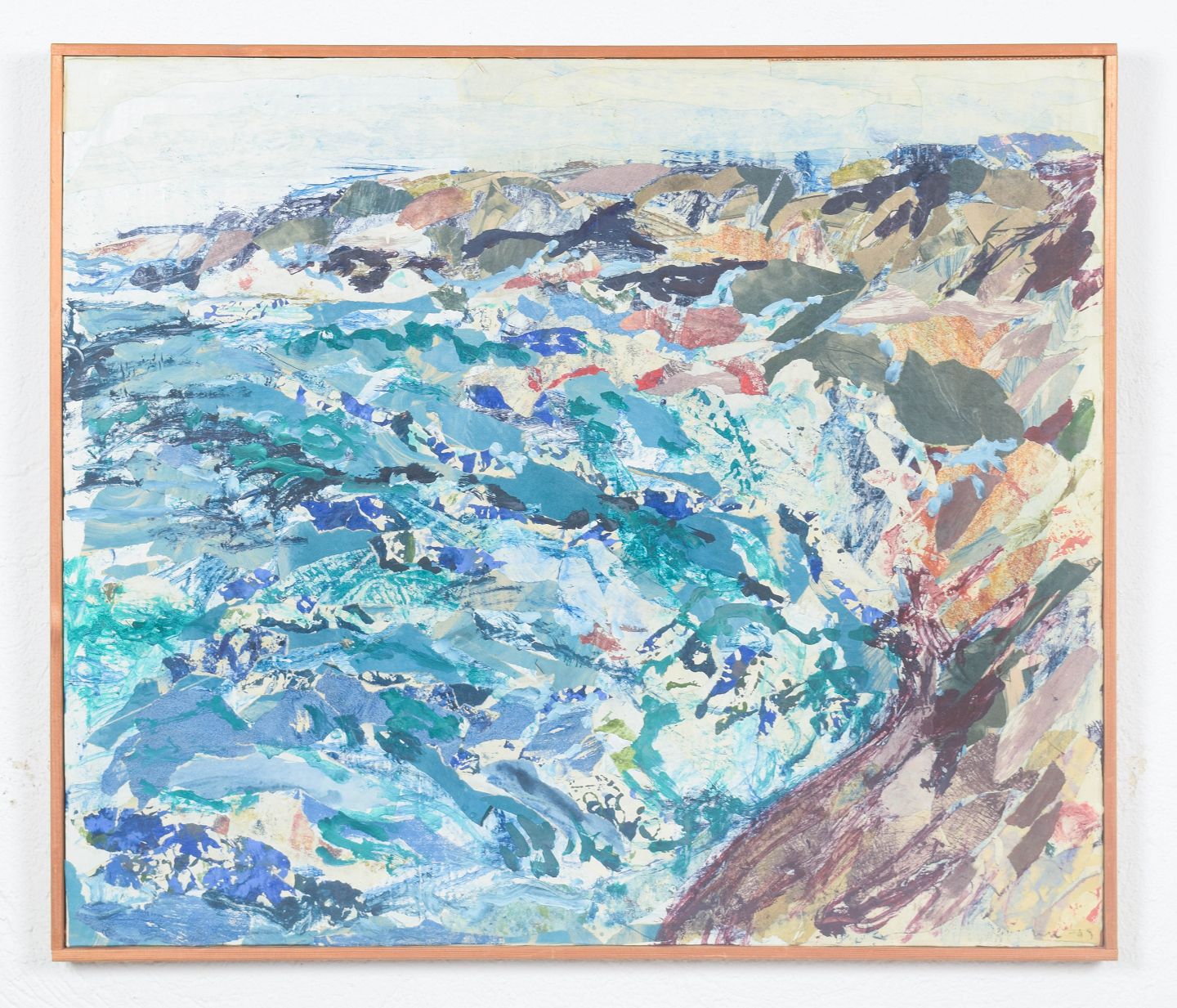 GÖSTA Alm, mixed media på plade, listet svensk billedkunstner.Ekspressivt kystmotiv fra den svenske skærgård med dynamiske penselstrøg og lagdelte farvefelter i blå, grønne og jordede nuancer. Kompositionen er udført i mixed media på plade og fremstår signeret og dateret 1969.