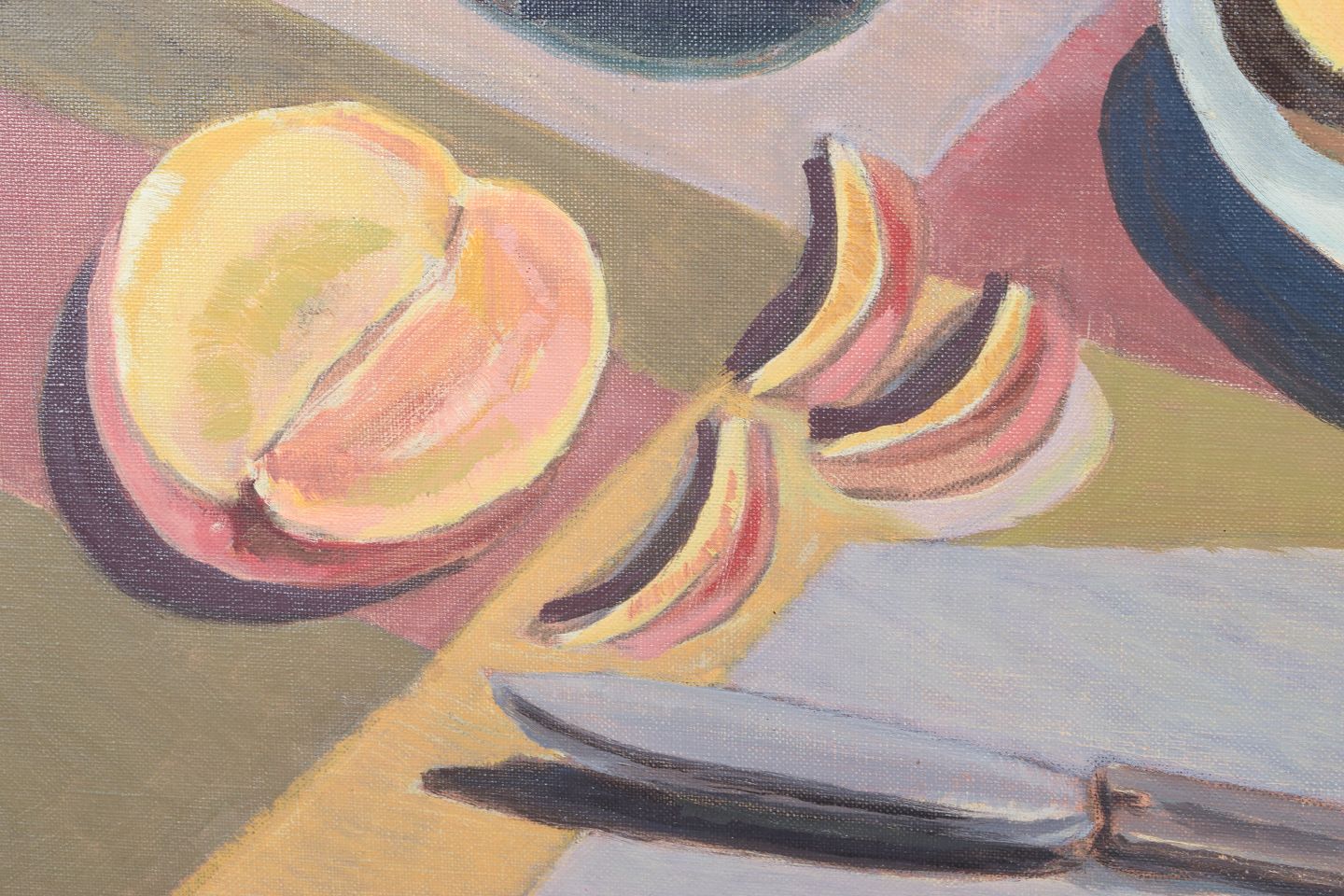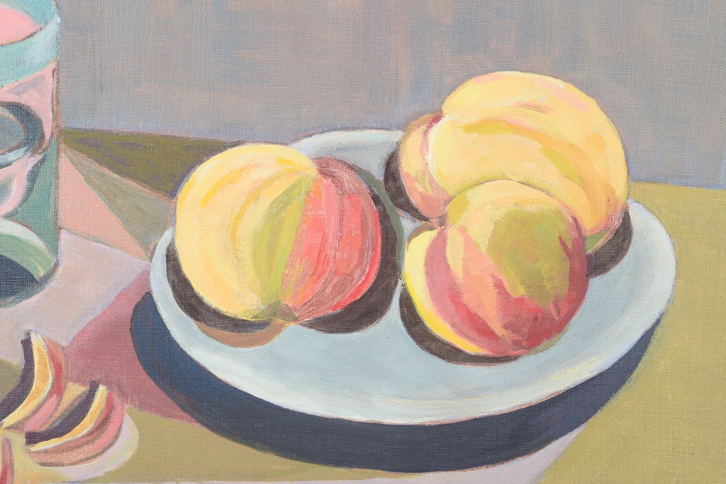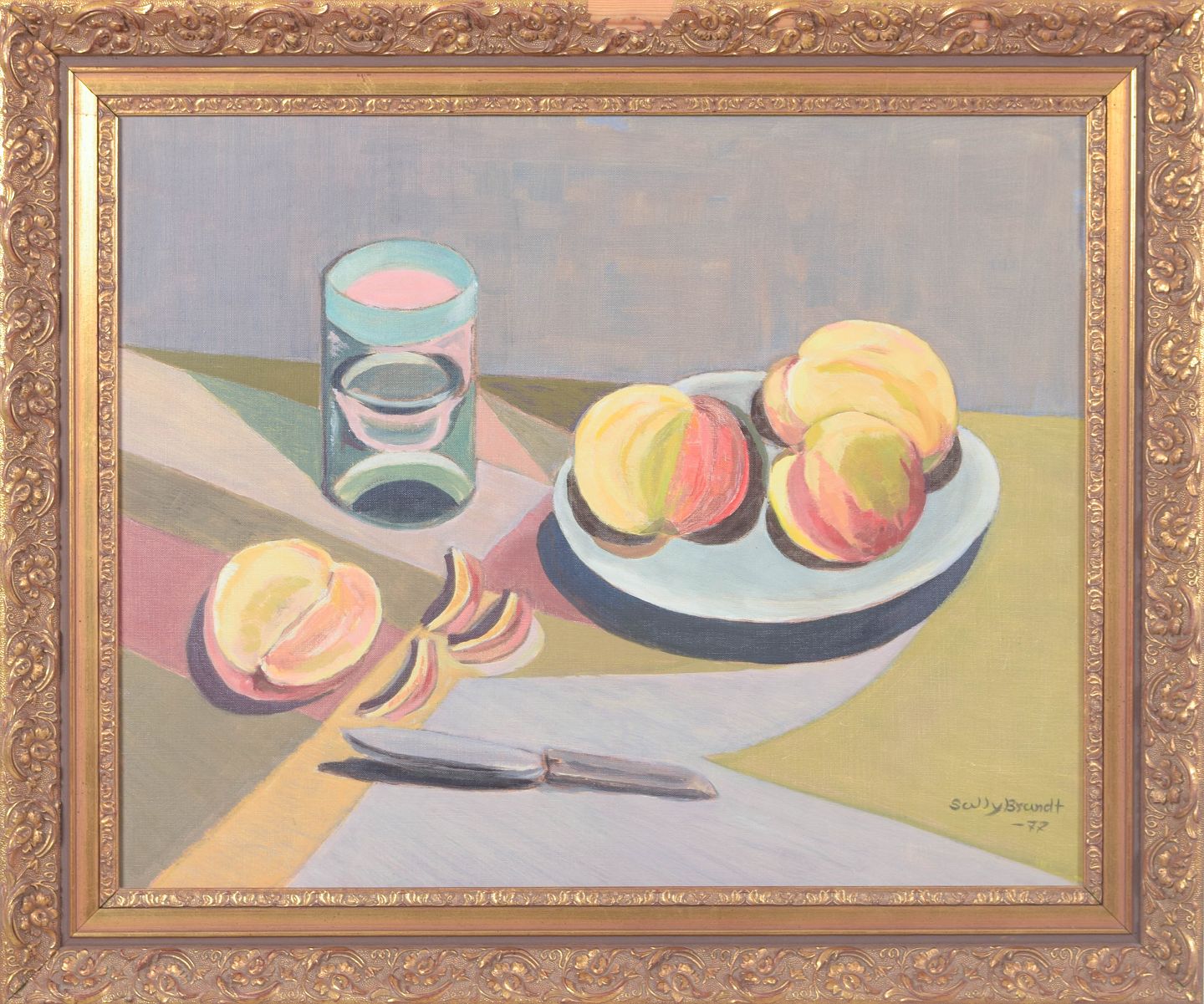 Sally Brandt, oliemaleri på lærred, skandinavisk billedkunstner.Modernistisk stilleben med frugt og glas opstillet i et roligt interiør, udført i en afdæmpet farvepalette med geometrisk opbygning. Kompositionen balancerer mellem figurativ gengivelse og stiliseret formsprog, signeret og dateret 1977.
