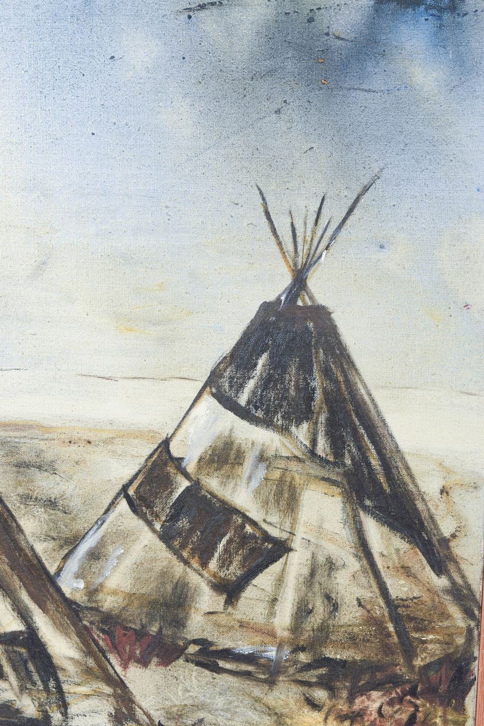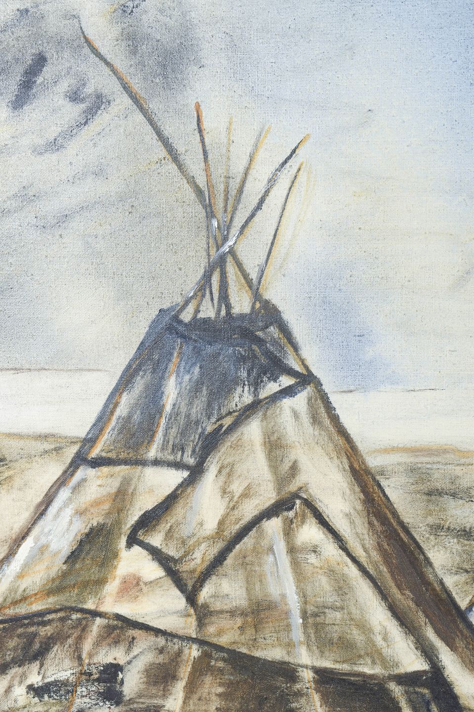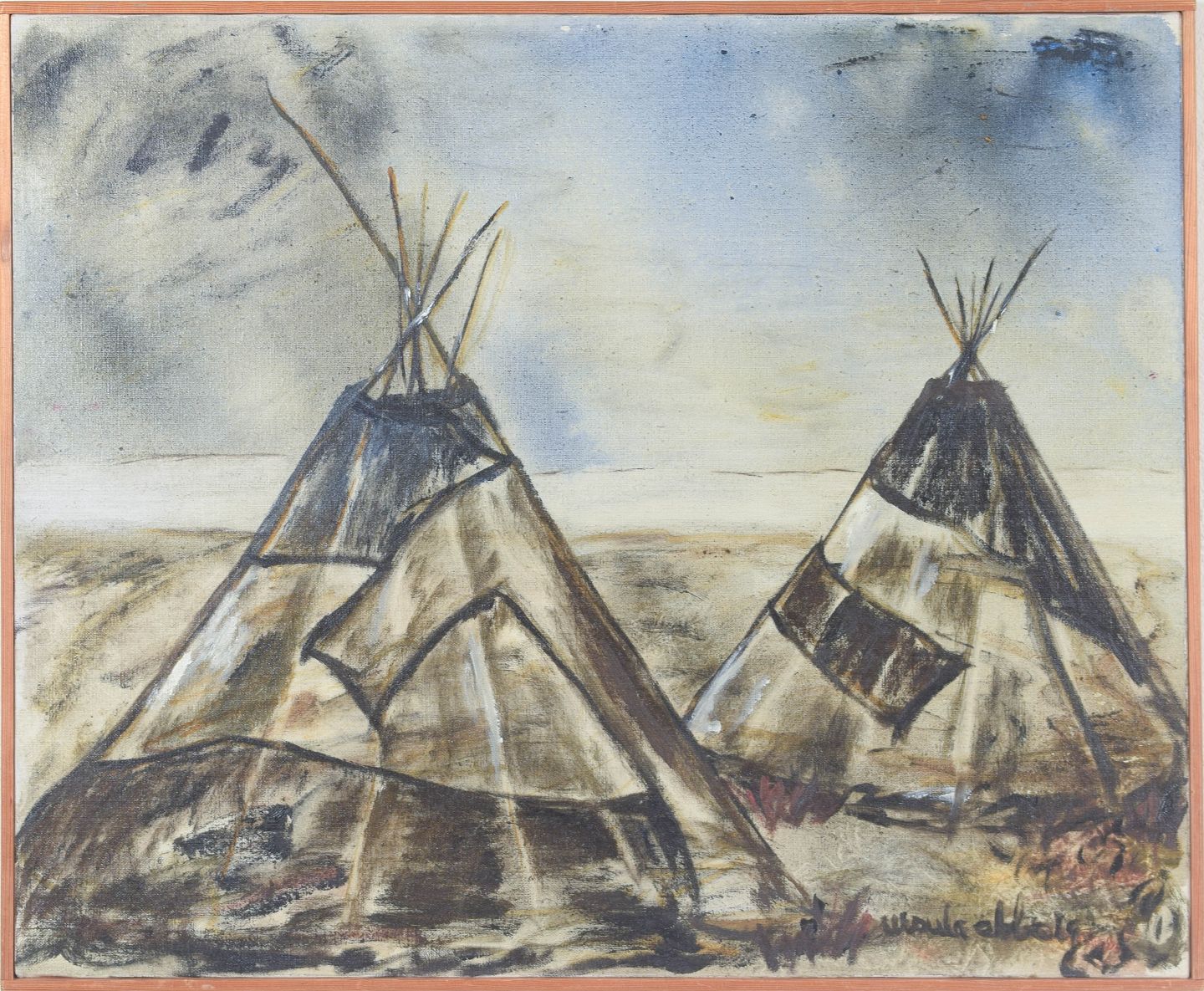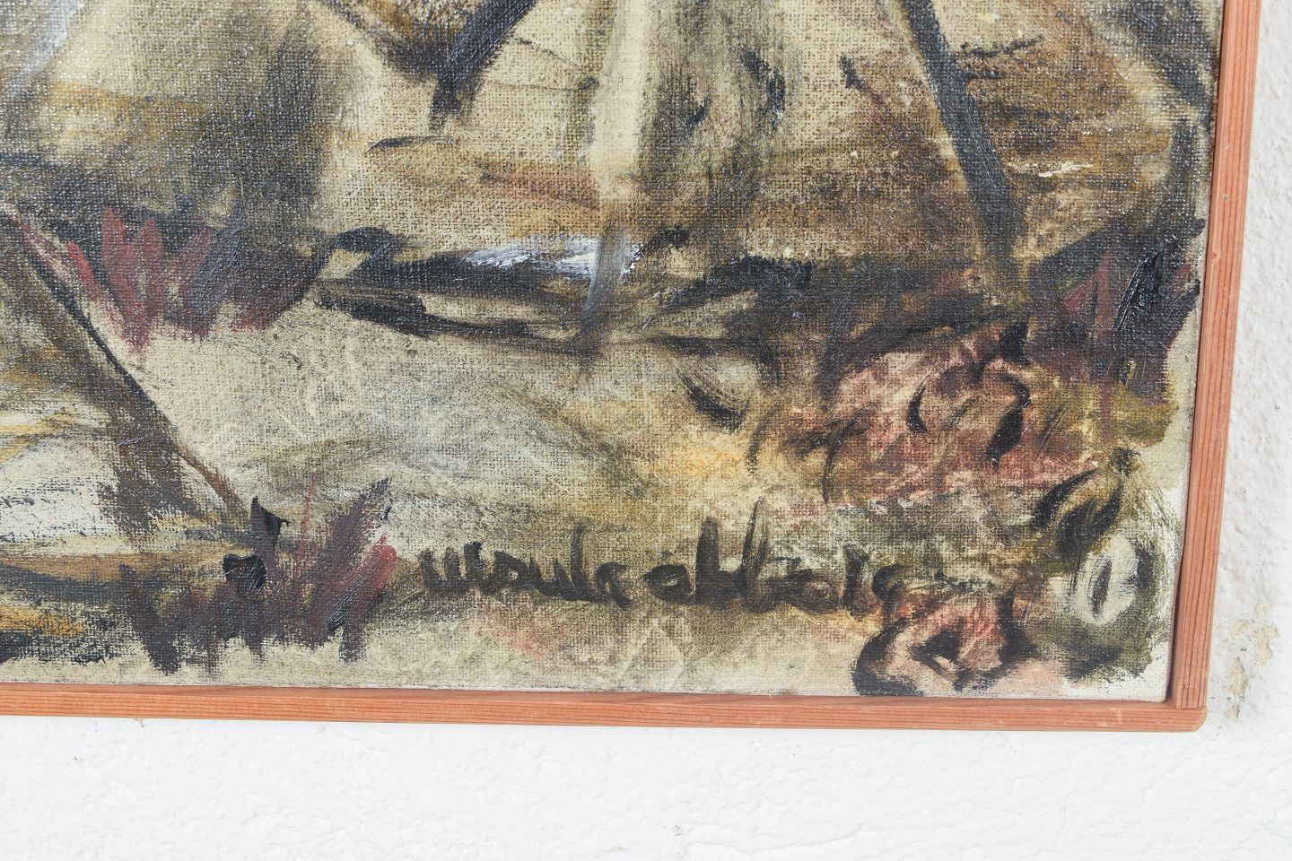 Ursula Ekberg, oljemaleri på lærred, listet svensk billedkunstner.Modernistisk landskabsmotiv fra Lappland med samiske telte gengivet i en ekspressiv og let abstraheret form. Udført i dæmpede jordfarver med fri penselføring, signeret.