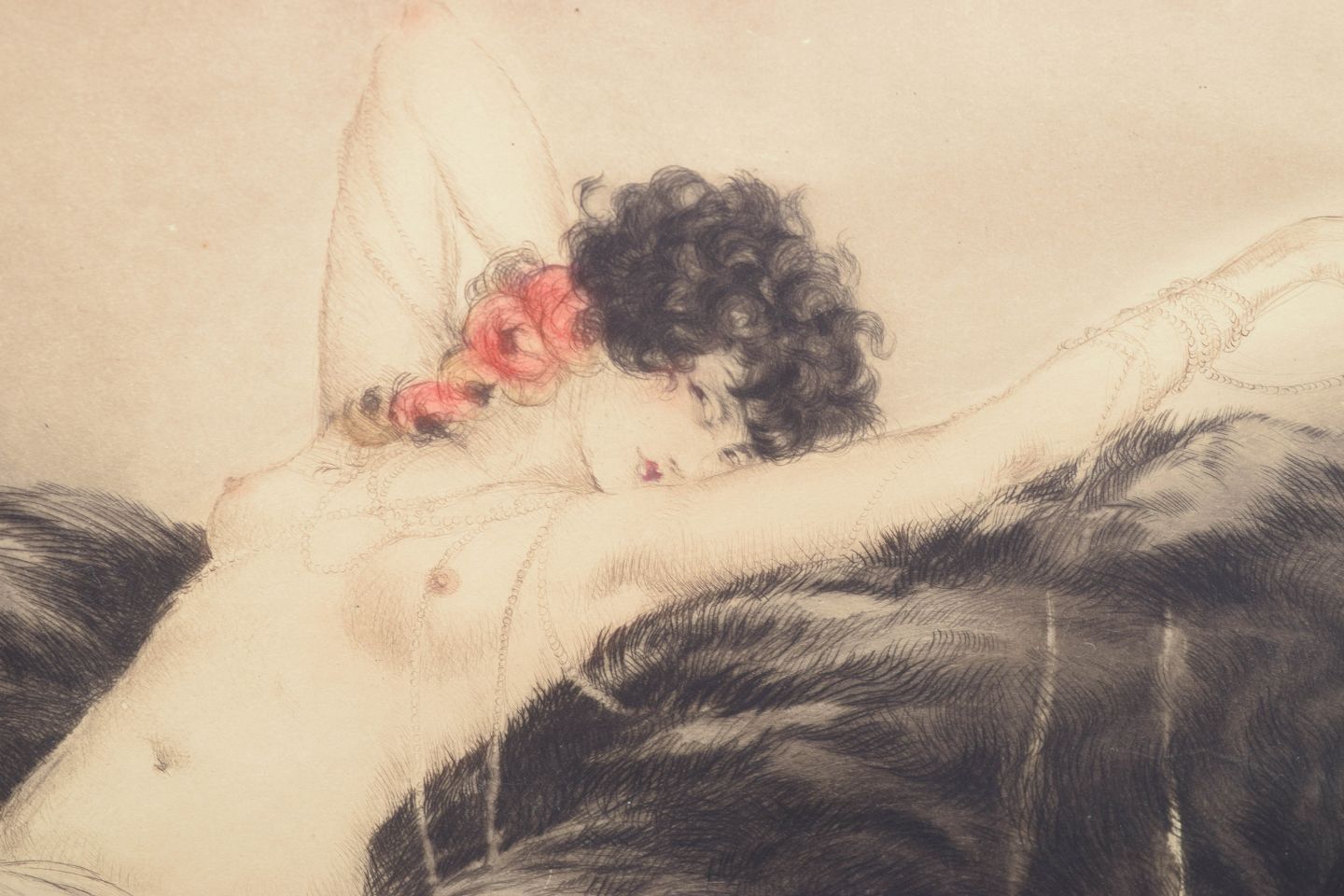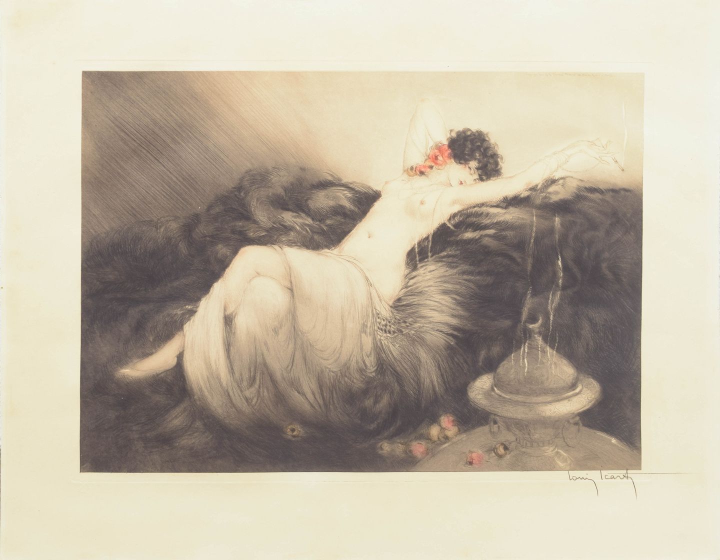 Louis Icart, radering, fransk billedkunstner. Titel : "smoke"Sanselig og stemningsfuld komposition med liggende kvindefigur udført i Icart’s karakteristiske Art Deco stil med bløde linjer og nuancerede toner. Signeret i blyant og med præget stempel i papiret.