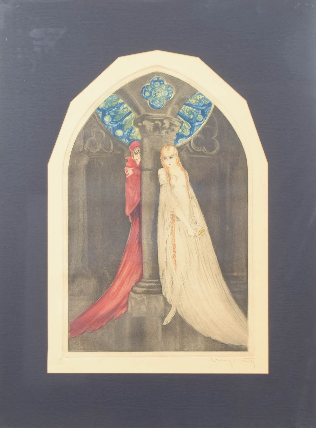 Elegant og stemningsfuld komposition med to figurer i arkitektonisk ramme, udført i Icart’s karakteristiske Art Deco stil med fine linjer og bløde farveovergange. Signeret i blyant og nummereret 70. Dateret 1928.