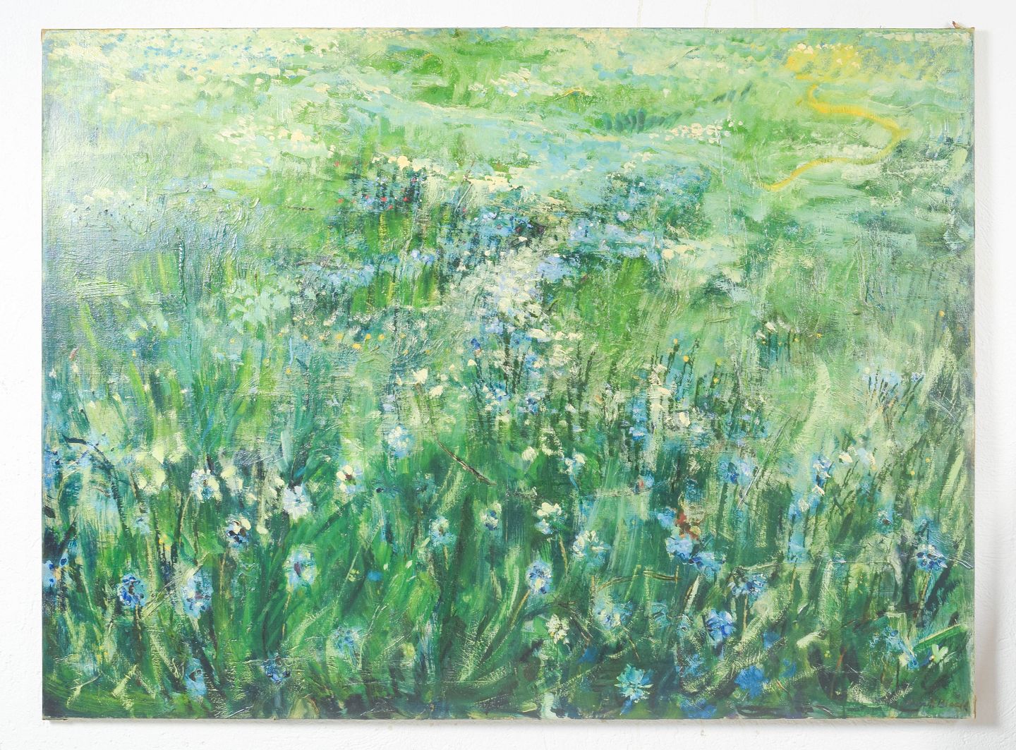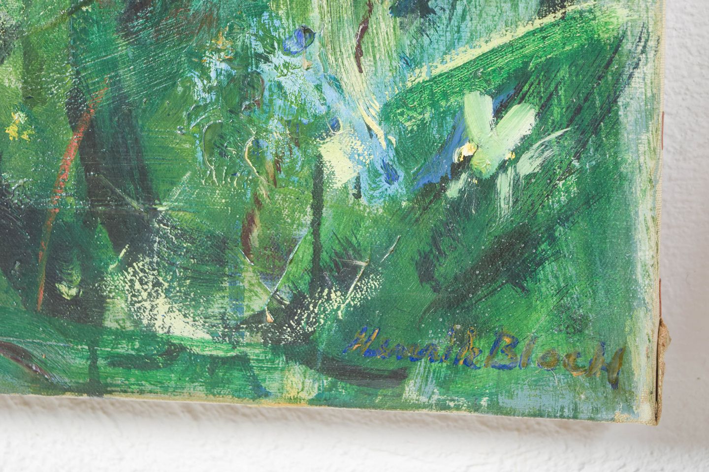 Henrik Bloch, olie på lærred, listet dansk kunstner.Ekspressivt landskab med blomstrende eng udført i en løs og farverig penselføring. Kompositionen fremstår med et let og atmosfærisk udtryk, hvor grønne og blå nuancer dominerer. Maleri af høj kvalitet. Signeret.