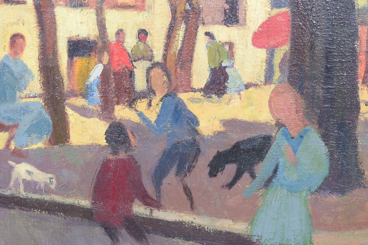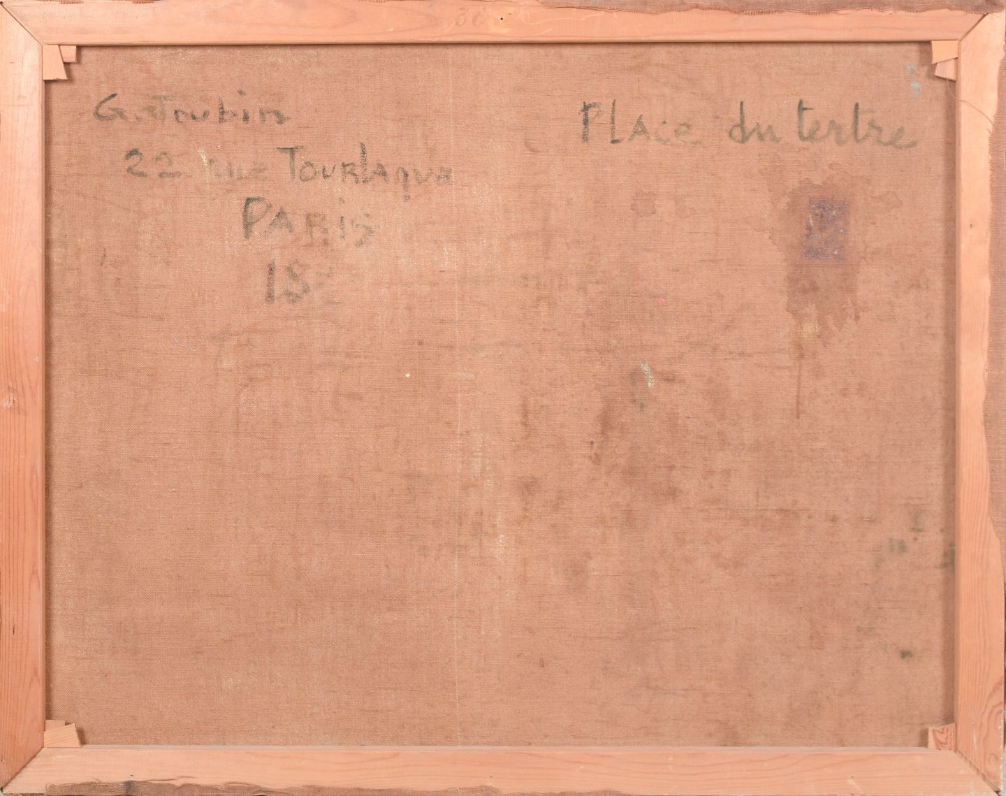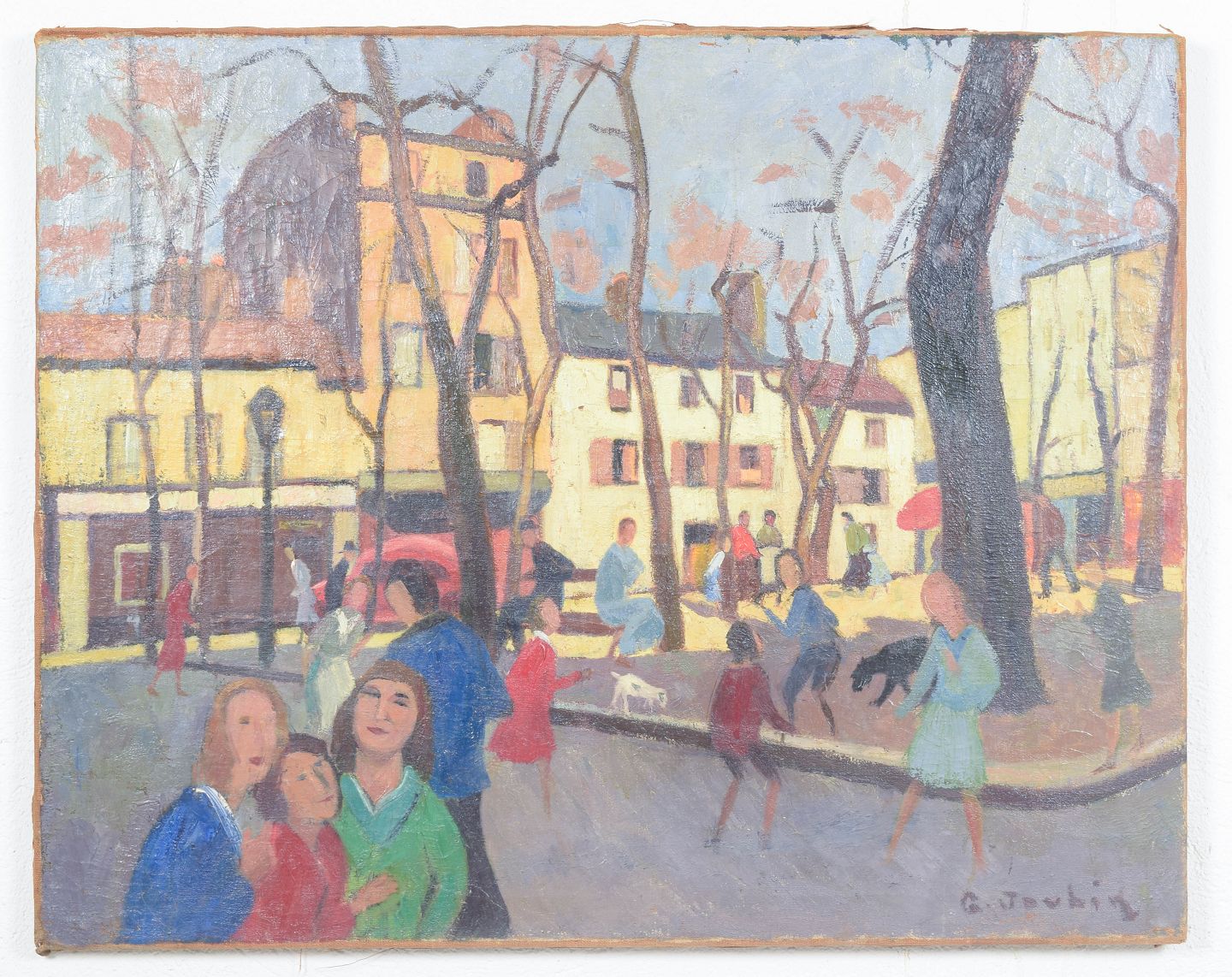 Georges Joubin, olie på lærred, fransk billedkunstner.Motiv fra Place du Tertre i Montmartre med figurer, bygninger og træer gengivet i en tidlig modernistisk stil med flade farvefelter og dekorativ komposition. Maleriet er signeret og fremstår med en klar og farverig billedopbygning karakteristisk for kunstnerens arbejde fra 1930’erne–1940’erne.