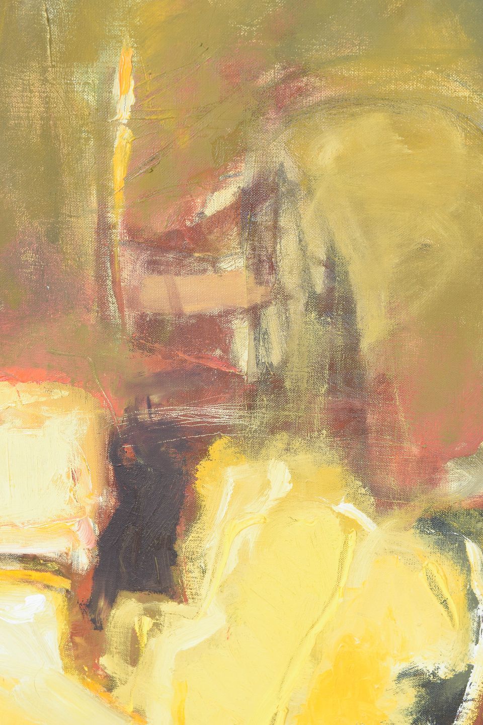Abstrakt komposition udført i olie på lærred med figurative antydninger og bløde, opløste former i varme farvetoner. Signeret.
