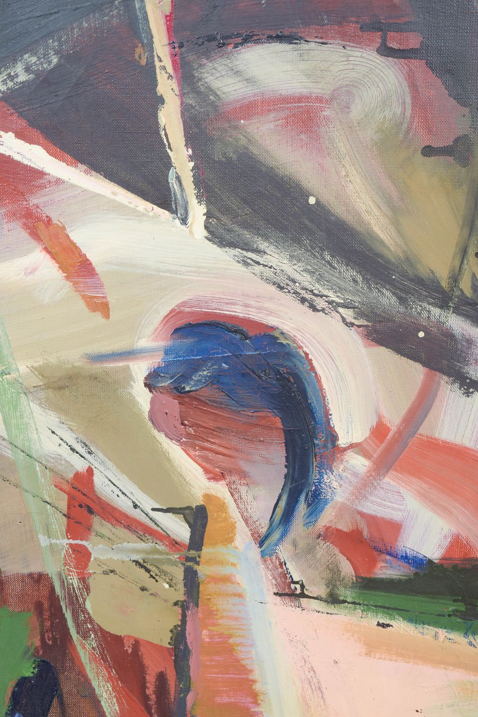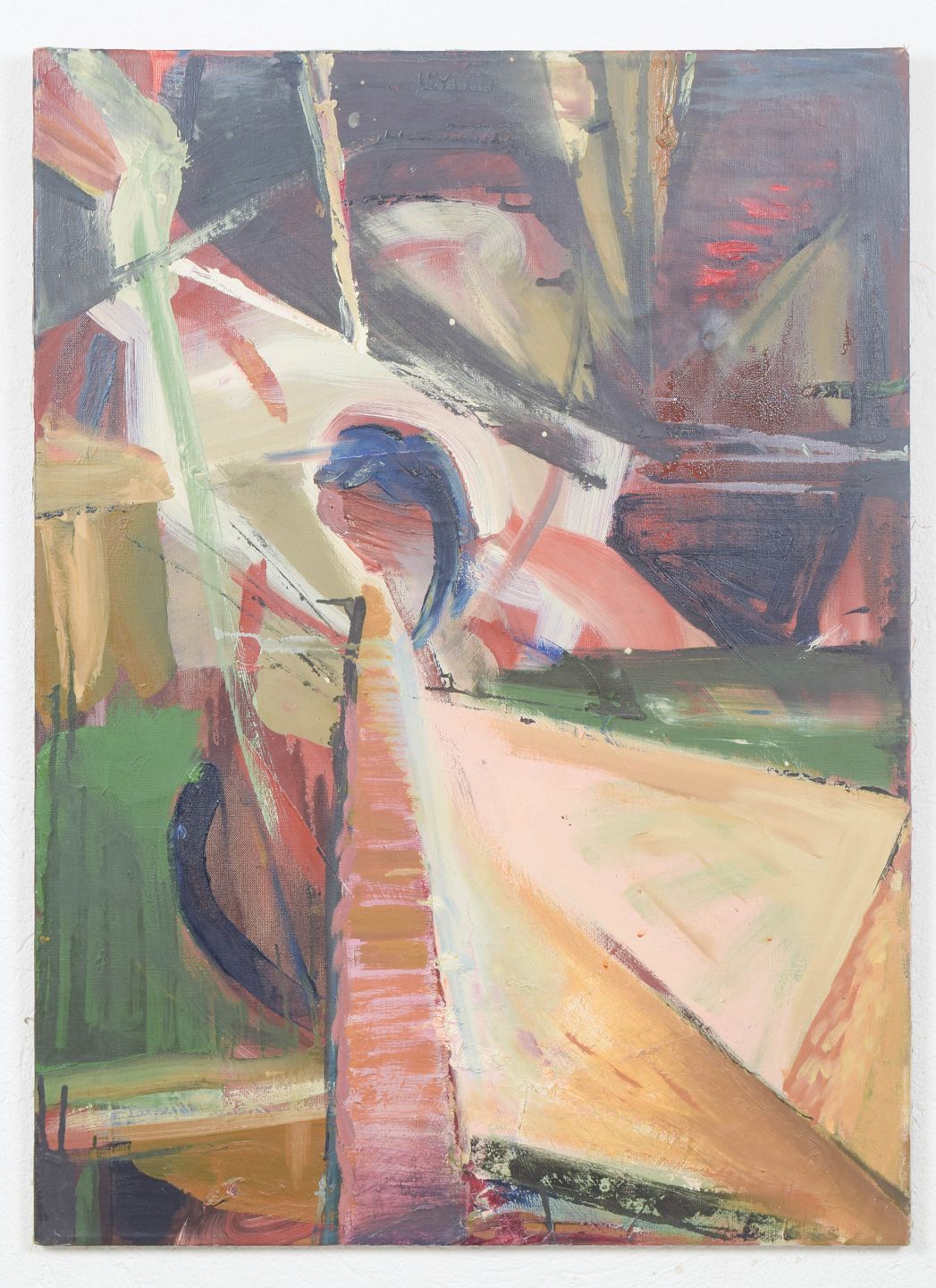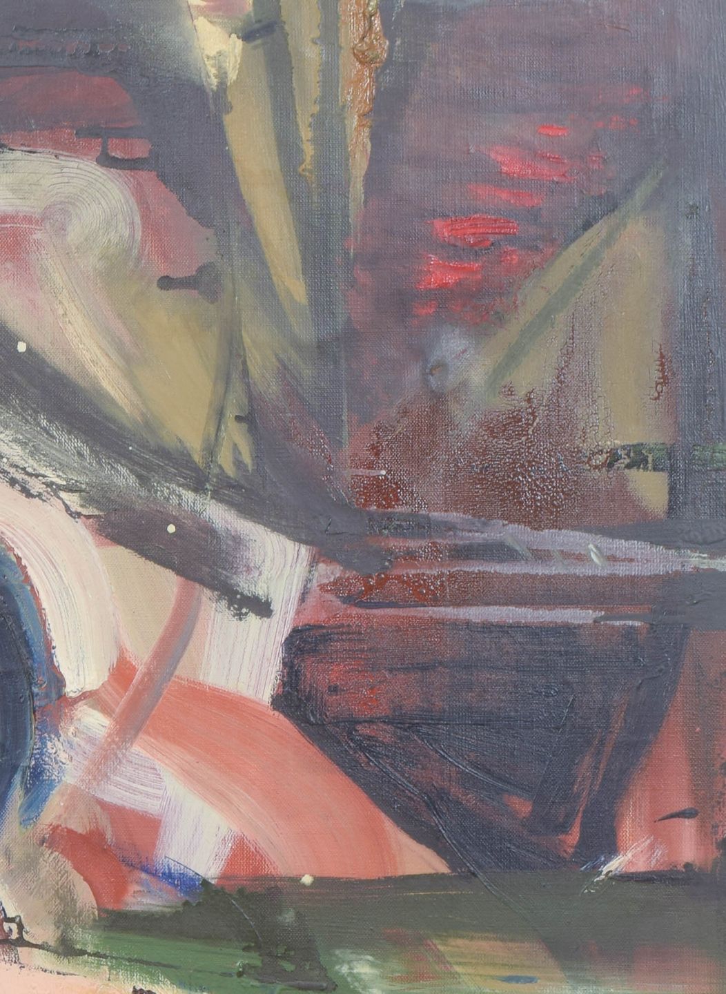 European artist, abstract composition, oil on canvas.Expressive modernist composition with dynamic brushwork and fragmented geometric forms rendered in a vivid palette. The structure suggests architectural elements and spatial tension, executed with a free and gestural approach. Oil on canvas, unsigned.