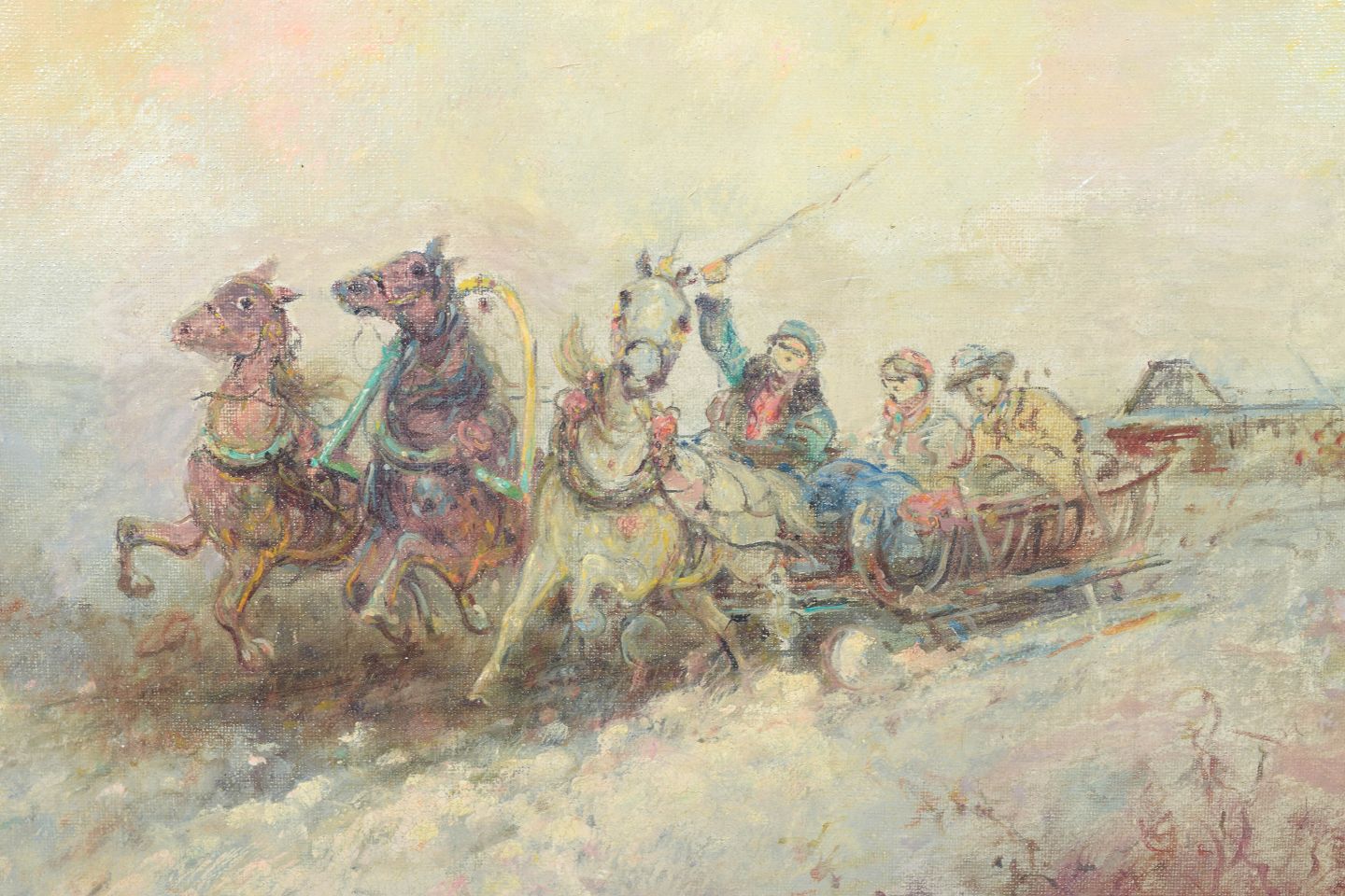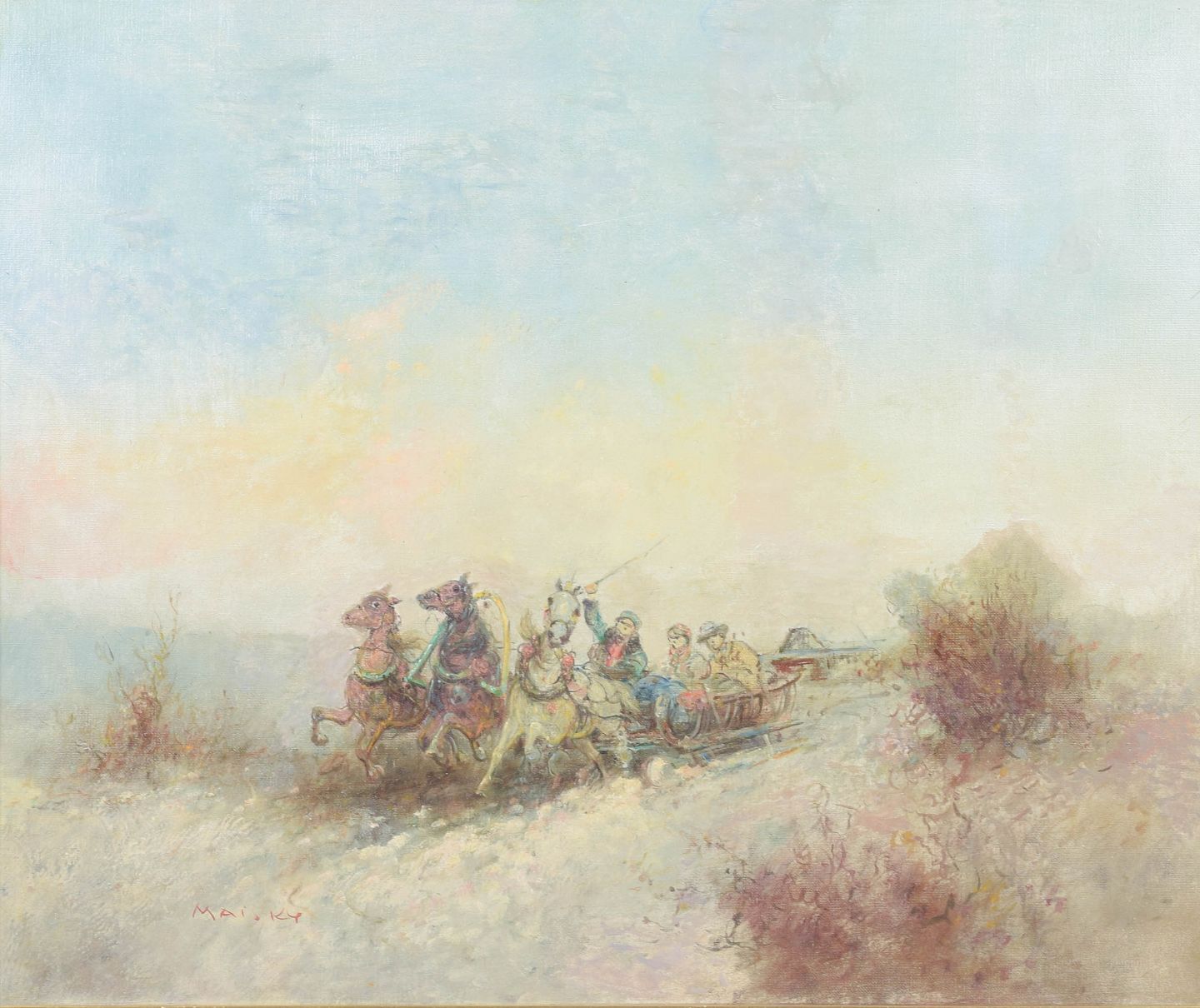 Fedor Maisky, oliemaleri på lærred, østrigsk kunstner.Stemningsfuld komposition med hestetrukken vogn og figurer i et åbent landskab, udført i en lys og let koloristisk palet med bløde overgange og atmosfærisk dybde. Signeret.