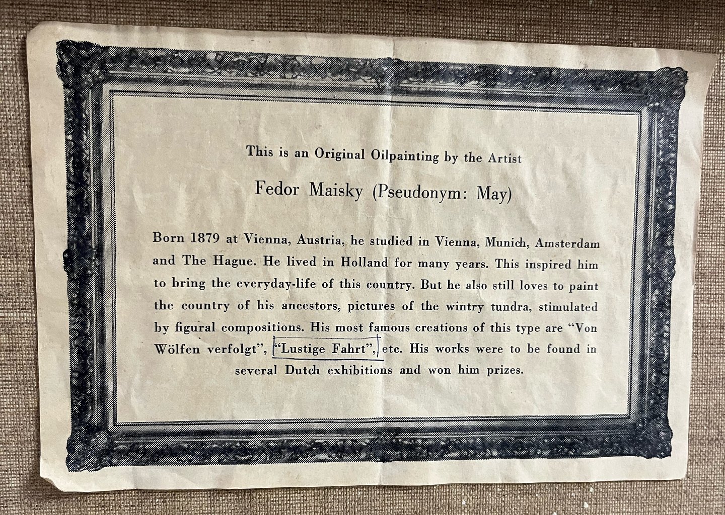 Sedor Maisky (født 1879) var en østrigsk maler kendt for sine figurative og ofte fortællende kompositioner, hvor landskaber og menneskelige aktiviteter indgår i en harmonisk helhed. Hans værker er præget af en let og atmosfærisk penselføring med fokus på lys, bevægelse og stemning, og han arbejdede inden for en tradition, der kombinerer naturalisme med en mere impressionistisk farveholdning.