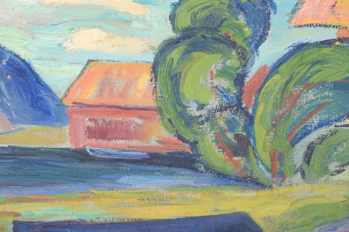 Farverigt modernistisk landskab med stiliserede træformer og arkitektoniske elementer, udført i en fri og ekspressiv penselføring. Signeret og dateret 1945.