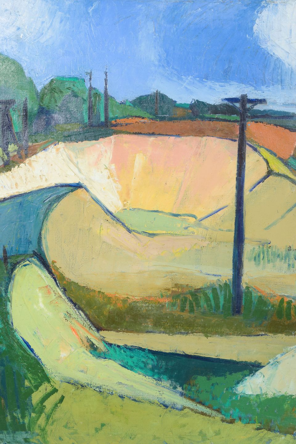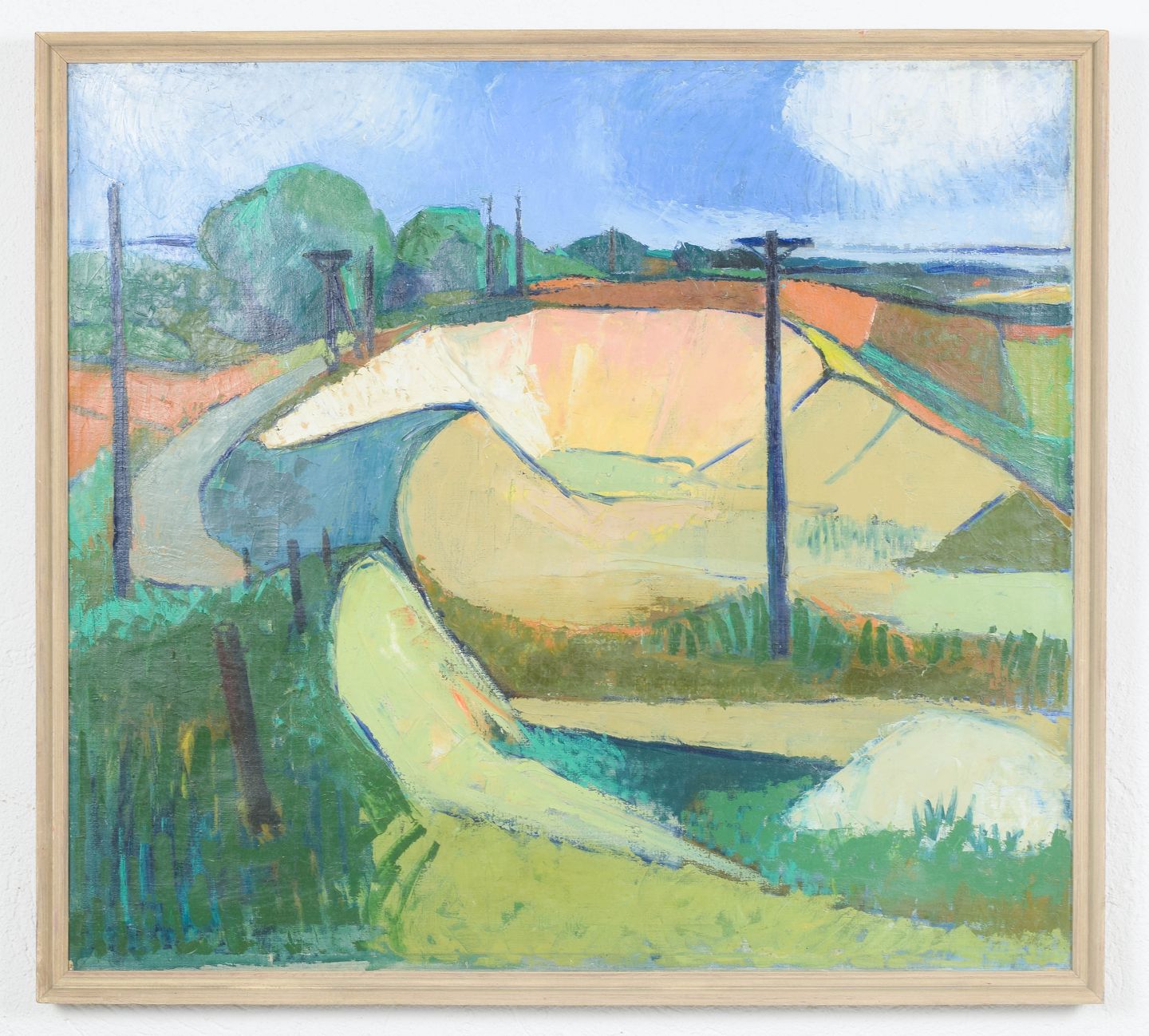 Dansk kunstner, tidlig modernisme, oliemaleri på lærred.Farverigt landskabsmotiv udført i en tidlig modernistisk stil med bløde, organiske former og forenklede flader. Kompositionen er præget af en lyrisk tilgang til naturen med marker, bakker og telegrafpæle gengivet i en dekorativ og næsten abstraheret form. Udført i olie på lærred, usigneret.