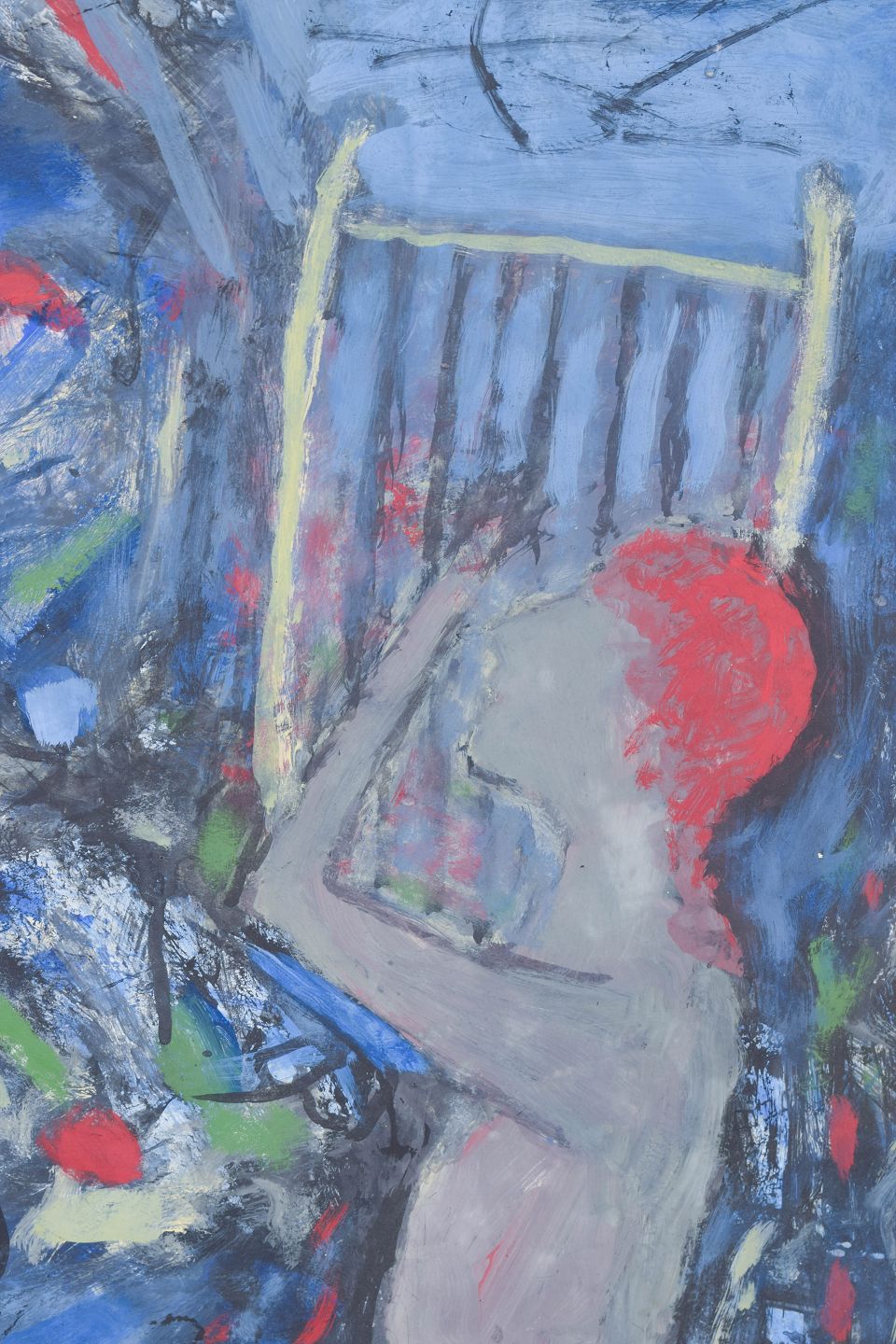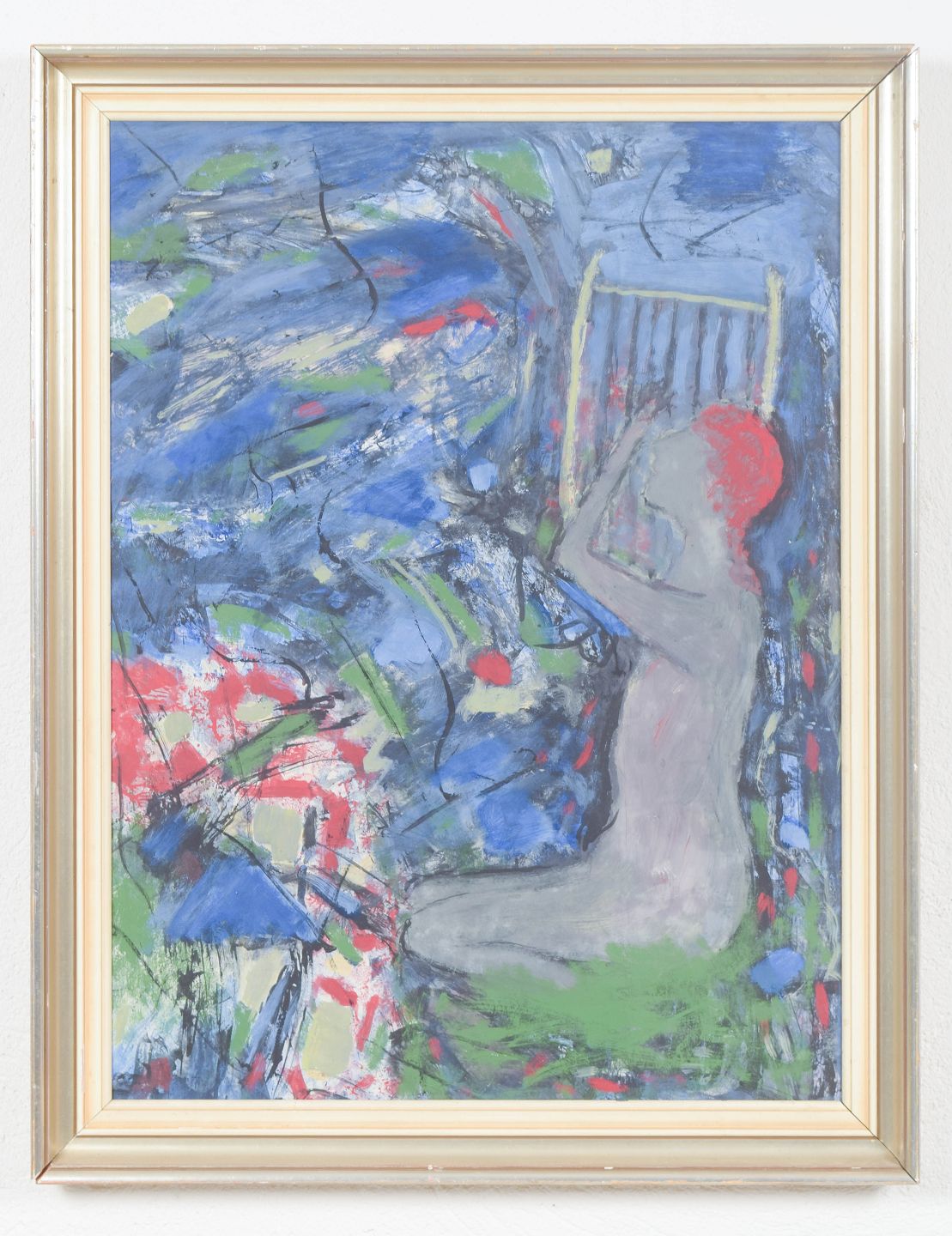 Abstrakt komposition med dynamisk penselføring og lagdelte farvefelter i blå, grønne og røde nuancer, udført i olie på plade. Usigneret.