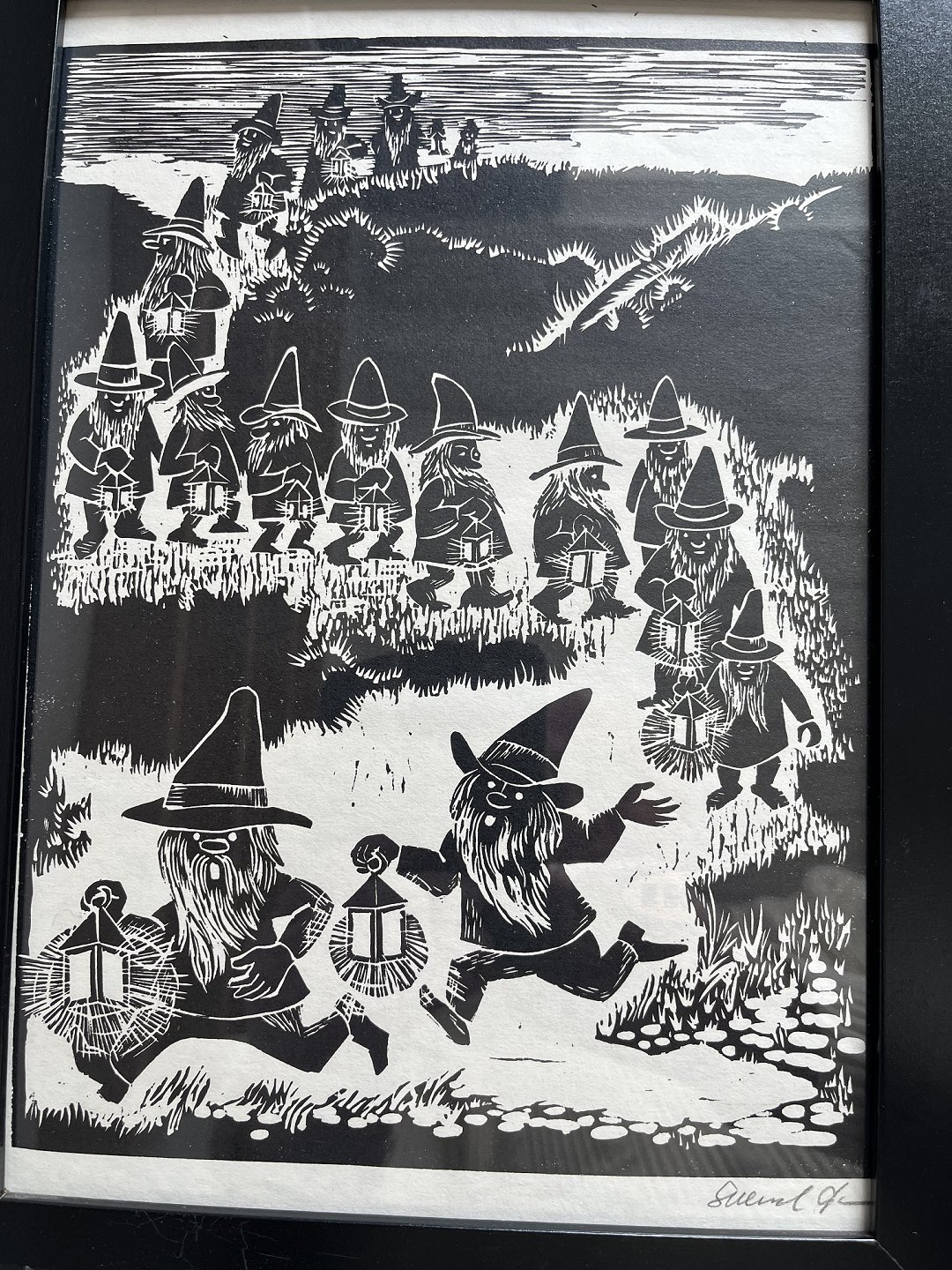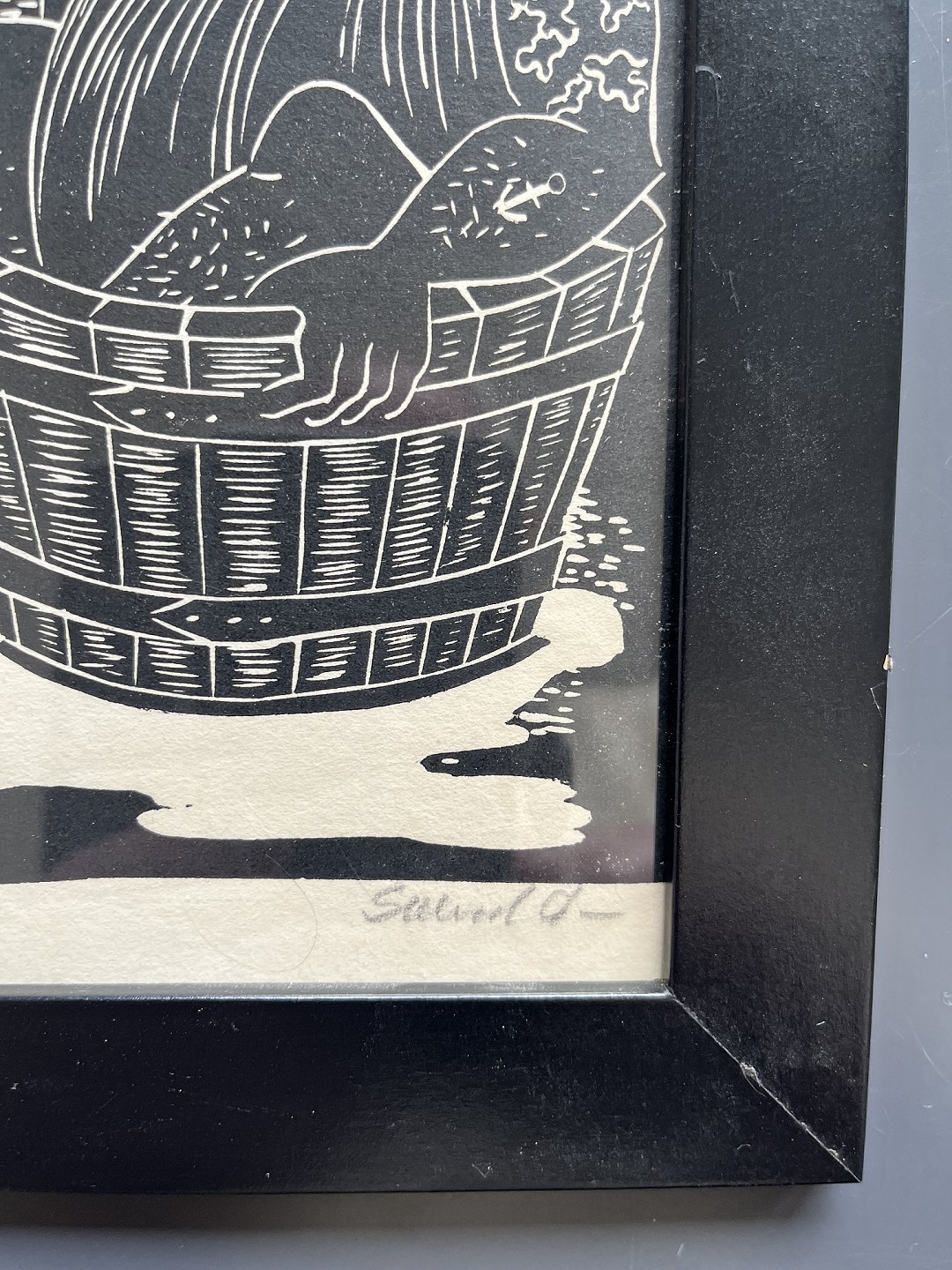 2 linoleumssnit af Svend P. Jørensen 1973.