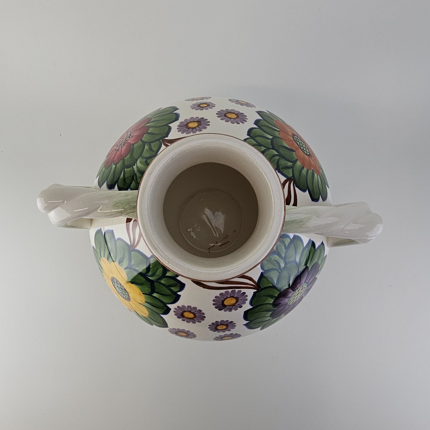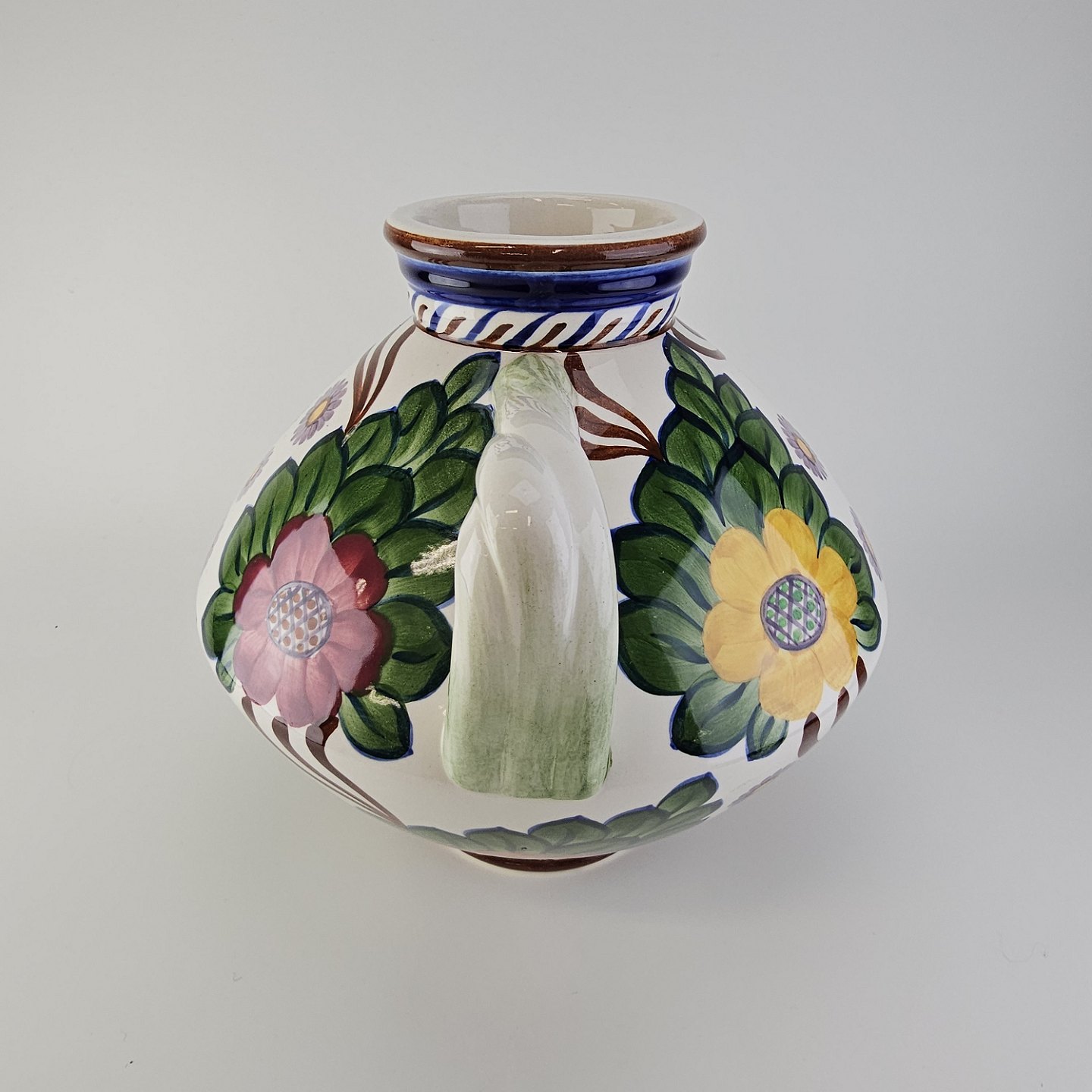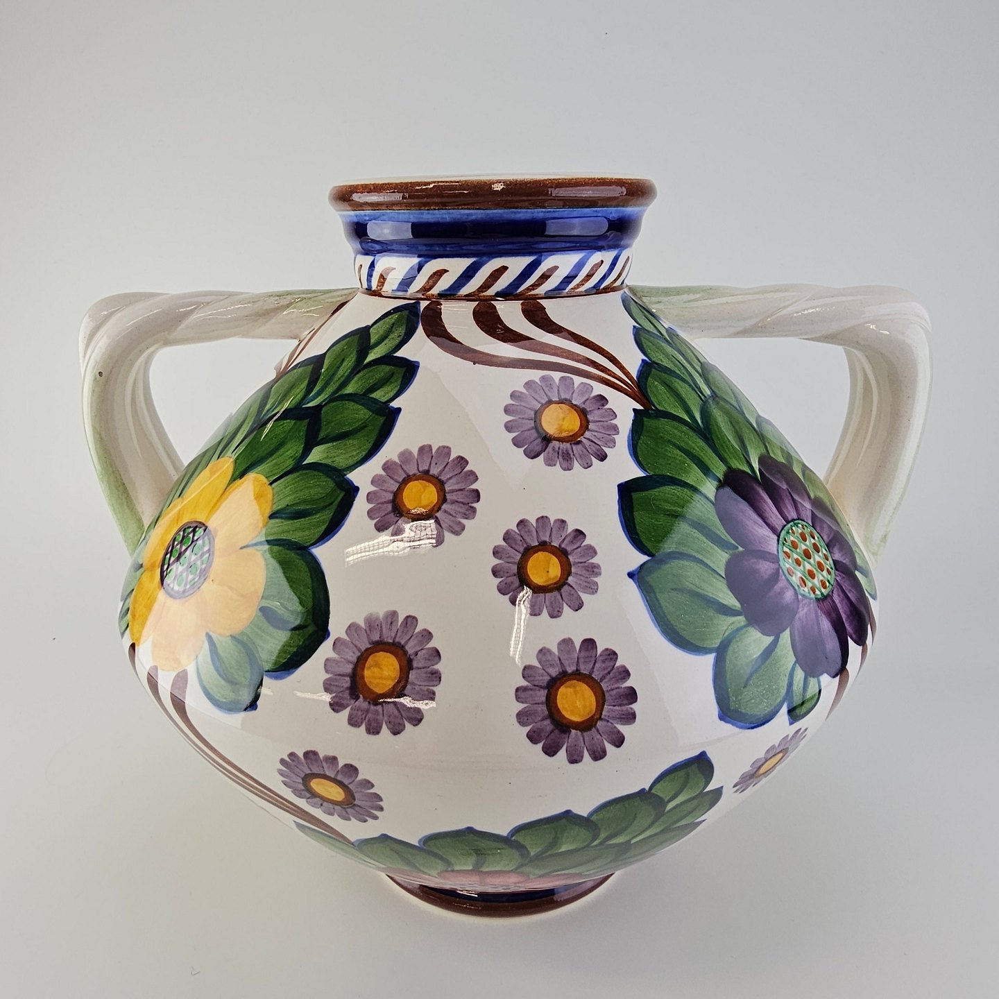 Vase med to hanke i fajance dekoreret med farverigt blomstermotivDesign Harald Slott-Møller